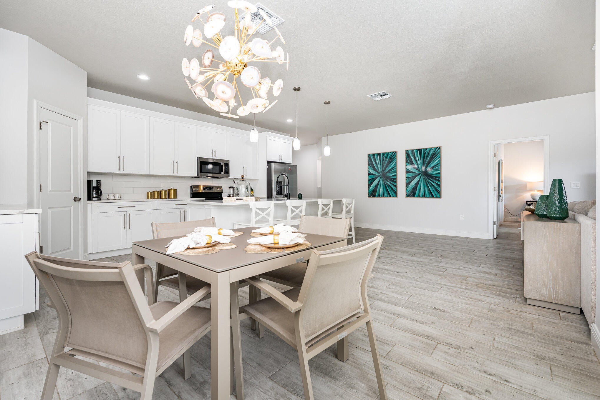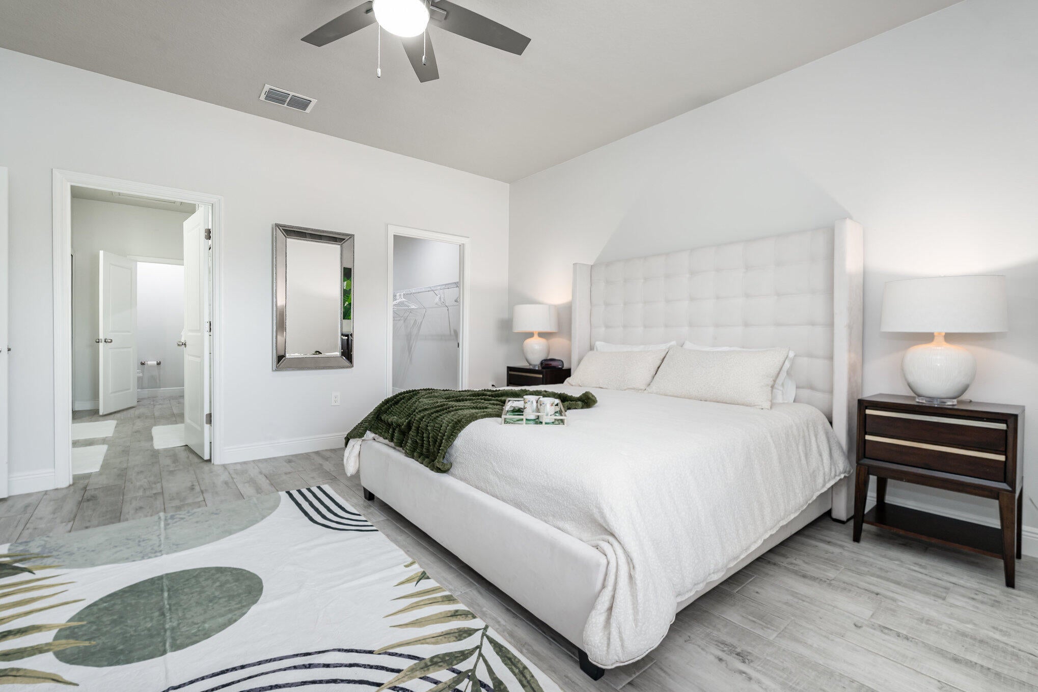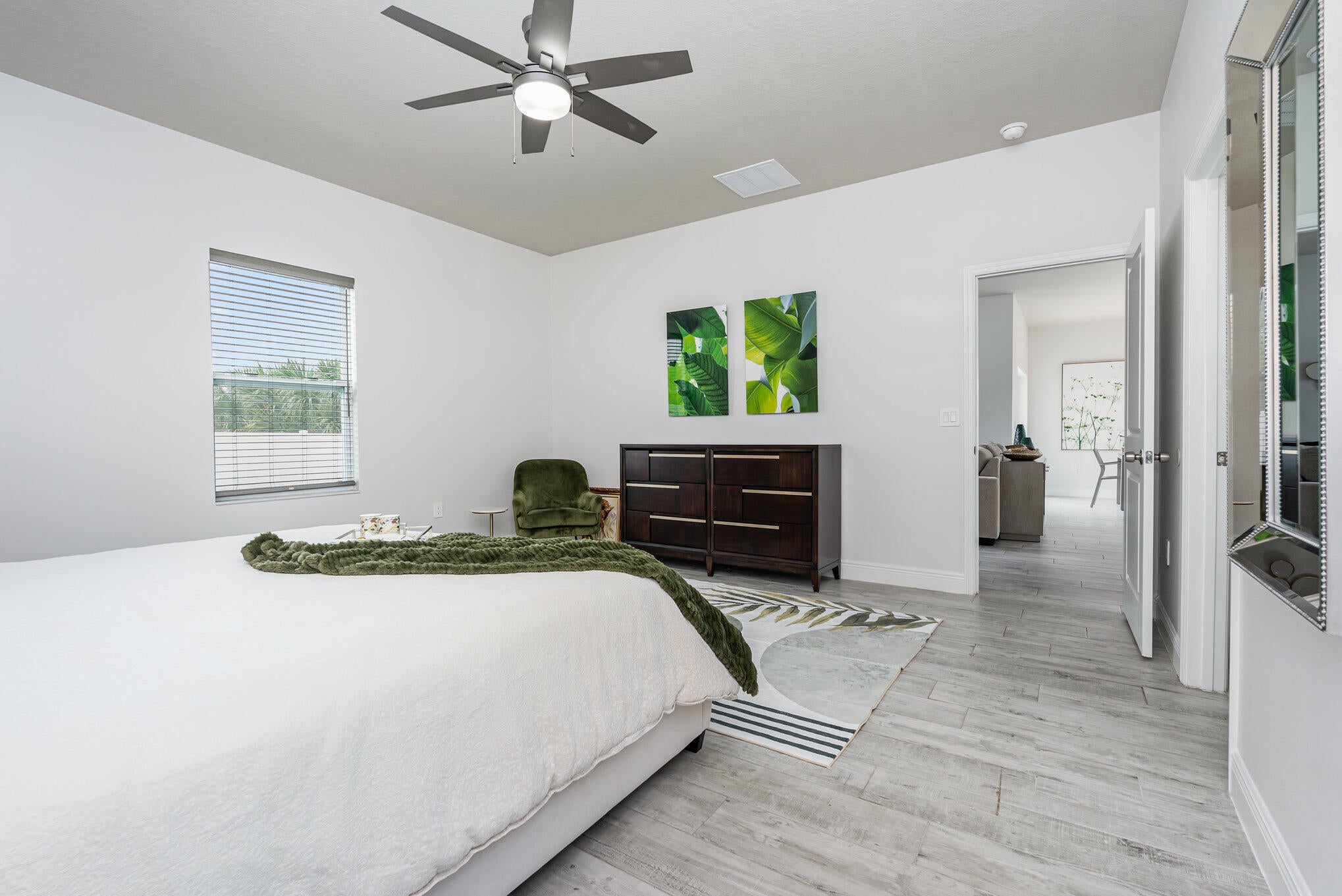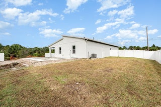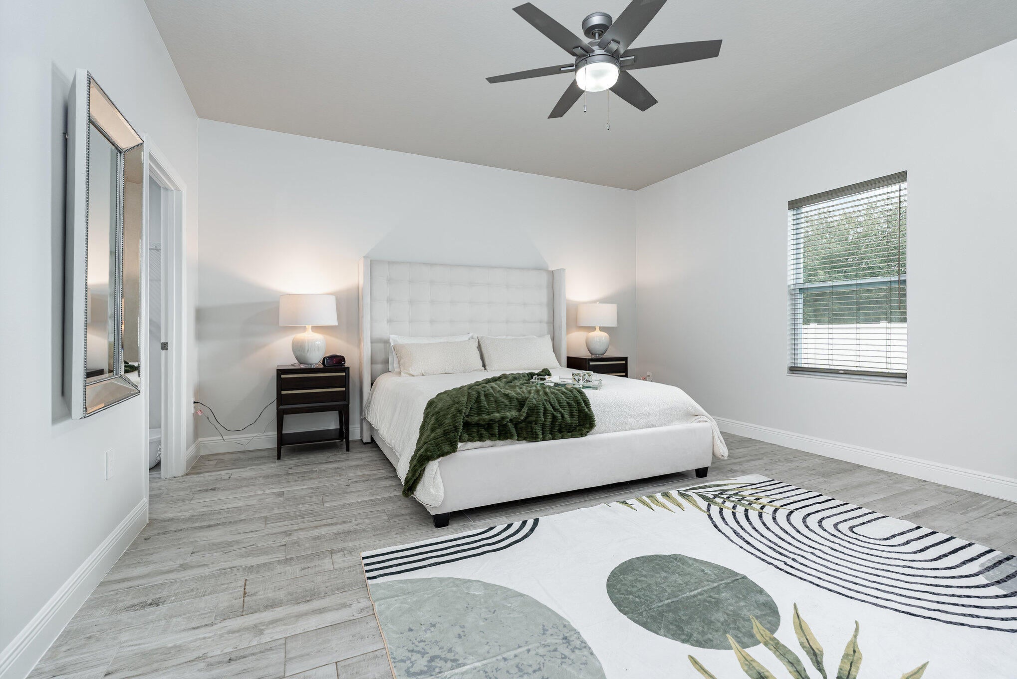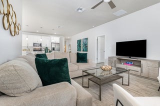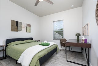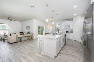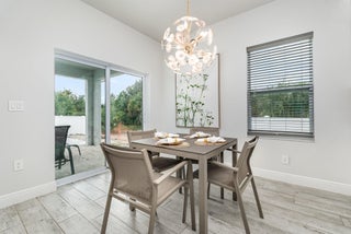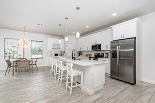 Beautiful 4-bedroom, 2-bath modern home featuring high-end finishes and an open-concept floor plan. Interior offers 10-foot ceilings and wood-plank tile flooring throughout. The kitchen includes white cabinetry with wine rack, quartz countertops, and stainless steel appliances, with pendant and recessed lighting providing a bright, open feel. The primary suite features a large walk-in shower with glass enclosure and dual shower heads, double sinks, and ample counter space. Both bathrooms include custom vanities and quartz countertops. Spacious walk-in closet with access from both the bedroom and bathroom. Additional features include impact windows and doors, new metal roof, new A/C, and new vinyl fence with gated access. Property shows like a model home.