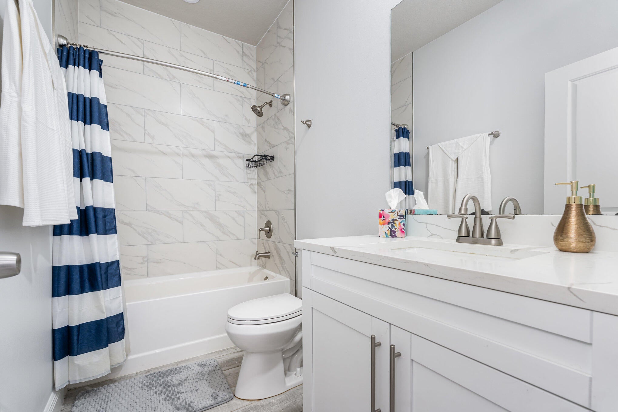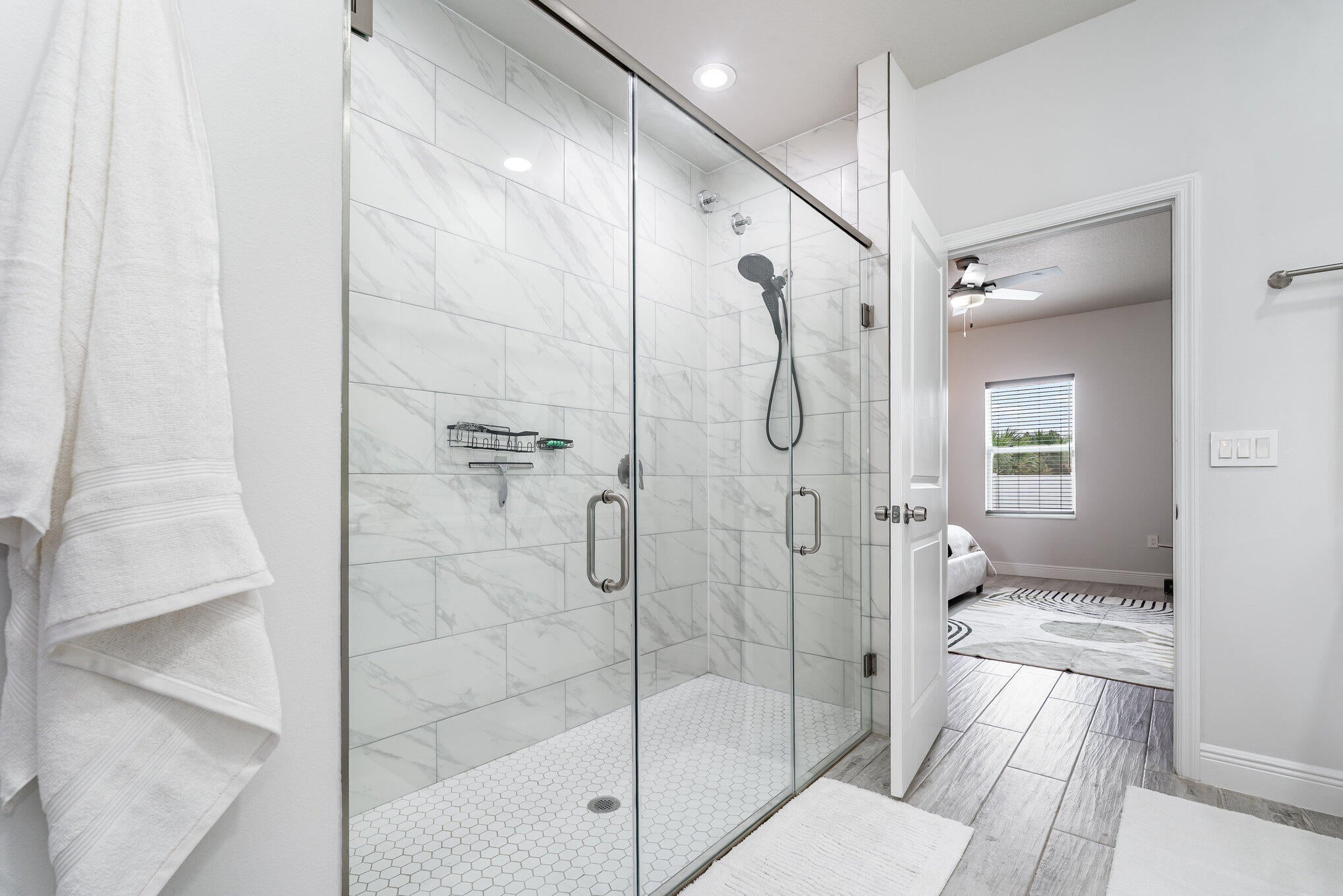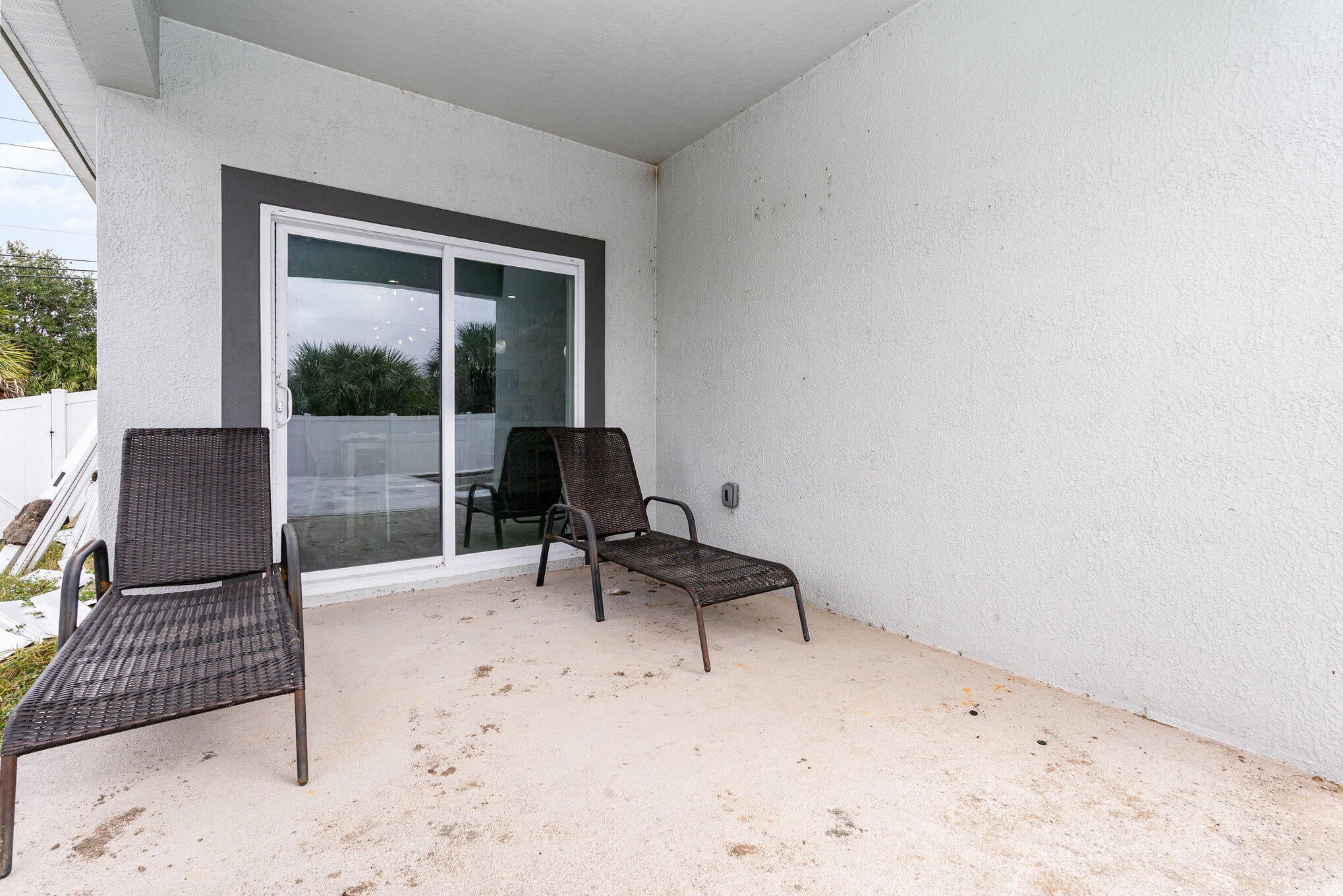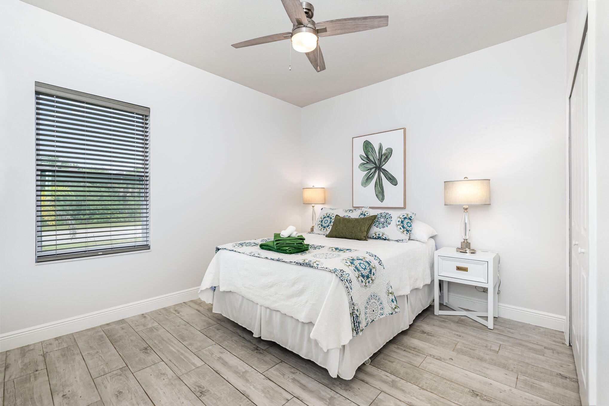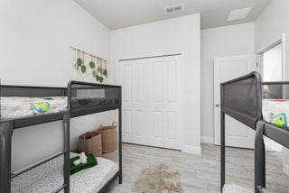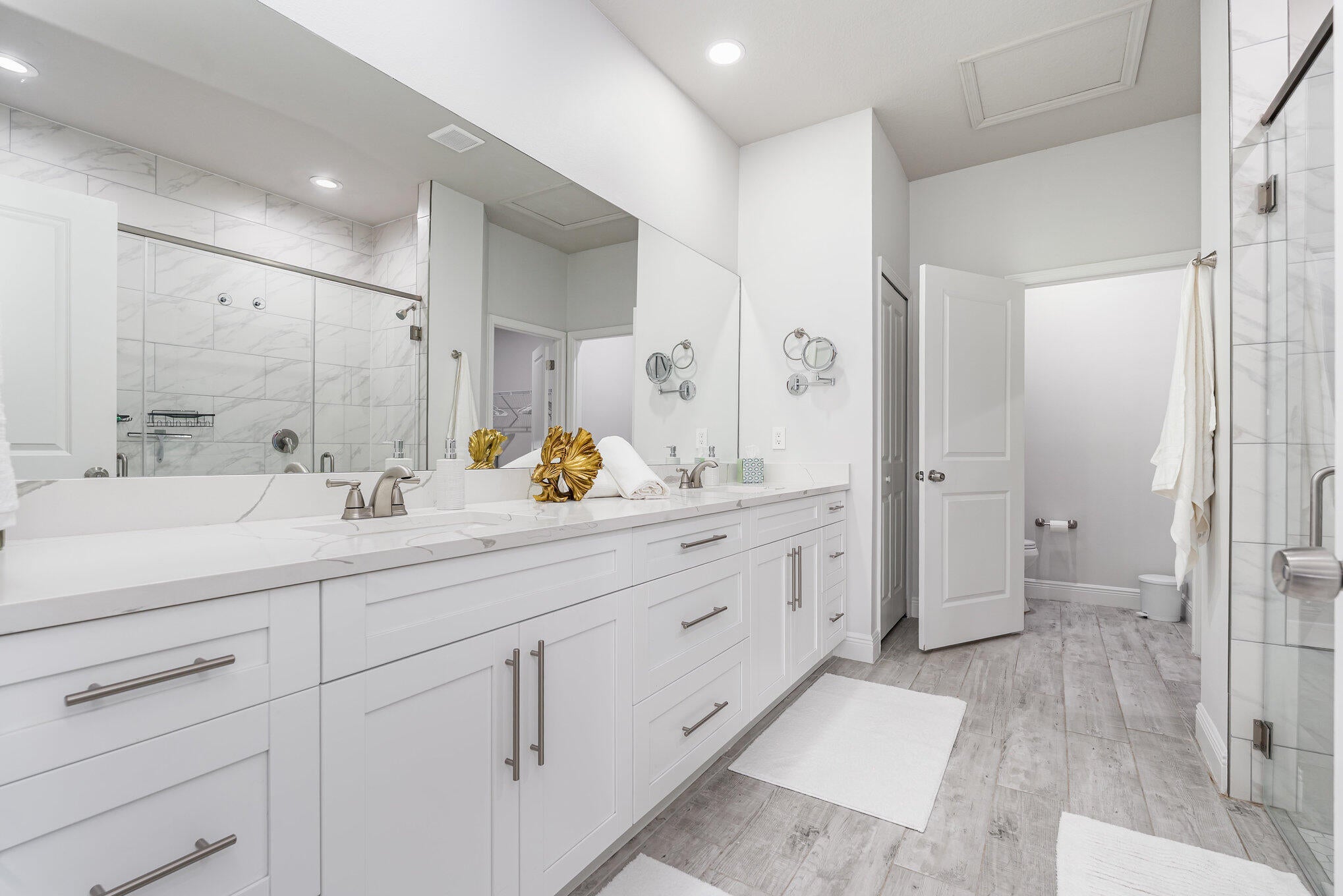 Beautiful 4-bedroom, 2-bath modern home featuring high-end finishes and an open-concept floor plan. Interior offers 10-foot ceilings and wood-plank tile flooring throughout. The kitchen includes white cabinetry with wine rack, quartz countertops, and stainless steel appliances, with pendant and recessed lighting providing a bright, open feel. The primary suite features a large walk-in shower with glass enclosure and dual shower heads, double sinks, and ample counter space. Both bathrooms include custom vanities and quartz countertops. Spacious walk-in closet with access from both the bedroom and bathroom. Additional features include impact windows and doors, new metal roof, new A/C, and new vinyl fence with gated access. Property shows like a model home.