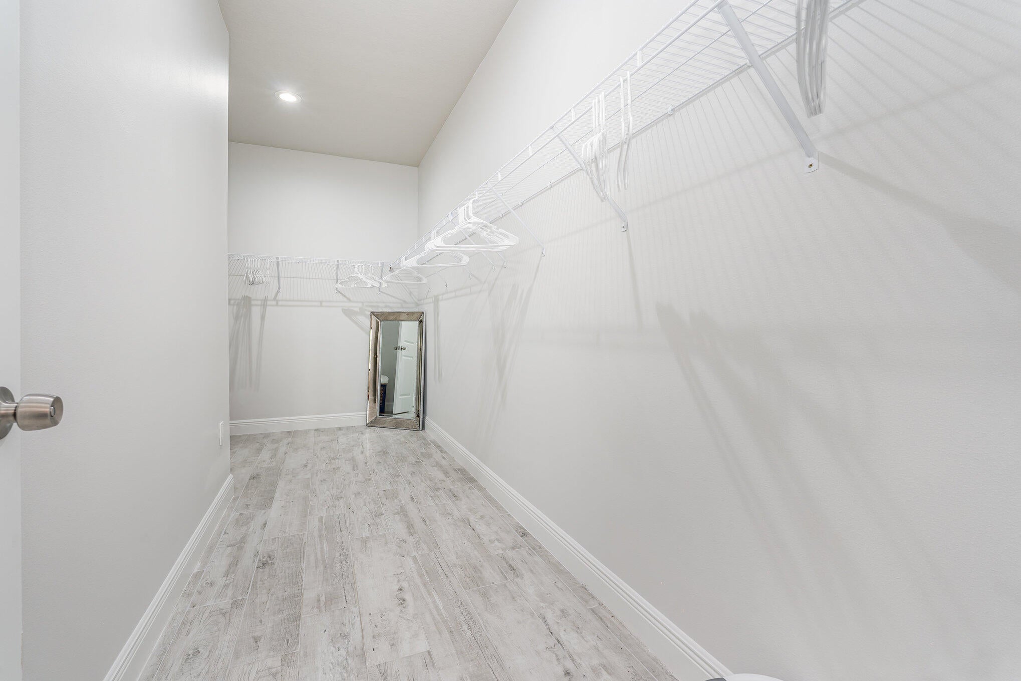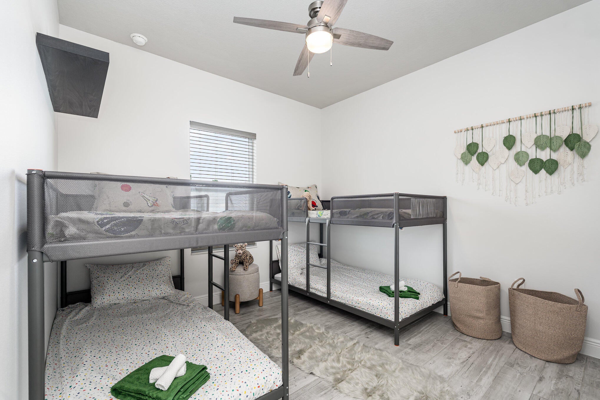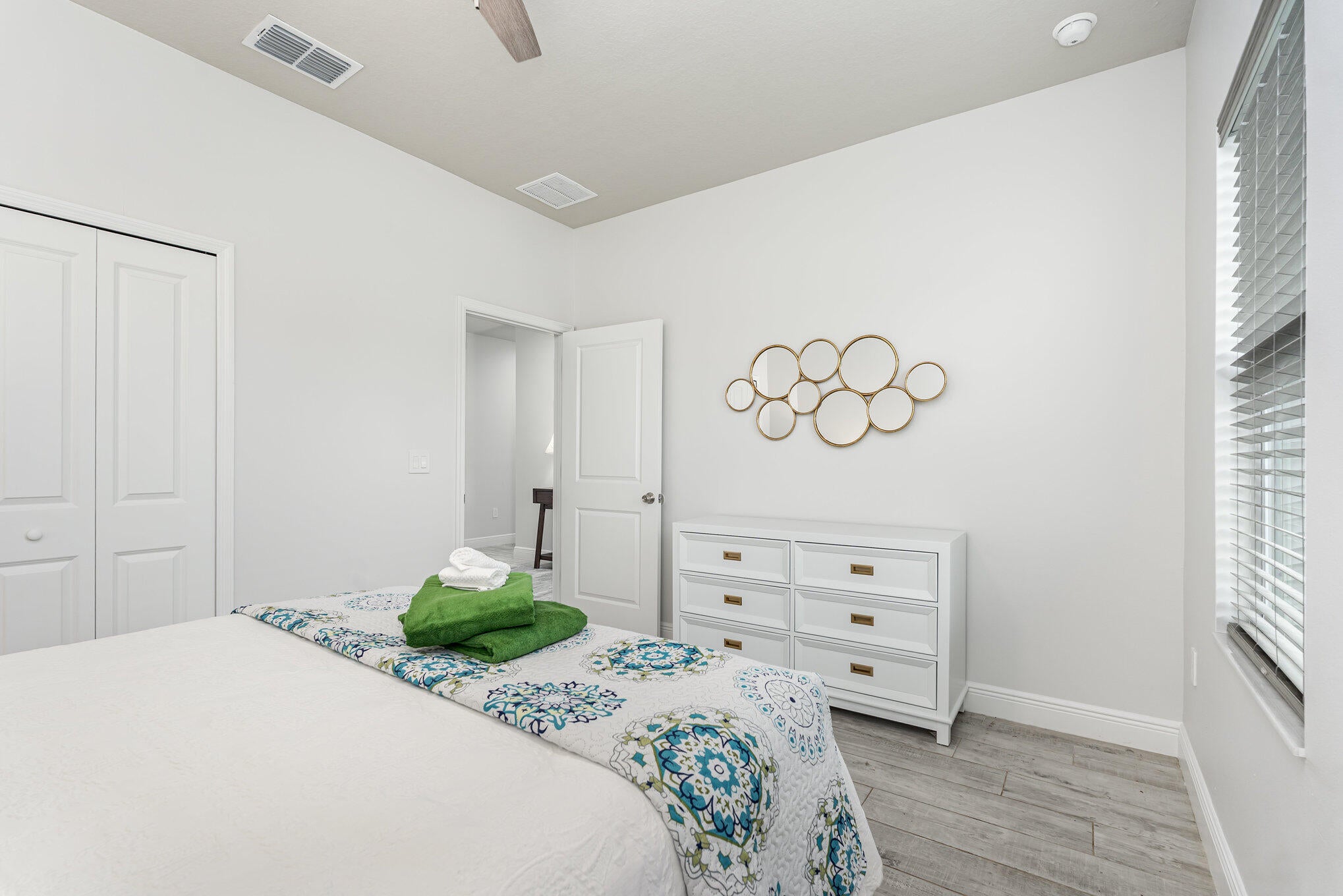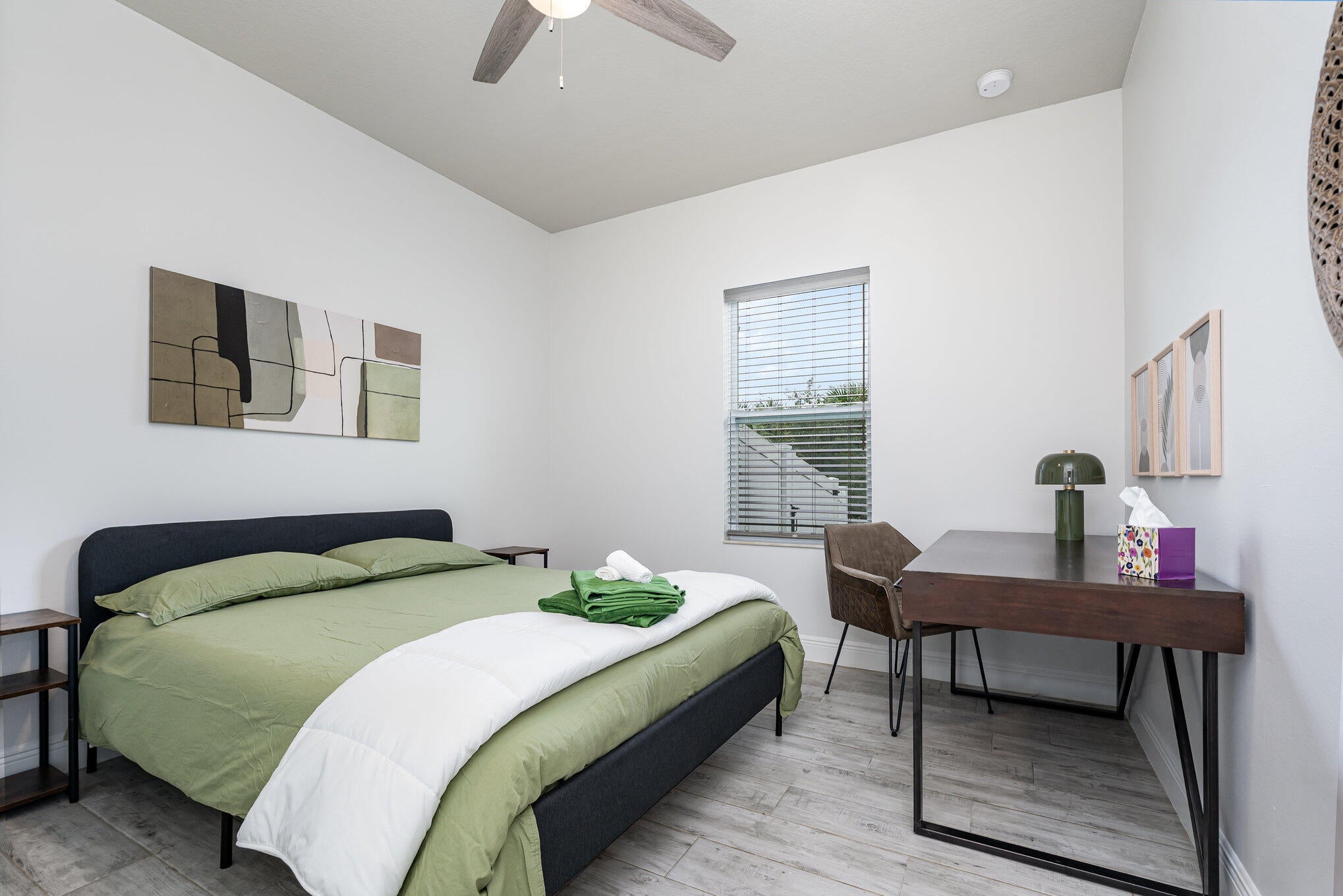 Beautiful 4-bedroom, 2-bath modern home featuring high-end finishes and an open-concept floor plan. Interior offers 10-foot ceilings and wood-plank tile flooring throughout. The kitchen includes white cabinetry with wine rack, quartz countertops, and stainless steel appliances, with pendant and recessed lighting providing a bright, open feel. The primary suite features a large walk-in shower with glass enclosure and dual shower heads, double sinks, and ample counter space. Both bathrooms include custom vanities and quartz countertops. Spacious walk-in closet with access from both the bedroom and bathroom. Additional features include impact windows and doors, new metal roof, new A/C, and new vinyl fence with gated access. Property shows like a model home.