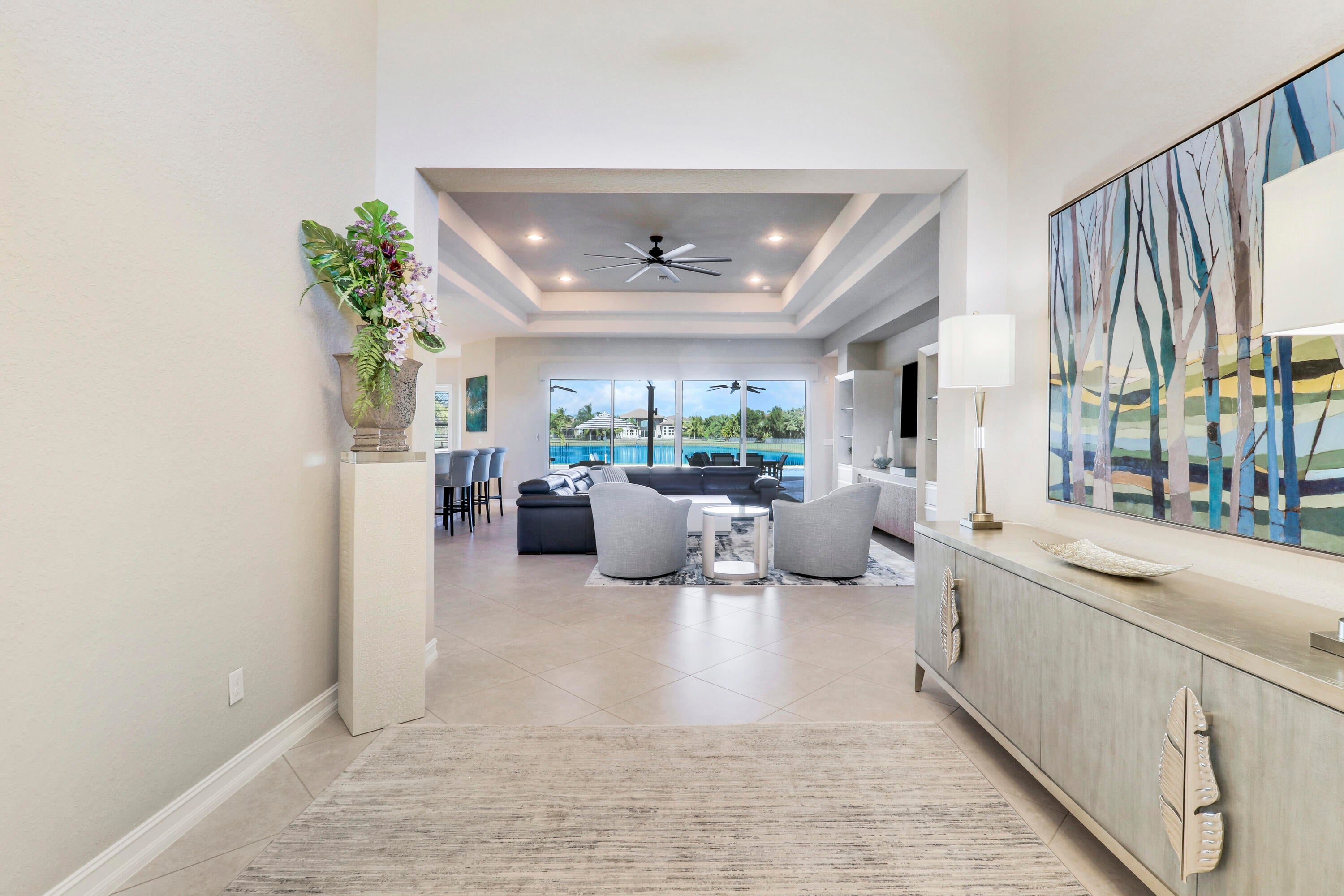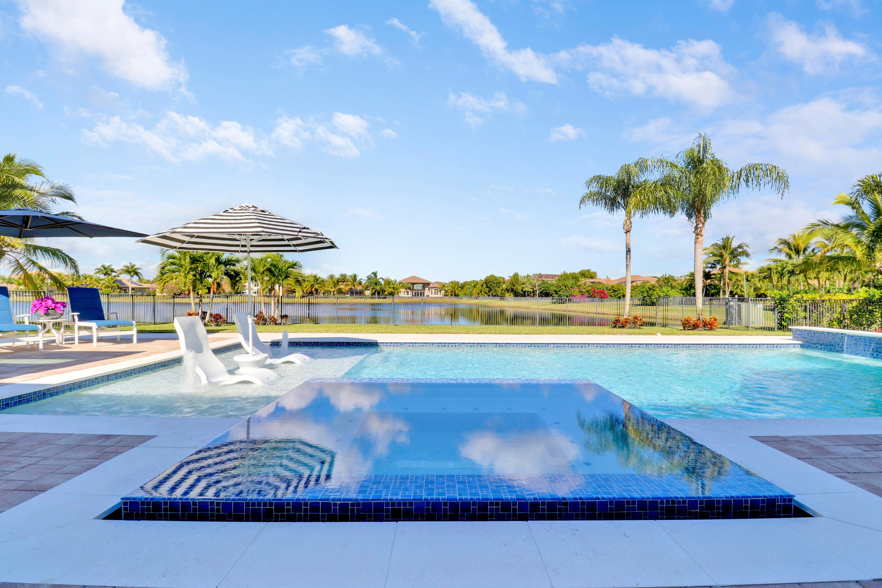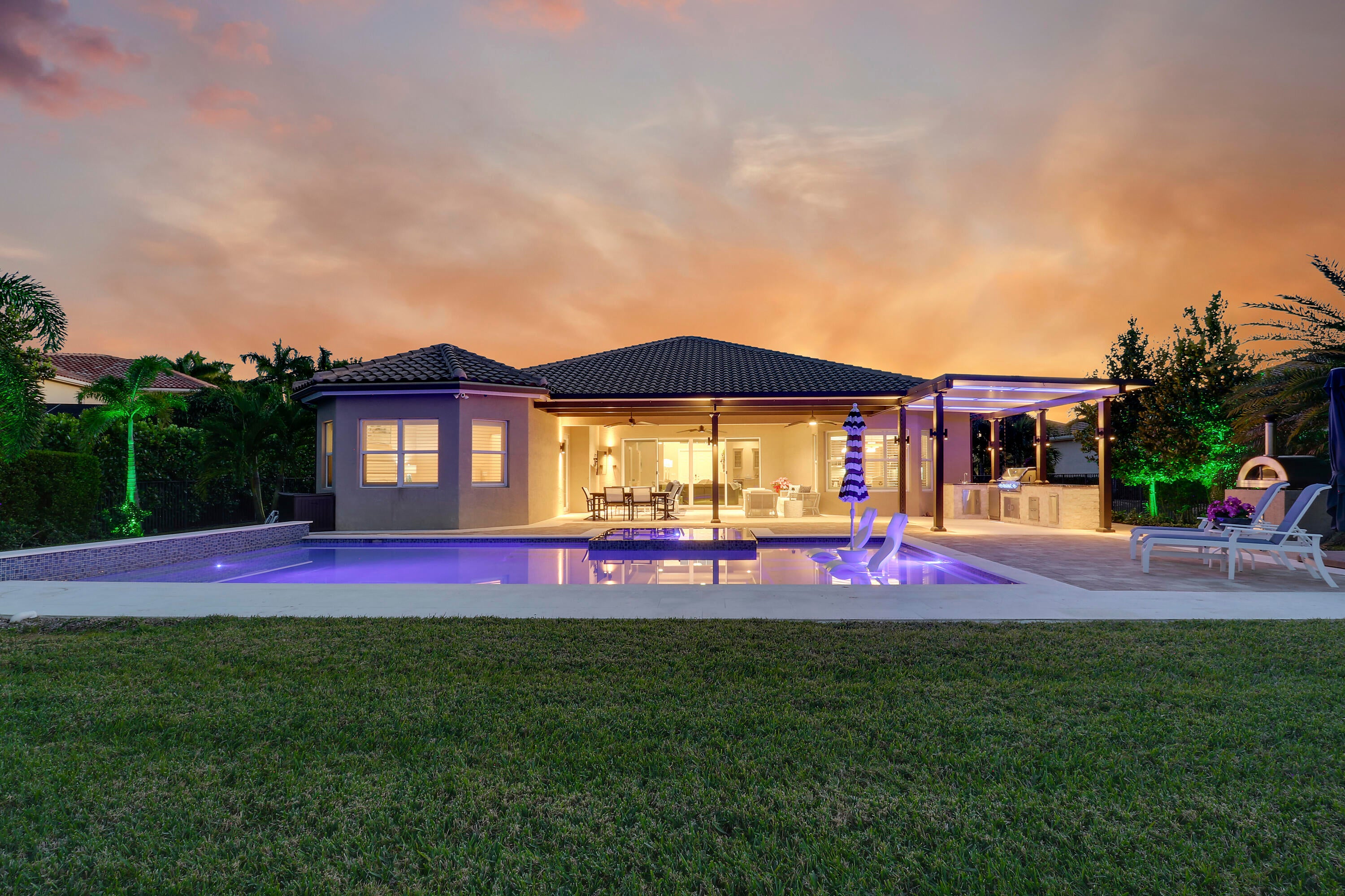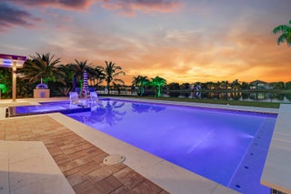 The Epitome of ''Luxury South Florida Living'' From the moment you step thru the front door your eye is drawn to the expansive extended Lanai offering over 400' of refined living space designed for entertaining. Featuring a summer kitchen w/ pizza oven, NEW resort-style heated pool, champagne spa, sun shelf creating a true private oasis. Perfectly positioned on 1/2 ac lakefront lot for the ultimate indoor outdoor lifestyle. Home blt in 2016 has a grand foyer vaulted high ceilings with open concept living space to kitchen, living and dining rooms. Primary front to back bedroom generous his her closets and spacious master bath. The other two large bedrooms are en-suite and there is a large 20x20 flex room for extra living space. 3 car garage and many improvements (list to be provided)