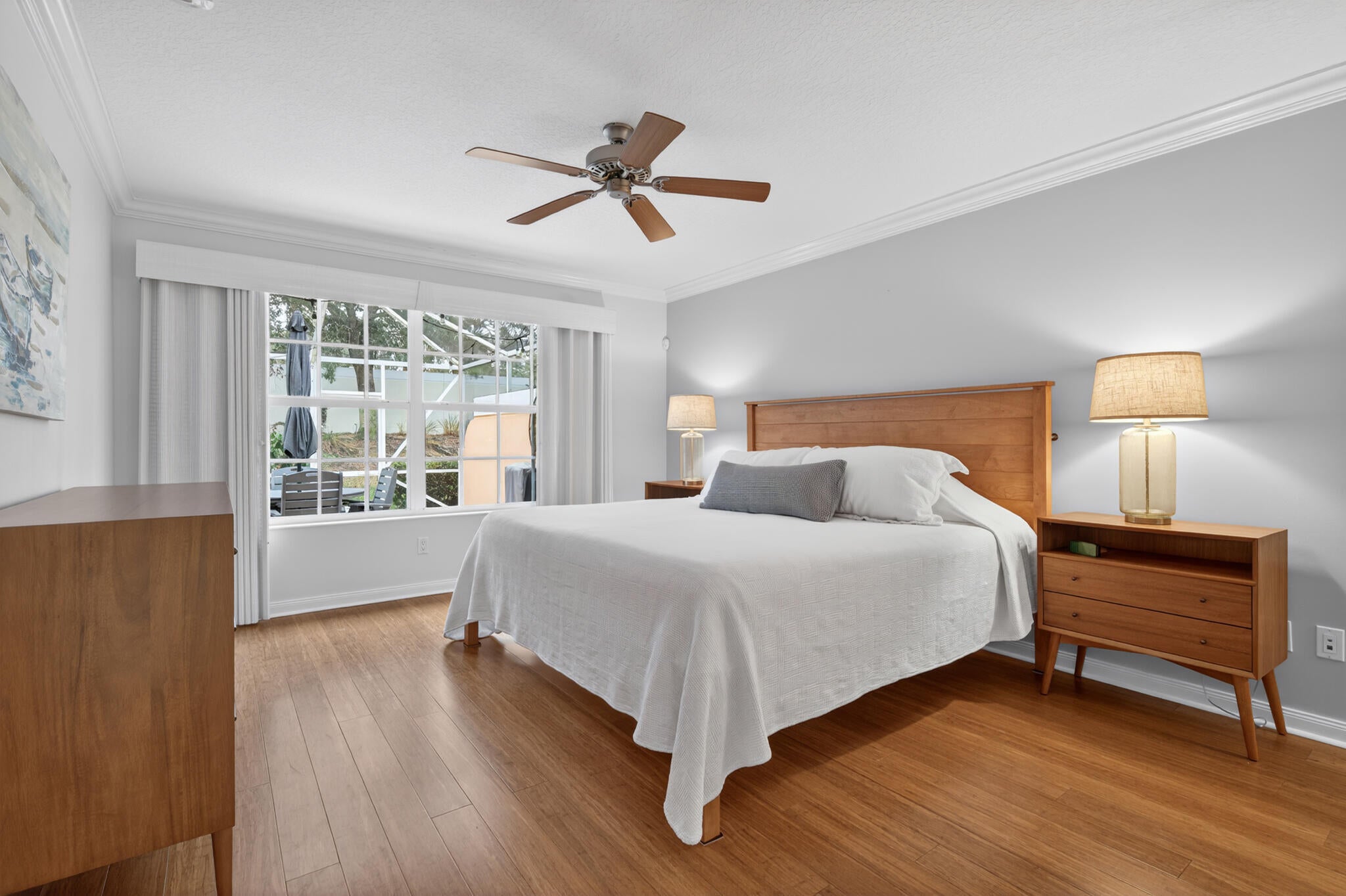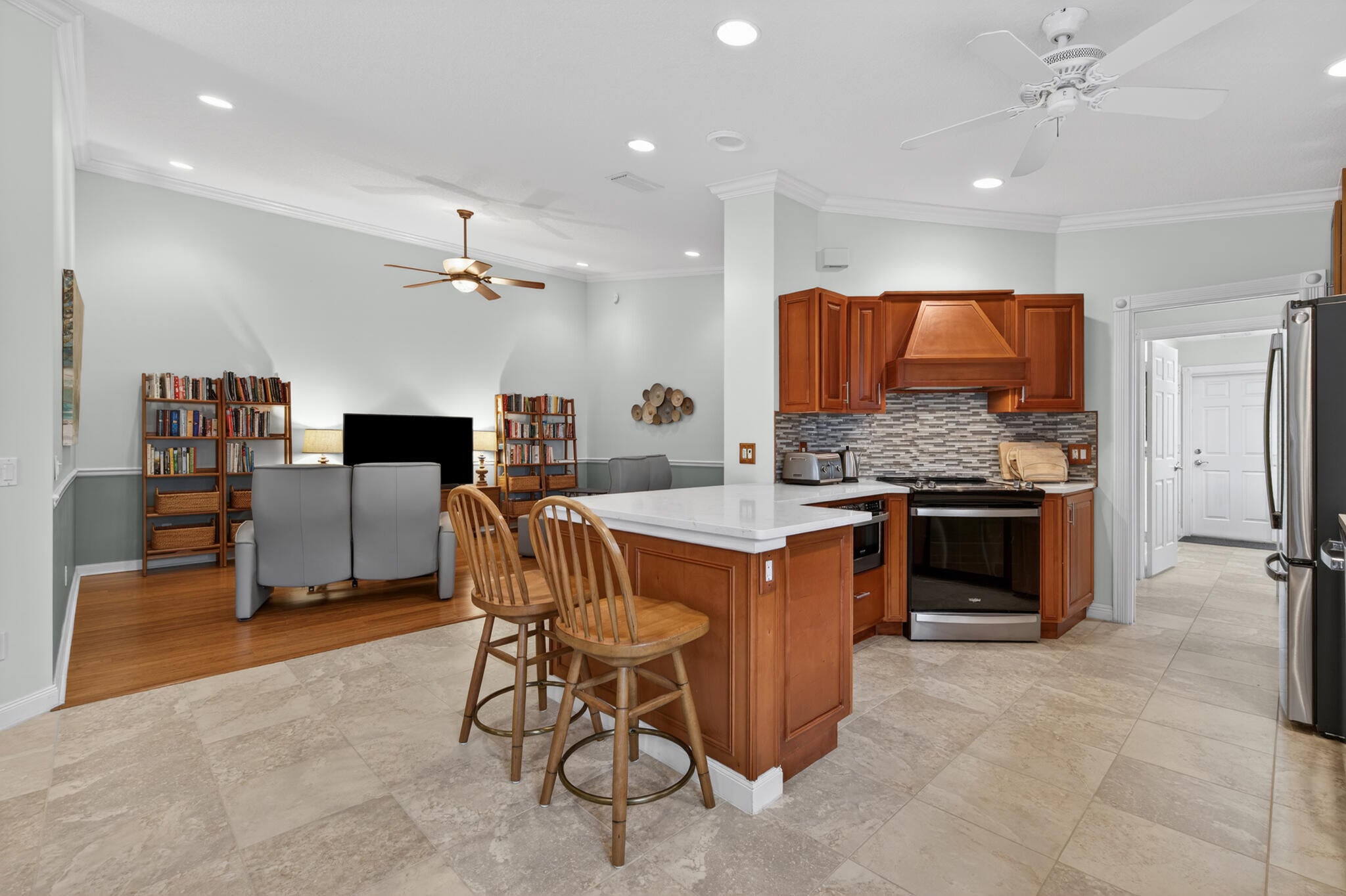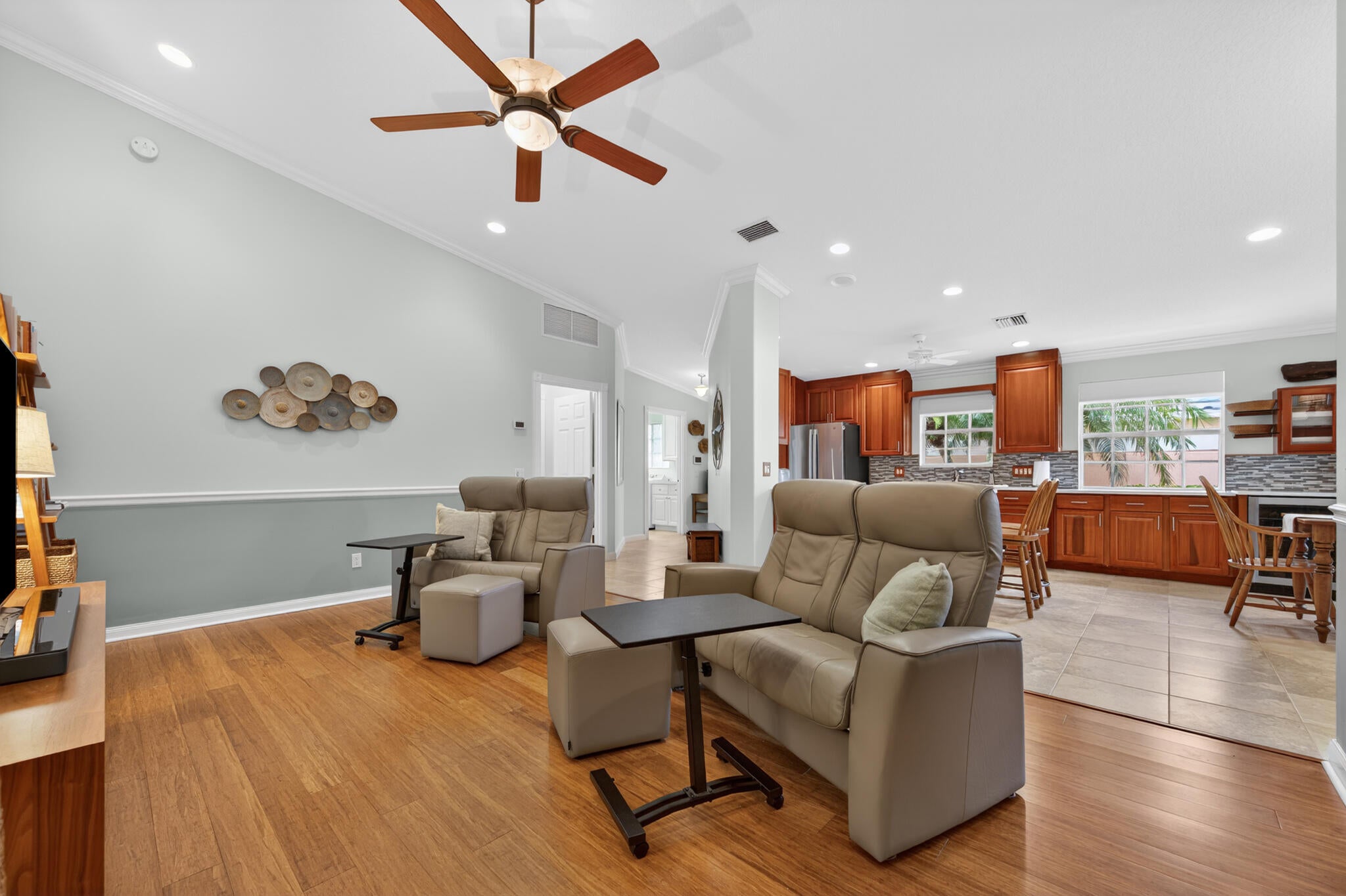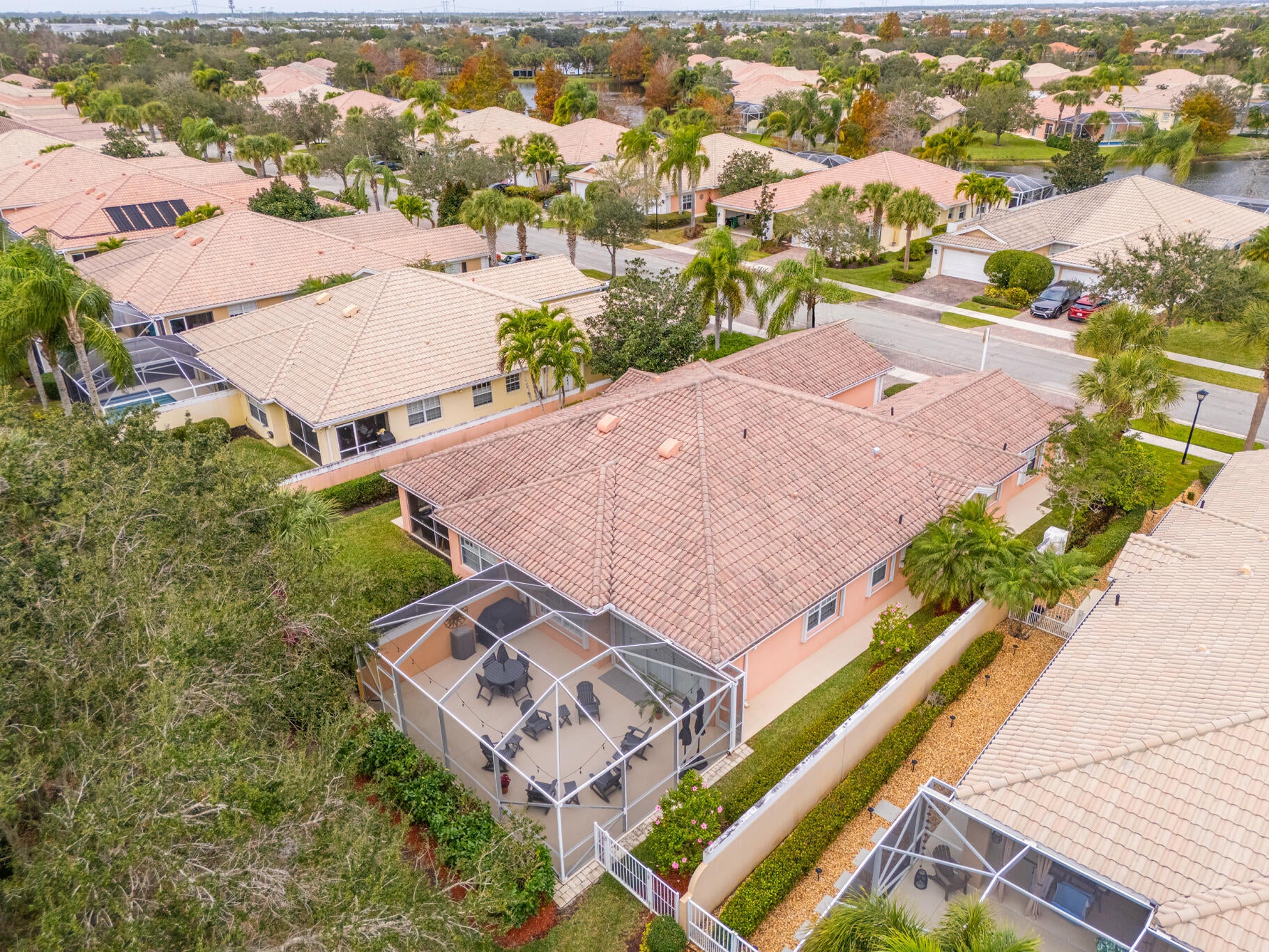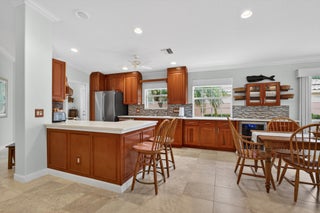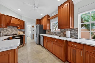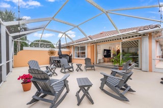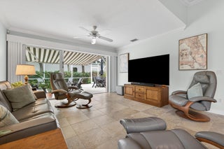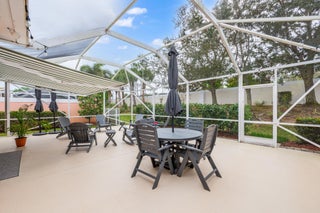 This spacious 1,680 sq ft extended floorplan villa is beautifully maintained and truly move-in ready. You'll love the tile and bamboo flooring throughout and the added touch of crown and wall moldings.The remodeled kitchen is both stylish and functional, featuring 2024 stainless steel appliances, a wine cooler, quartz countertops, and wood cabinets with soft-close doors and pull-out shelves--perfect for cooking and entertaining! The living area and primary bedroom have custom woven wood blinds, while the second bedroom features plantation shutters. Out back, the oversized screened patio is a private place to relax, made even better with an electric awning for shade and comfort. You'll also appreciate the accordion storm shutters and fenced side yard.Other perks include a brand-newnew washing machine (2026), and built-in storage shelves in thegarage. All of this is located in a gated community with fantastic amenities including a clubhouse, 2 heated pools, tennis and pickleball courts, and a fitness center. Plus, you're just minutes from shopping, dining, and entertainment at Tradition Square.