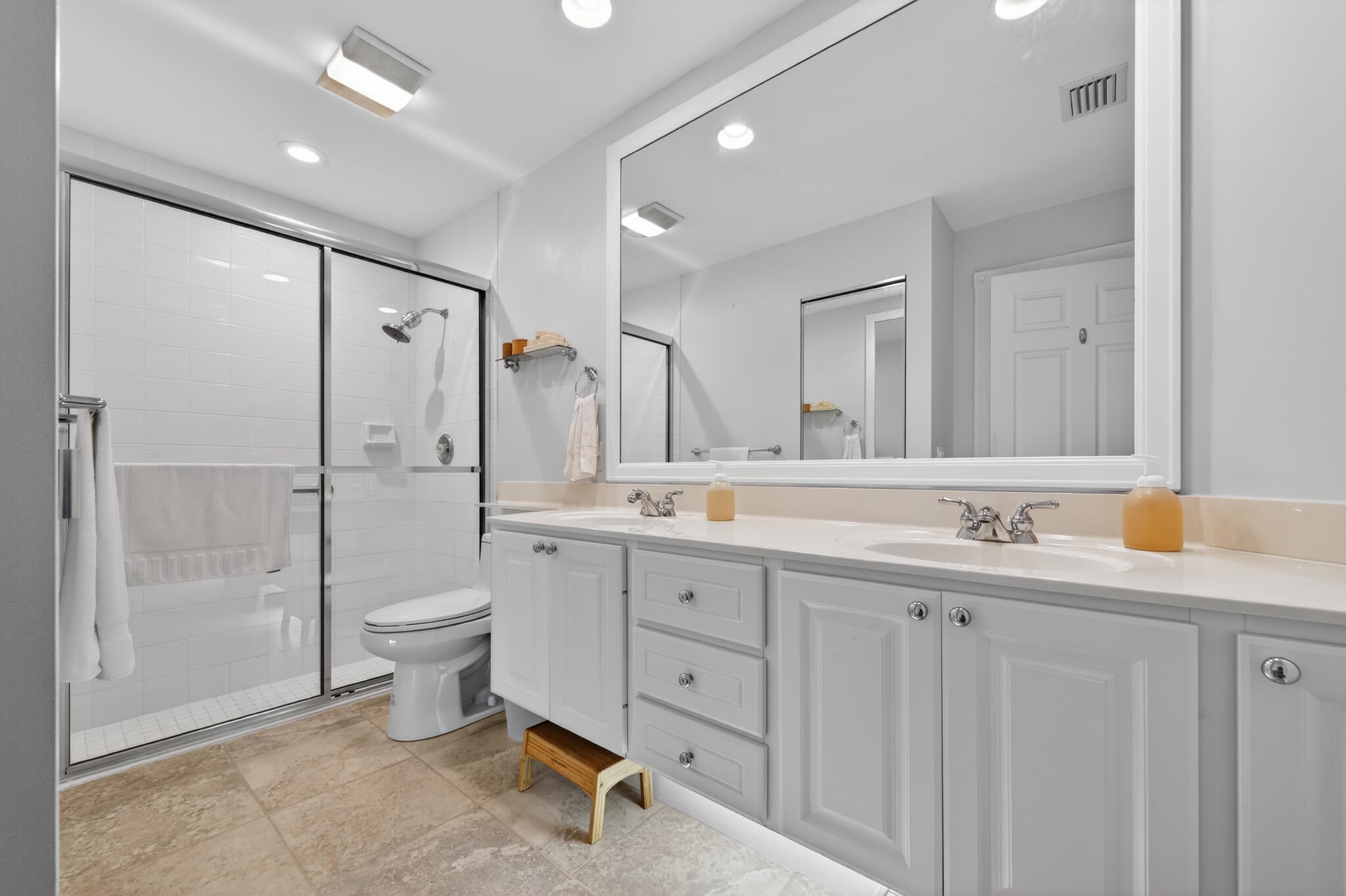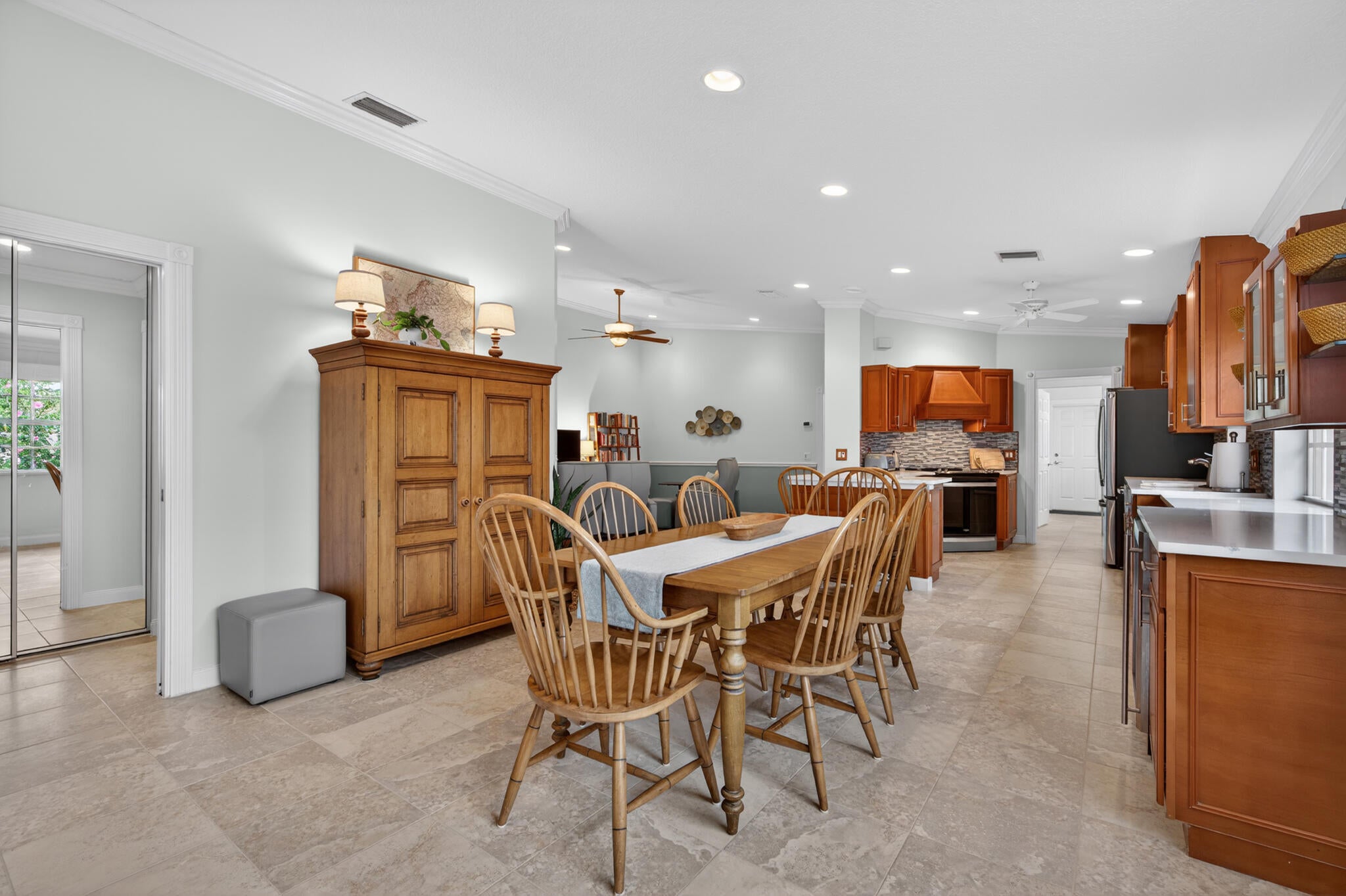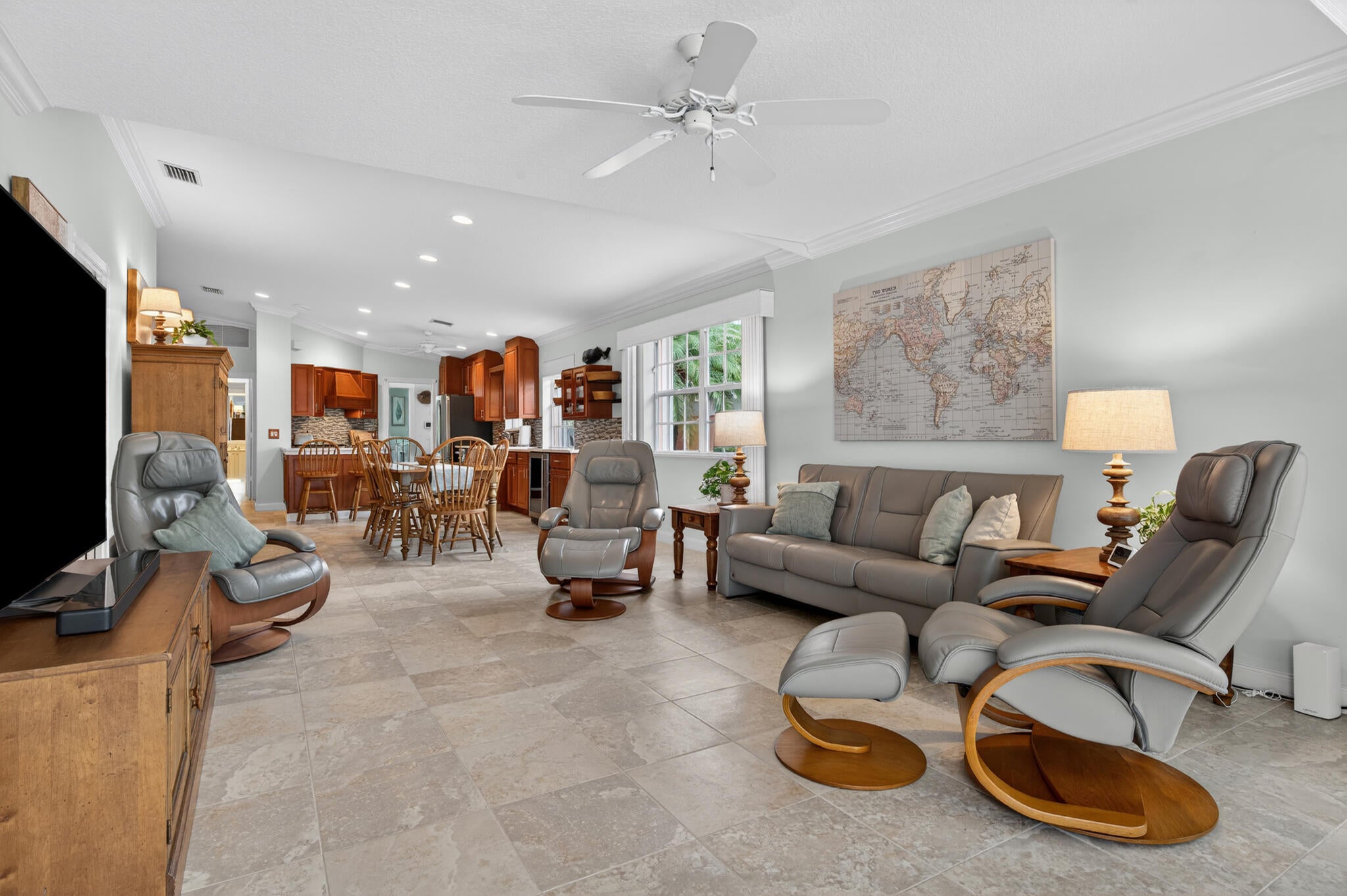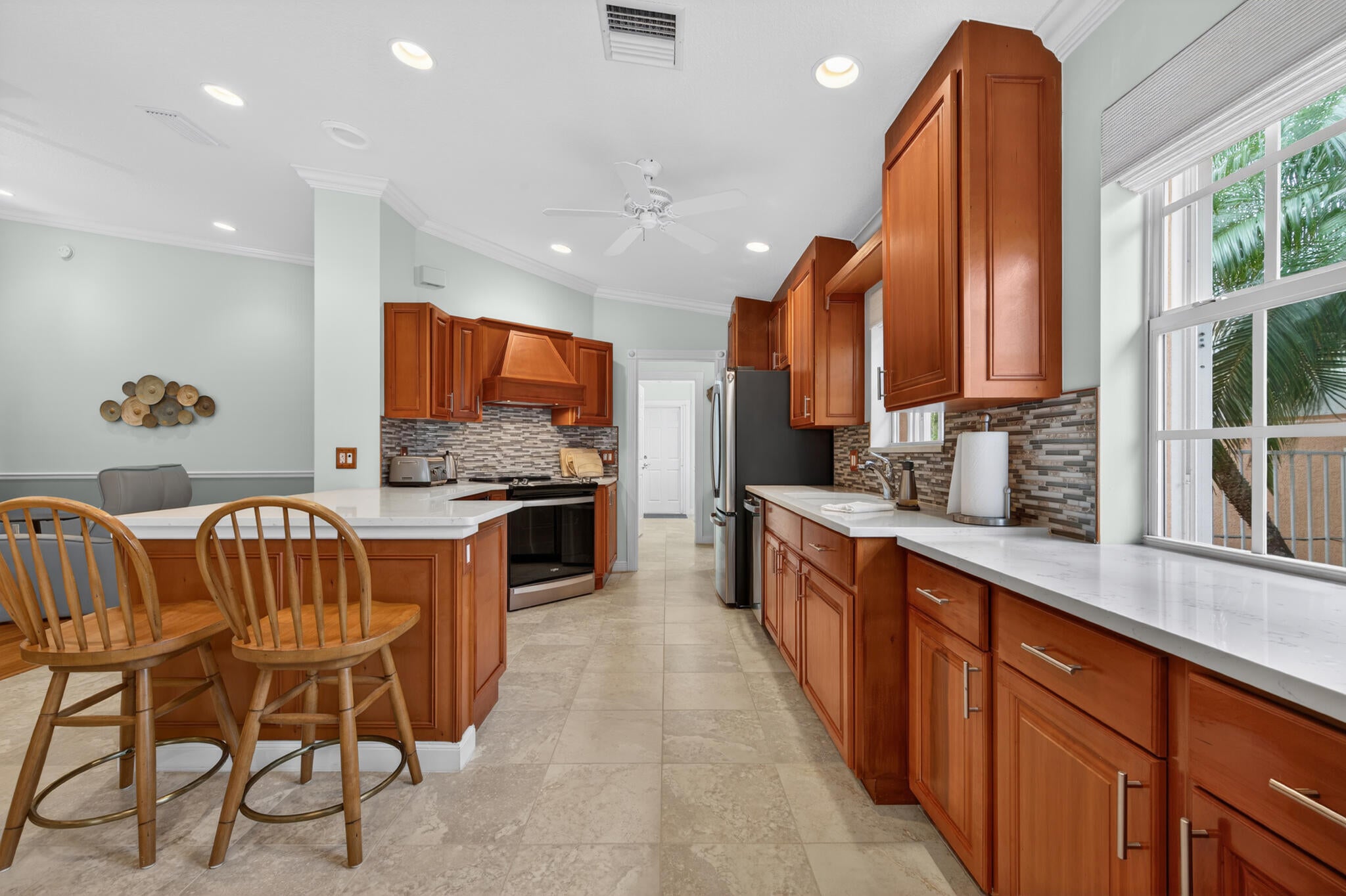 This spacious 1,680 sq ft extended floorplan villa is beautifully maintained and truly move-in ready. You'll love the tile and bamboo flooring throughout and the added touch of crown and wall moldings.The remodeled kitchen is both stylish and functional, featuring 2024 stainless steel appliances, a wine cooler, quartz countertops, and wood cabinets with soft-close doors and pull-out shelves--perfect for cooking and entertaining! The living area and primary bedroom have custom woven wood blinds, while the second bedroom features plantation shutters. Out back, the oversized screened patio is a private place to relax, made even better with an electric awning for shade and comfort. You'll also appreciate the accordion storm shutters and fenced side yard.Other perks include a brand-newnew washing machine (2026), and built-in storage shelves in thegarage. All of this is located in a gated community with fantastic amenities including a clubhouse, 2 heated pools, tennis and pickleball courts, and a fitness center. Plus, you're just minutes from shopping, dining, and entertainment at Tradition Square.