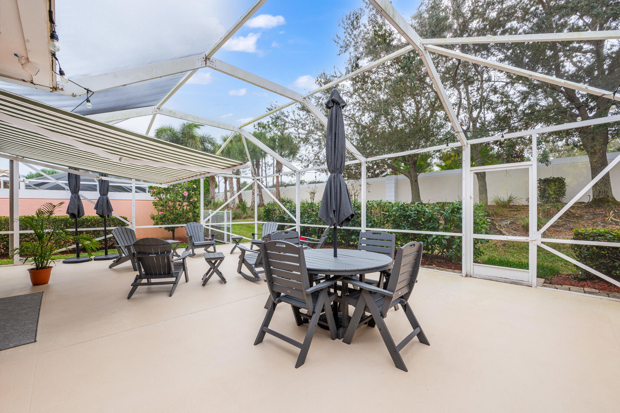 Auto Sprinkler, Fence, Open Patio, Screened Patio, Shutters, Awnings