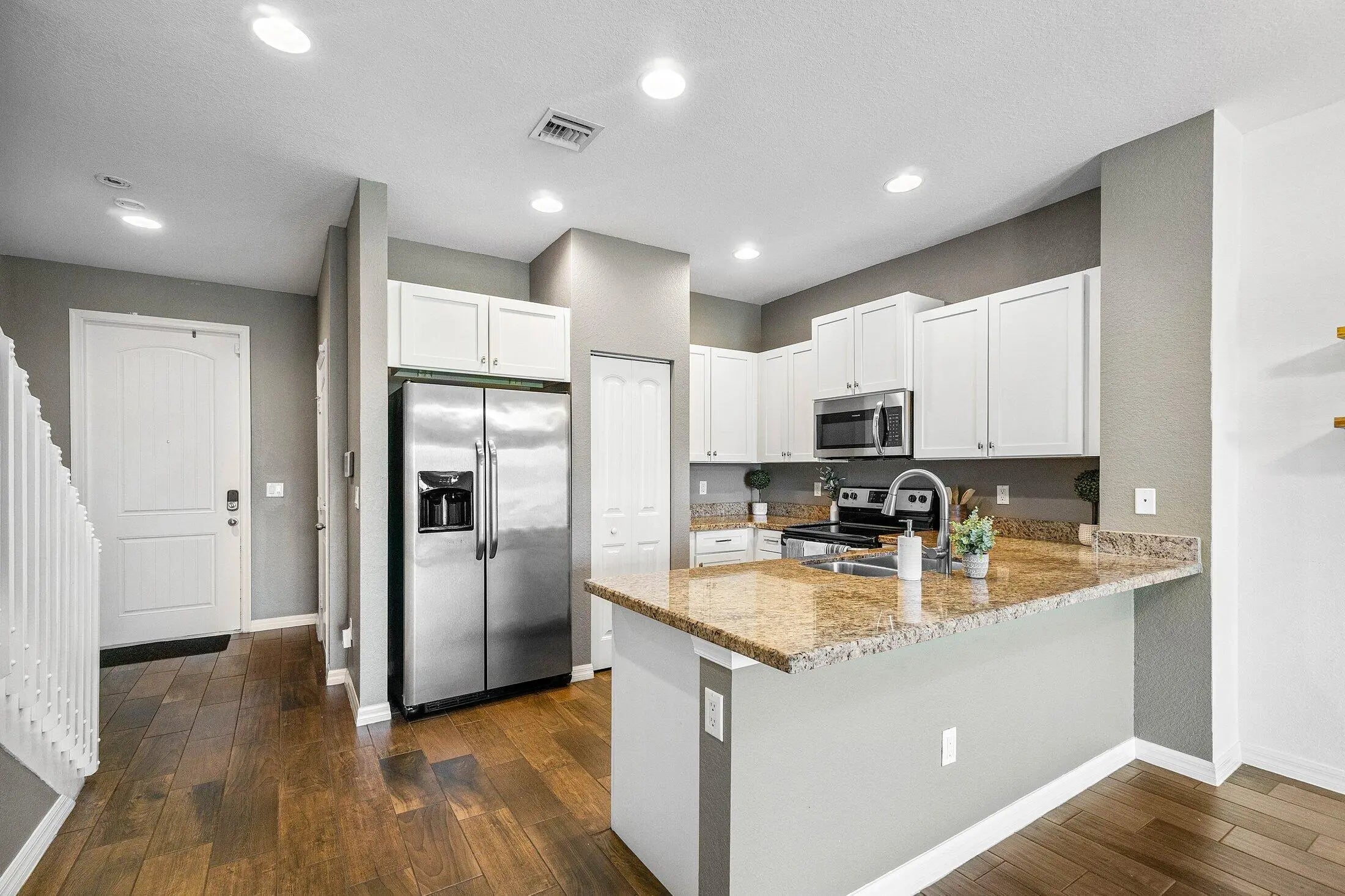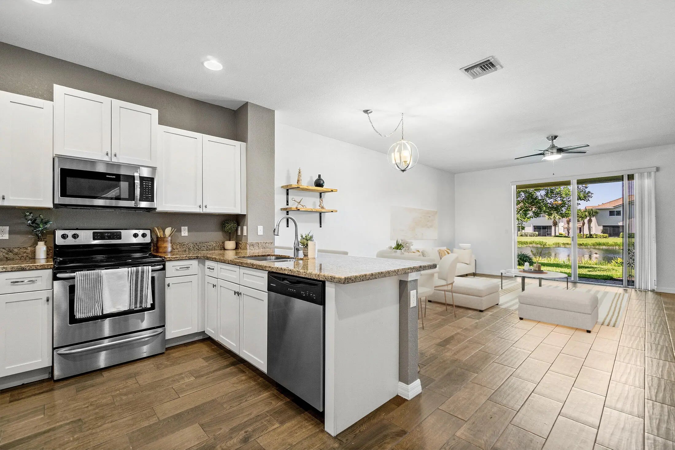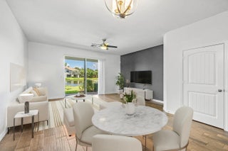 This move-in-ready waterfront townhome in gated community features a low HOA of $235/month. The upgraded kitchen includes sleek finishes and stainless steel appliances and opens to a bright living area with wood-look porcelain tile flooring and natural light throughout.The primary suite offers a renovated bathroom with a walk-in shower, designer tile, and premium fixtures. Secondary bedrooms are well sized with ample storage. In-unit washer and dryer included. Private patio overlooks tranquil water and fountain views. Conveniently located near beaches, shopping, dining, and major highways.