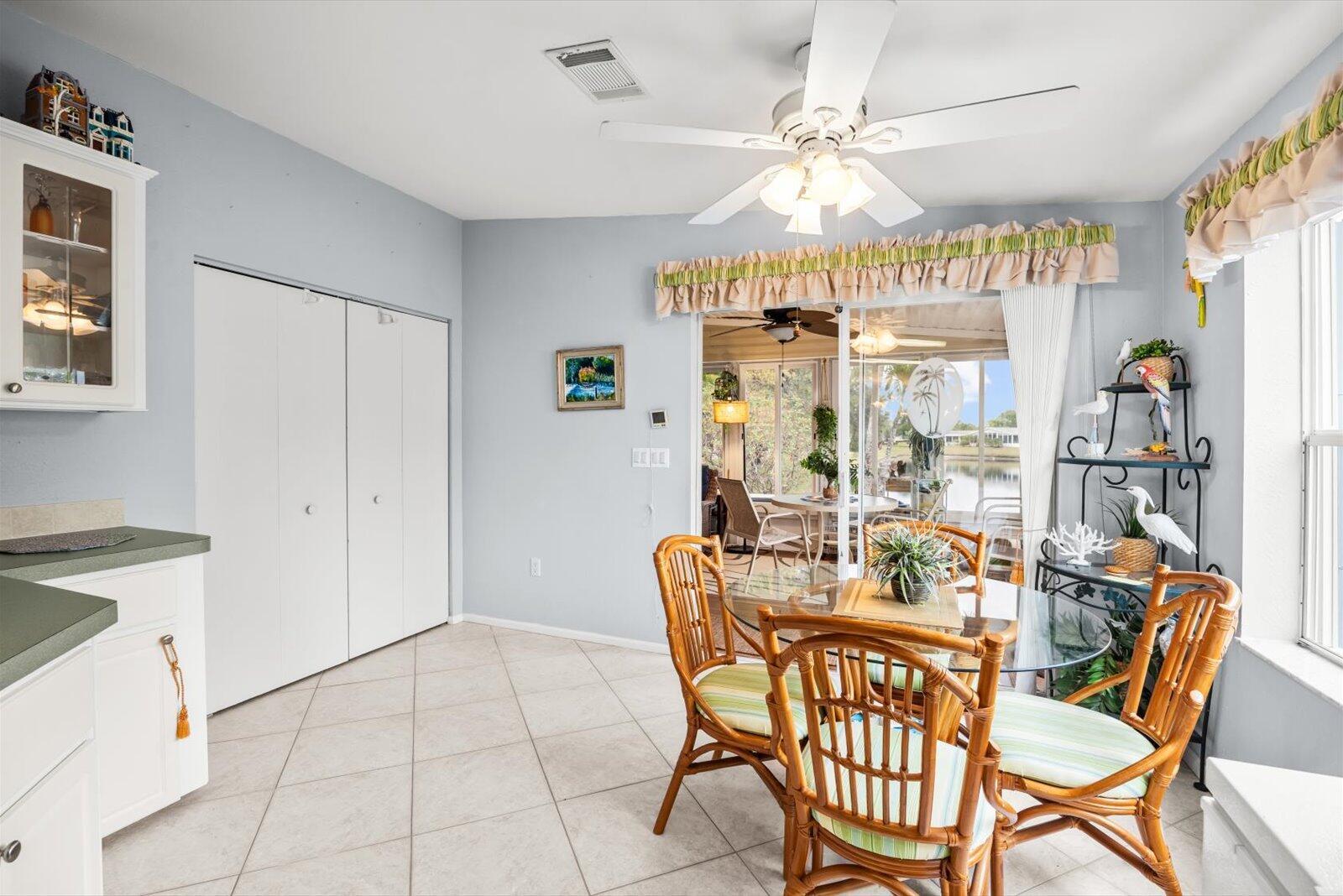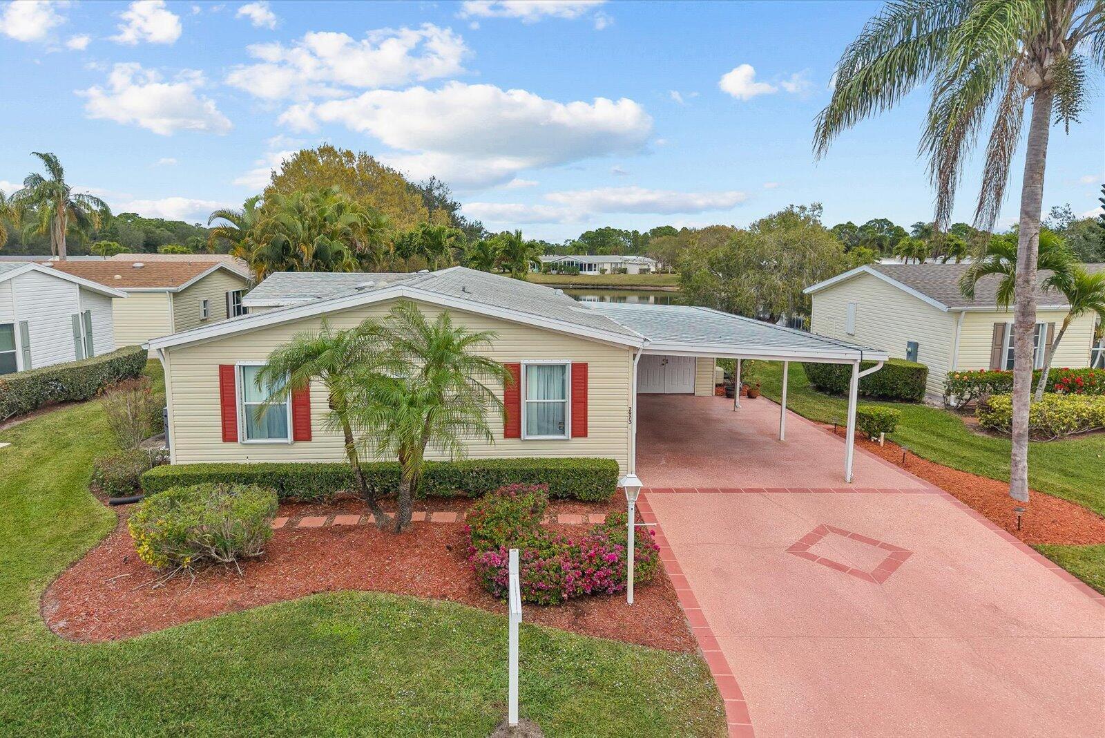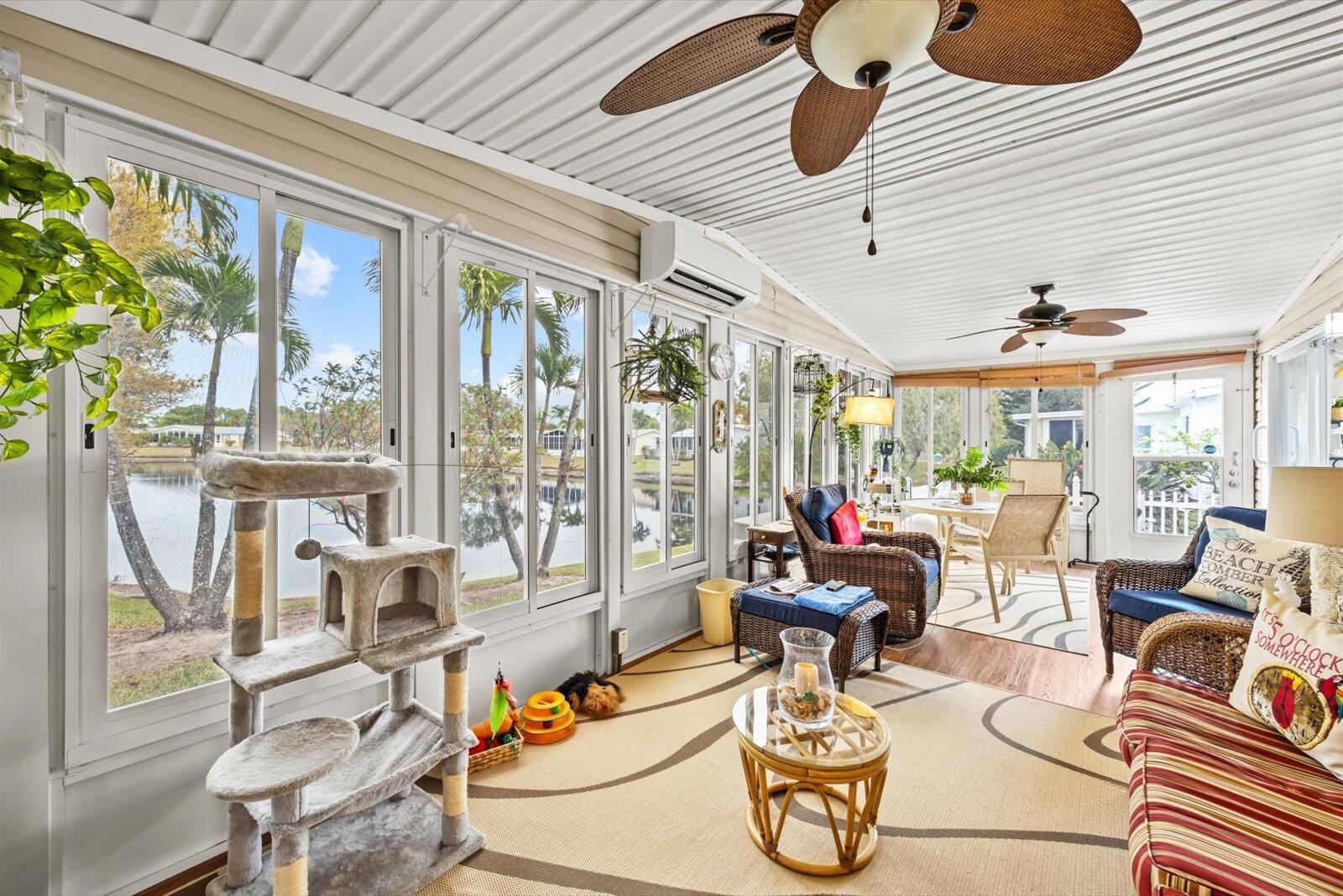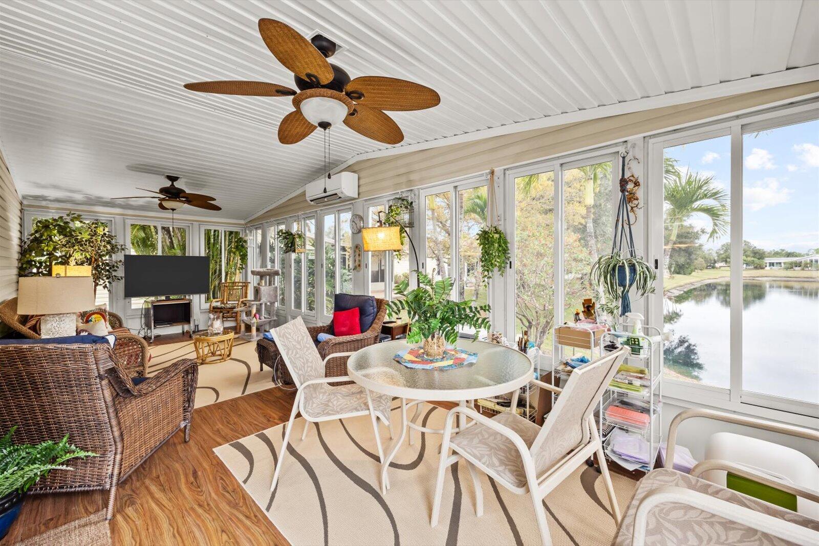 Welcome to Savanna Club, a sought-after 55+ amenity-packed community where resort-style living meets everyday comfort. This popular Coral Reef floor plan offers 2 BR's, 2 BA's, plus a versatile den perfect for an office, hobby room, or guests. Enjoy serene lake views from the 27' enclosed glass porch with its own mini-split A/C, ideal for year-round relaxation. The home is fully furnished turnkey--just bring your suitcase. Features include acc. shutters, 2015 roof, 2023 A/C, cost-saving irrigation well, and laminate and tile flooring thru-out. Start your mornings on the open patio with sunrise views and coffee in hand or take a short walk to Savanna Club's pools, clubhouse, fitness center, golf, activities, restaurant and more! Land Lease Property