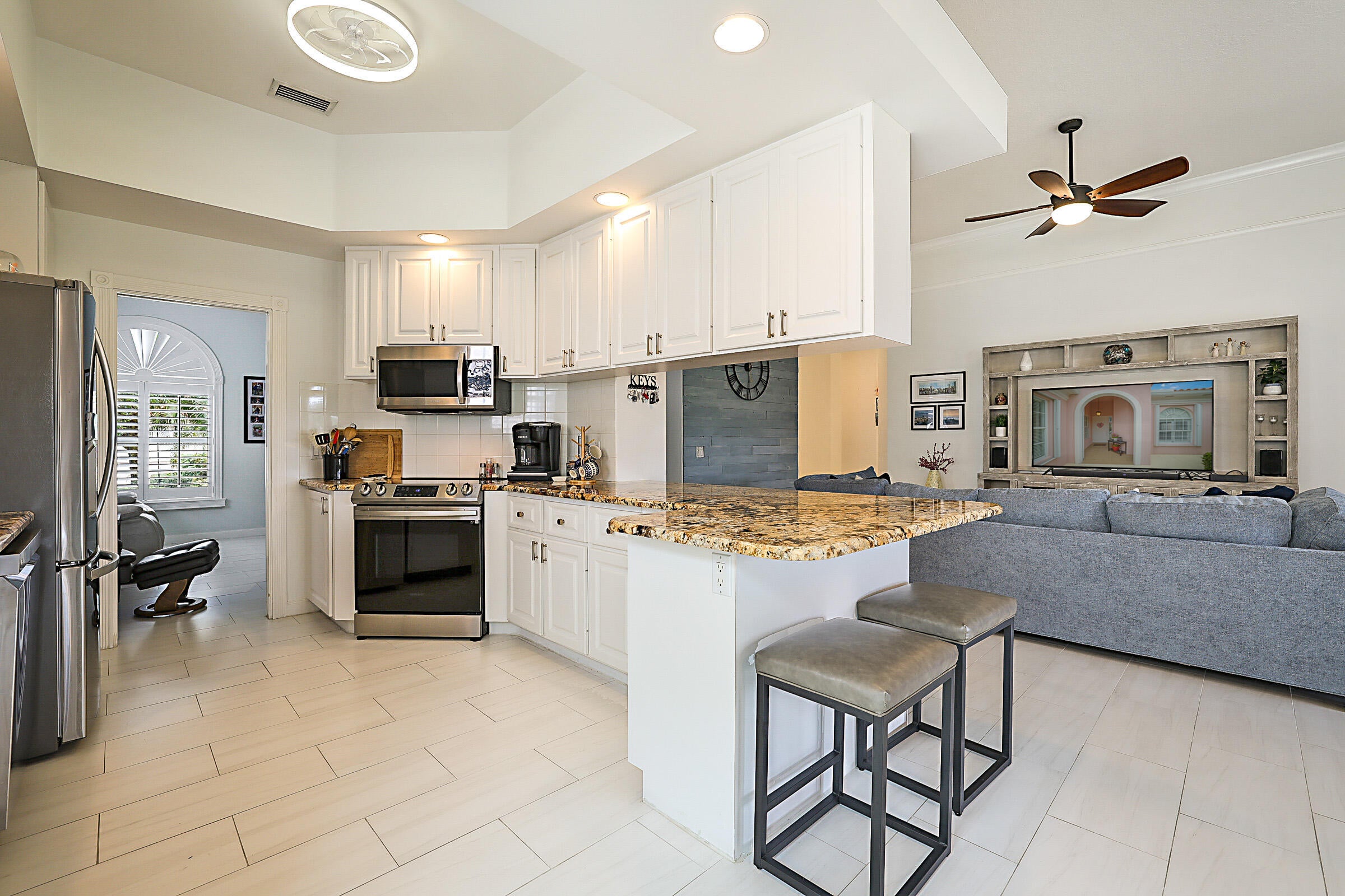Welcome to The Florida Club, a gated golf community with the option of a membership, if desired. This Beautiful Oakmont model is meticulous and move in ready! The Oakmont offers 3 bedrooms, den / office, his & her primary baths with a shared shower and guest bathroom. NEW ROOF installed in May 2022, NEW AC installed 2023, NEW HOT WATER HEATER INSTALLED 2022, NEW HURICANE RATED GARAGE DOOR & OPENER with smart phone capabilities. Appliances are about 5 yrs old. The living area has newer tile throughout, sizeable living room that flows into the dining area and kitchen. The kitchen is open and perfect for entertaining with white cabinets, granite, newer stainless appliances, new faucet, and updated lighting. The Primary Suite has tons of closet space, walk-in closet, .......new cabinetry in his & her baths, as well as a fully renovated walk-in shower, granite countertops, new hardware & lighting, and soaking tub. The 2nd & 3rd bedrooms are split from the primary suite with a shared bath that has been renovated as well. New vanity, granite, glass sliding doors on tub, and lighting. The office is placed at the front of the house and is the perfect space to work from home, to create a library or an additional TV room. This home has crown molding throughout. The laundry room has tons of cabinet space, drawers, and a laundry sink. Additional features of this home include: Plantation shutters in kitchen, office and primary suite, Impact sliders in primary suite and dining area, screened patio with golf views and an additional electric screen for inclement weather, paver driveway, walking path around the home with grill space on the side, central vacuum, and attic pull down stairs. This community is pristine and very welcoming. It is located just west of I-95 for easy interstate access.