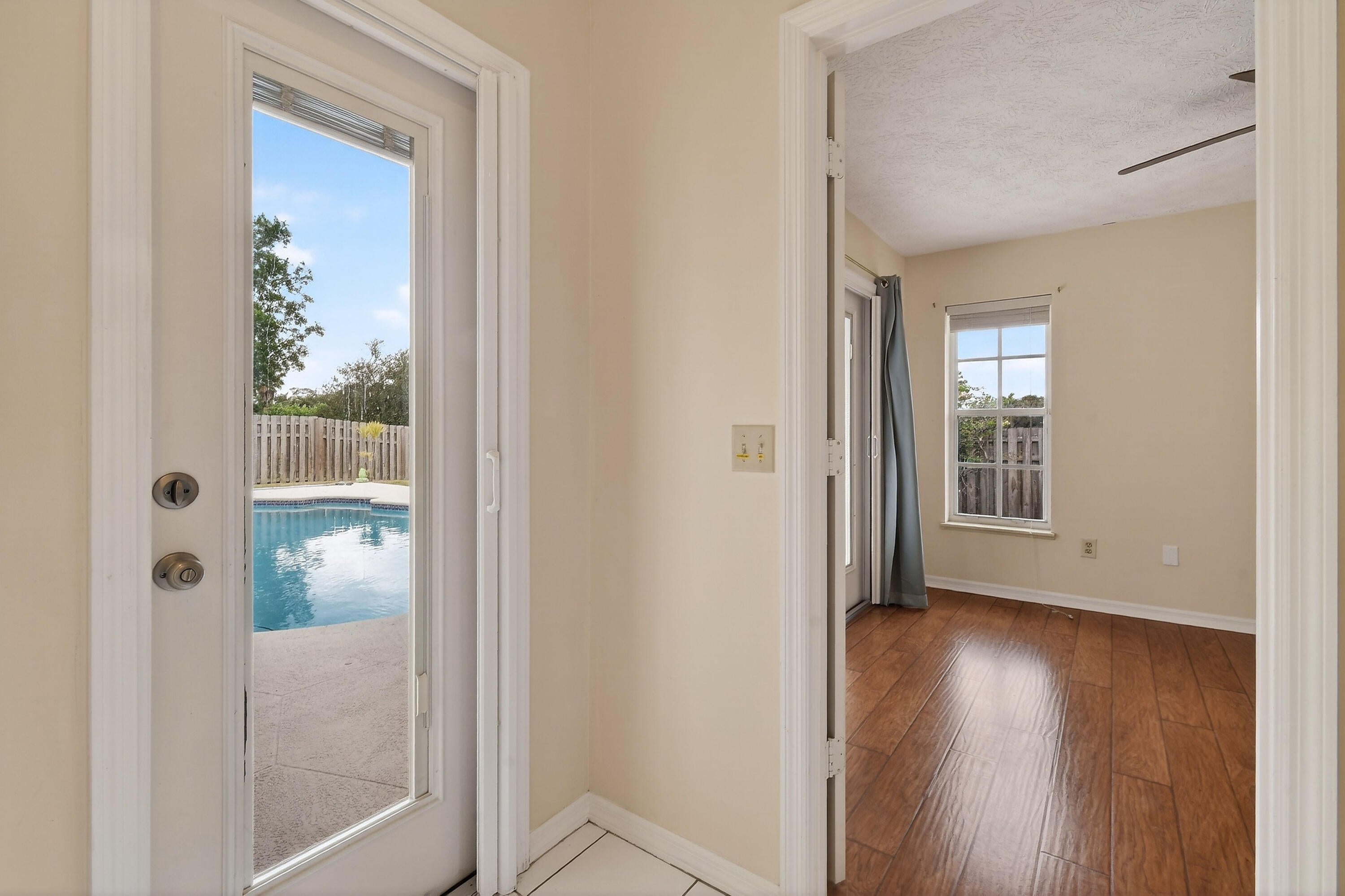 Beautiful 3 bedroom, 2 bath CBS POOL home with 2 car garage featuring a private backyard facing a serene nature area. A huge enclosed patio with sliding doors that open completely perfect for entertaining. Great split floor plan with both the primary and second bedrooms having direct access to the patio.Spacious kitchen, breakfast area, New A/C 2025, solar panels, and solar-heated pool. NO HOA.Conveniently located near shops, restaurants, and the interstate. A must-see home combining comfort, style, and privacy.