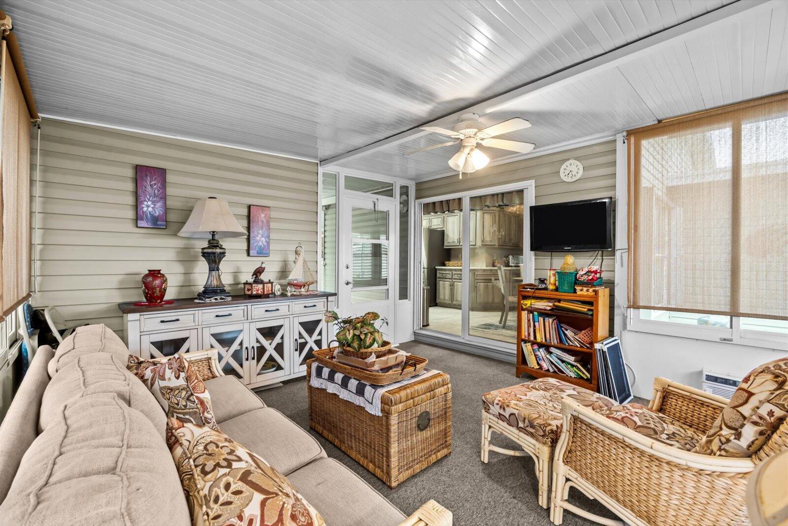 Welcome to your sunny slice of paradise in the Savanna Club 55+ community. This fun and flexible 2-BR, 2-BA home + a den/office sits on a corner lot and is packed with features to love. Enjoy a newer, updated kitchen with SS appliances, split floor plan, plantation shutters, and tiled and laminate. The enclosed glass lanai is perfect for morning coffee while TWO storage sheds and an additional driveway provide plenty of space for guests and parking.Home offers peace of mind with a 2020 roof, 2025 HWH, acc. shutters, irrigation well, and is partially furnished for your convenience. Just minutes from 2 clubhouses, a 10,000 SF theater, rec. center, 3 pools, restaurant, and endless activities you are sure to love this place so many call home! Land Lease Property