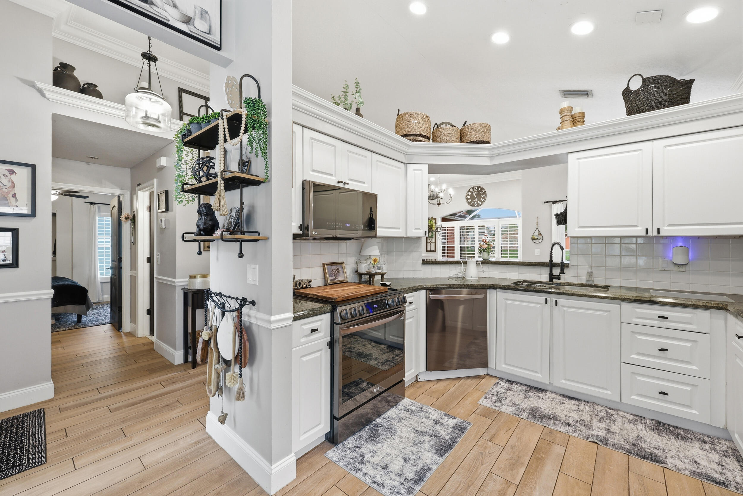 Welcome to this gorgeous single-family residence offering a tranquil lake view and a beautifully screened patio designed for effortless indoor-outdoor living. This bright and meticulously maintained 3-bedroom, 2-bath home features an open, airy floor plan with vaulted ceilings, brand-new flooring throughout, and abundant natural light that creates an inviting, uplifting atmosphere.High-end crown molding adds a refined, custom touch throughout, while all closets feature custom built-ins for exceptional storage and organization. The bathrooms were renovated in 2022, showcasing updated finishes that blend modern comfort with the home's timeless charm. The home has been thoughtfully updated with a 2022 roof and new appliances, providing both peace of mind and modern convenience. Step outside to your screened patioperfect for morning coffee, sunset dinners, or entertaining friends while enjoying serene water views. Located within a resort-style, gated community, residents enjoy an exceptional lifestyle with access to three swimming pools, a clubhouse, fitness center, tennis and racquetball courts, playgrounds, and 24/7 security. Whether you're seeking relaxation, recreation, or a strong sense of community, this home offers it all. A perfect blend of comfort, style, and amenitiesthis is Florida living at its finest.