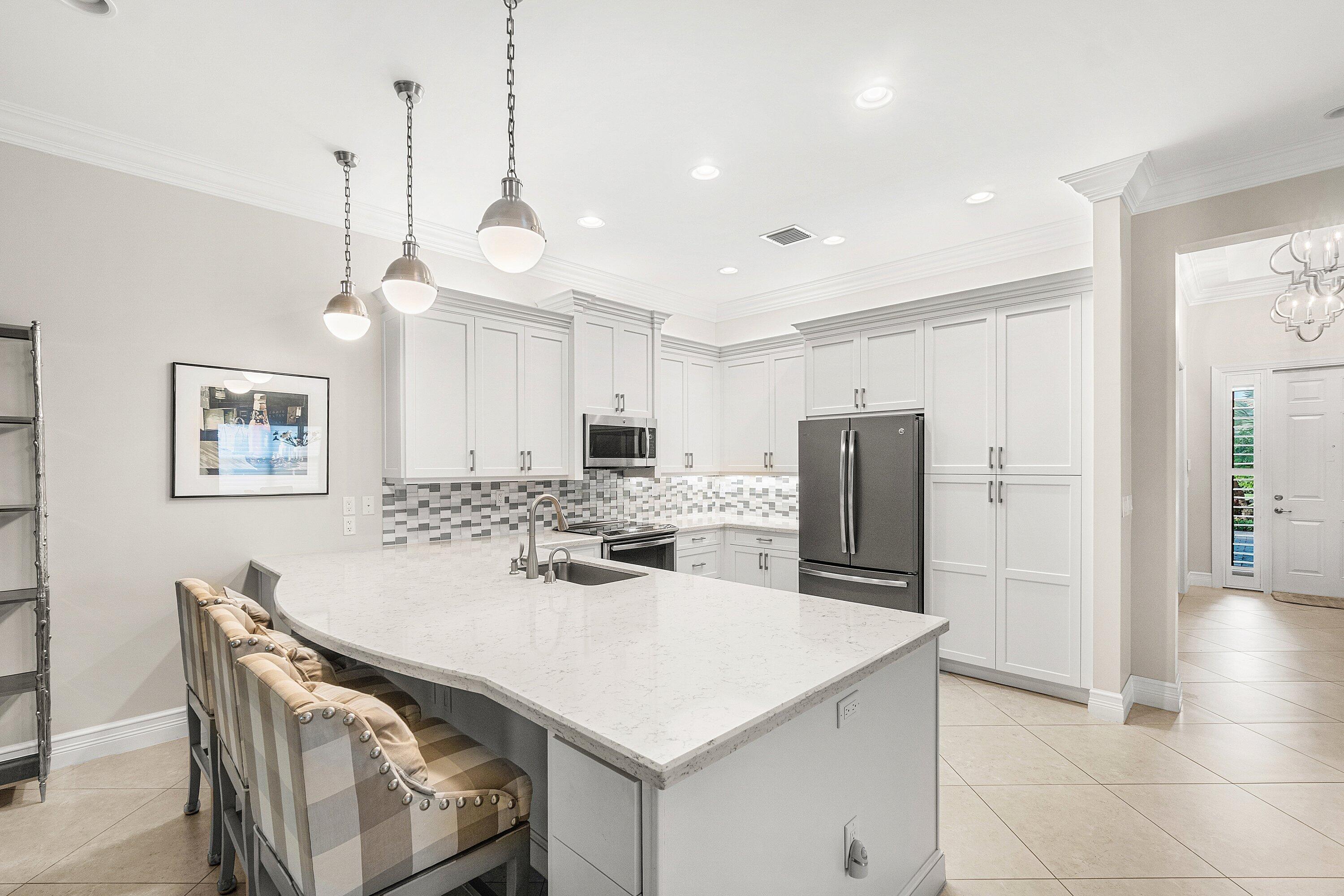 Welcome to this charming waterfront residence, ideally situated on a private cul-de-sac within the highly regarded community of Valencia Bay. Upon entering from the covered patio, you are led from the impressive foyer into a stunning open-concept great room designed for both comfort and entertaining. The gourmet kitchen showcases timeless white shaker cabinetry, quartz countertops, a generously seated peninsula, and abundant storage, seamlessly flowing into a spacious dining area that makes hosting effortless. The great room features a custom-built-in media center and is framed by picturesque lake views, creating a serene and inviting atmosphere. Step outside to the sun-drenched, screened-in patio, where tranquil water views provide the perfect backdrop for relaxation in your own --> private oasis. The expansive primary suite offers a true retreat, complete with dual oversized custom-outfitted closets, dual vanities, a Roman tub, and a large walk-in shower. A well-appointed second bedroom includes a spacious walk-in closet and a private en-suite bath, while the versatile den serves as an ideal home office, guest space, or quiet sanctuary for relaxation. Enjoy a carefree lifestyle in this exceptional 55+ gated community, highlighted by a dramatic water feature at the entrance. The Valencia Bay clubhouse spans over 33,000 square feet and offers an impressive array of amenities, including a full-time social director, tennis and pickleball programs, three card rooms, a café with indoor and outdoor seating, an arts and crafts studio, a billiards room, catering kitchen, cooking studio, yoga and fitness studios, and a fully equipped fitness center with men's and women's locker rooms.