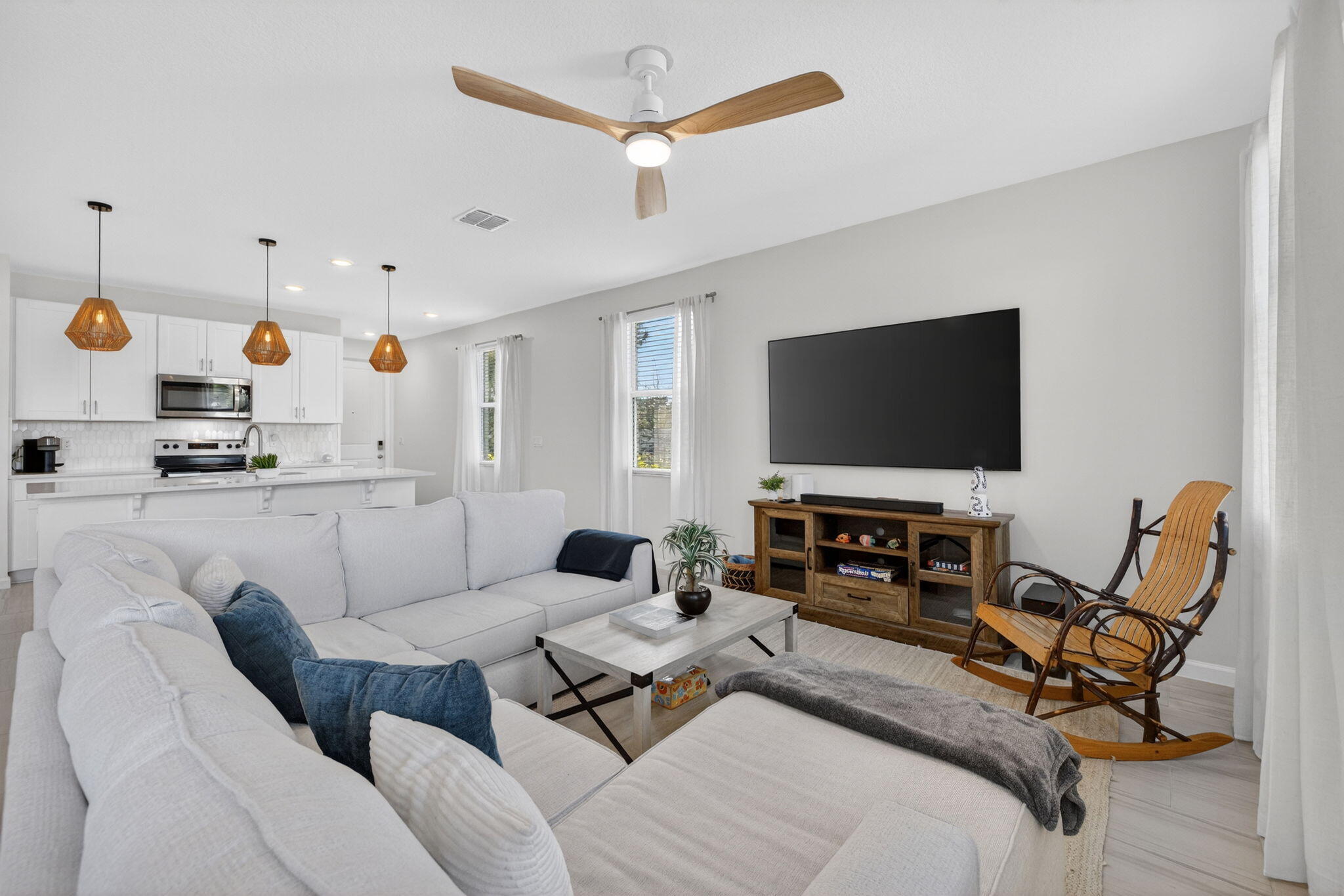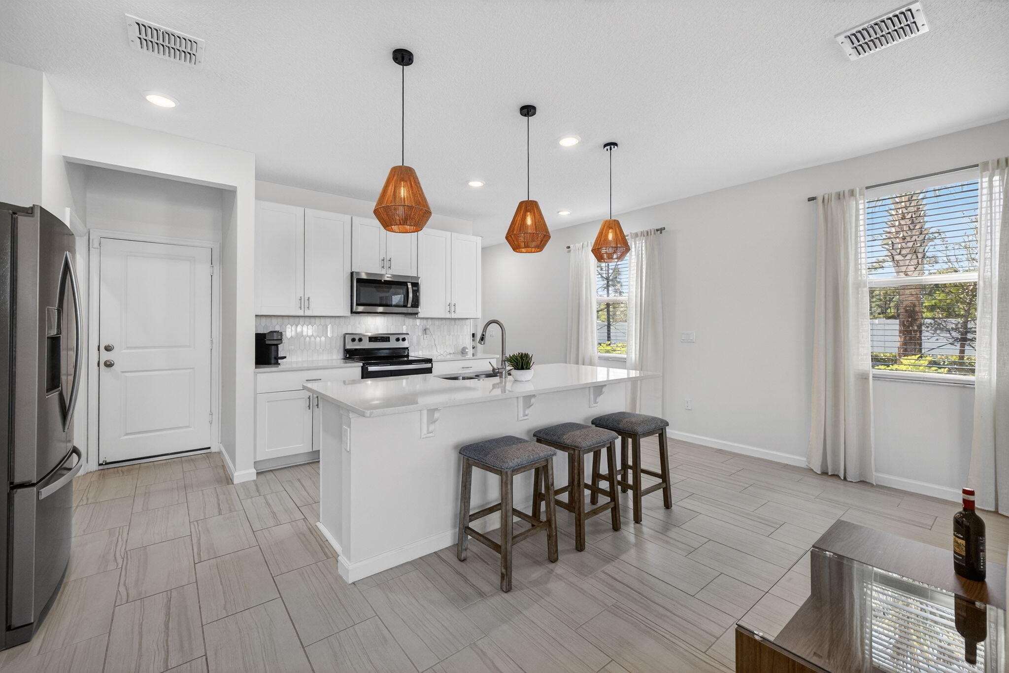 Immaculate, nearly new end-unit townhome in the gated community of Willoughby Townhomes at Edgewater Pointe. Built in 2024 and upgraded with over $30,000 in premium finishes, this residence offers modern elegance with no builder wait or fees. The open-concept living space features white shaker cabinetry, quartz countertops, marble backsplash, upgraded lighting, and stylish pendant fixtures. Durable laminate flooring extends throughout the second level and stairway.Offering 3 bedrooms, 2.5 baths, a loft, and an oversized 2-car garage, including a custom epoxy garage floor and upgraded half-bath vanity. The spacious primary suite provides a serene retreat, while secondary bedrooms are ideal for guests or a home office. Enjoy resort-style amenities, a community pool, and a prime location just minutes from downtown Stuart, beaches, dining, and shopping. Turnkey, low-maintenance luxury living at its finest.