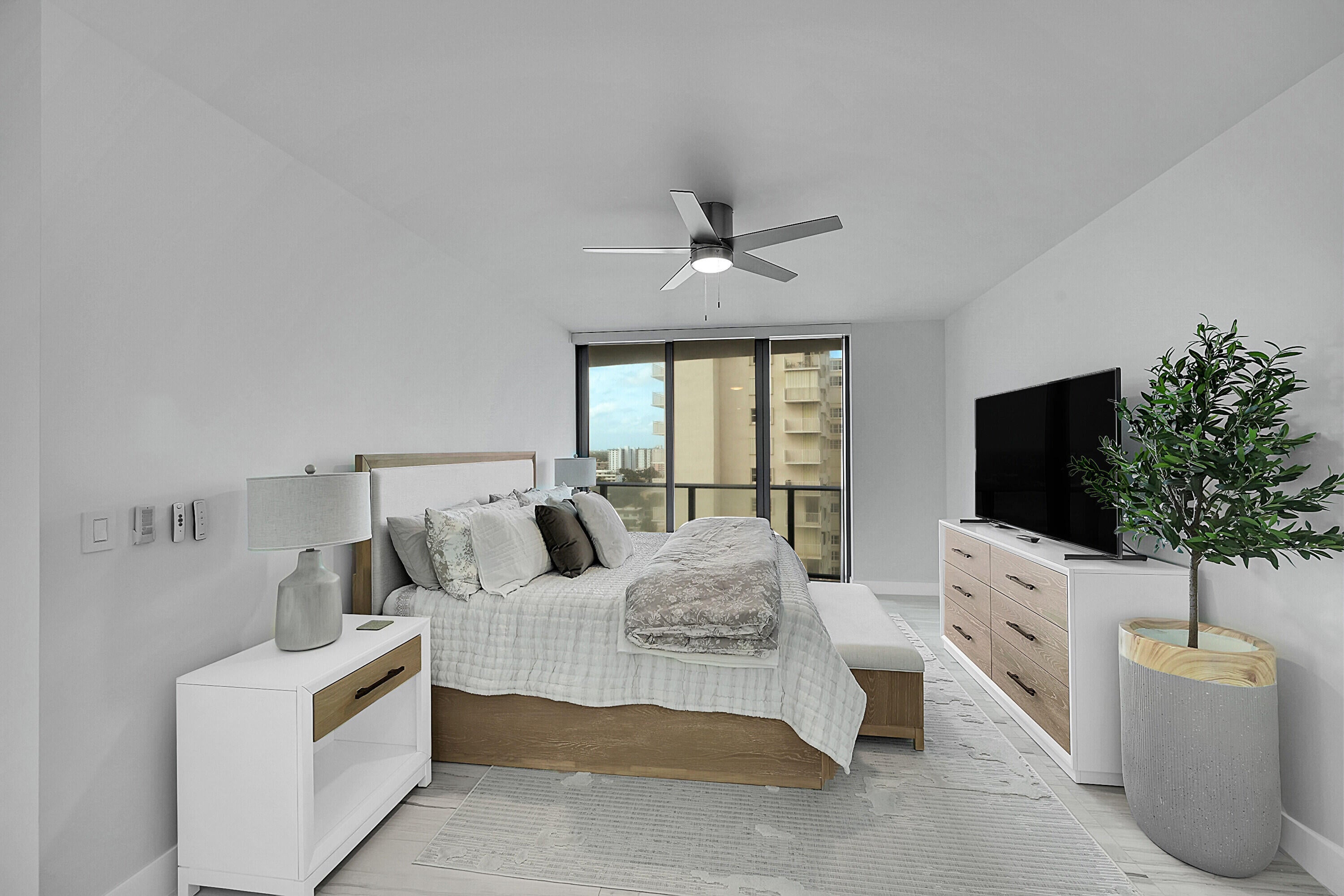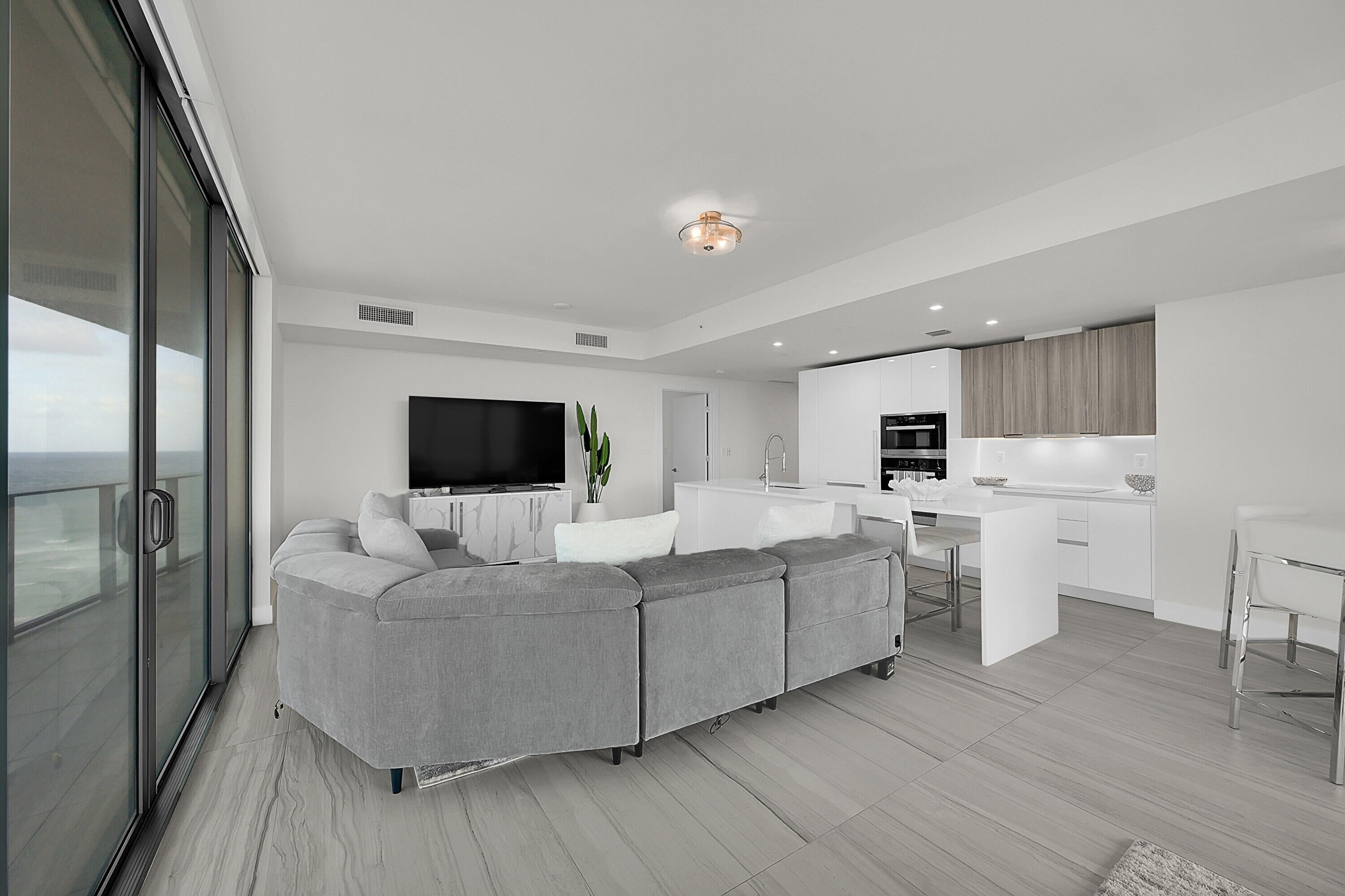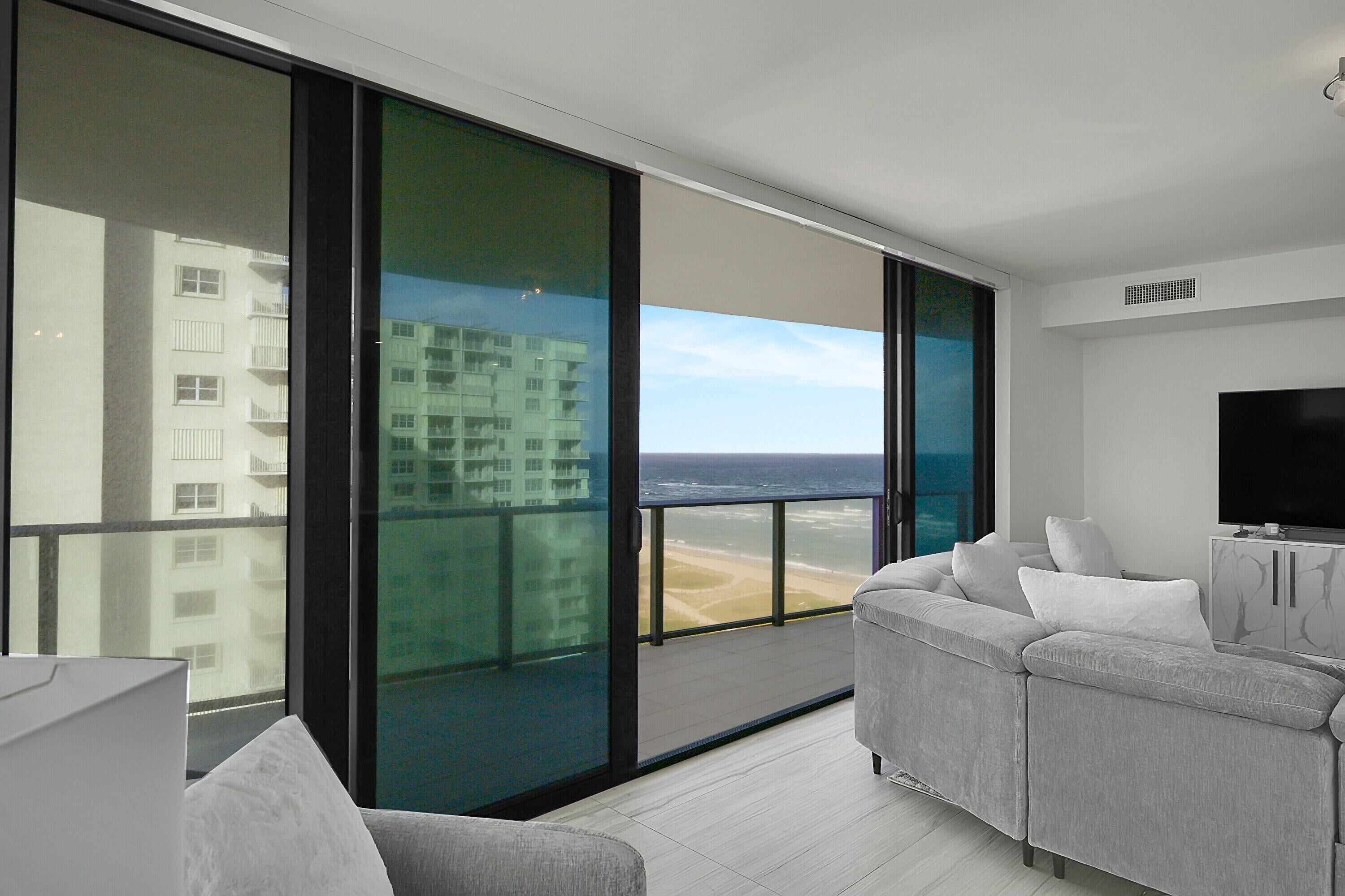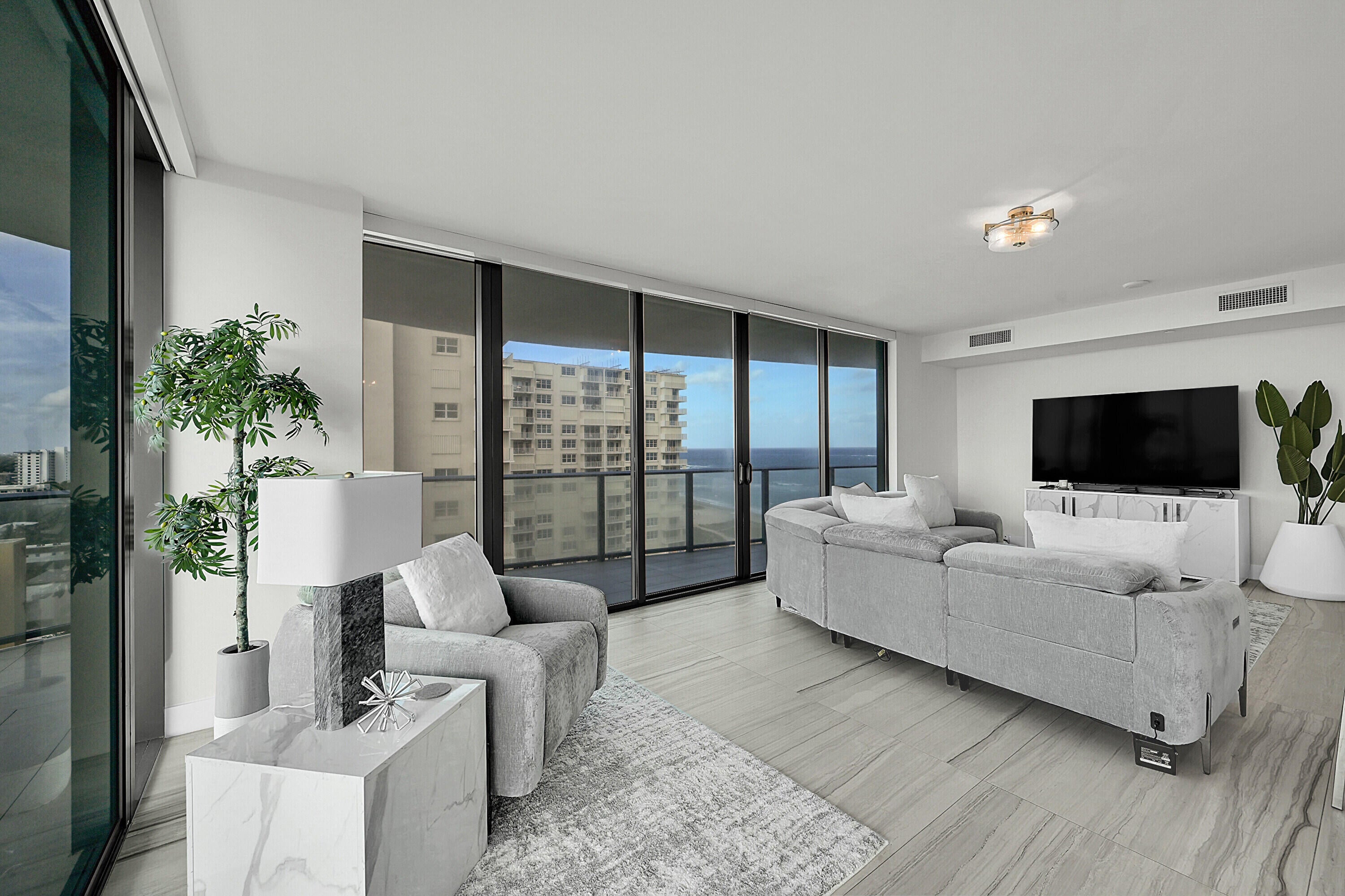 Stunning fully furnished corner condo with ocean views and beautifully curated interiors with high-end finishes. This exceptional residence features a 500 sq. ft. wraparound balcony, floor-to-ceiling windows, and breathtaking panoramic views of the ocean, Intracoastal, and city skyline. The open concept layout showcases sleek Italian contemporary design, quartz countertops, a waterfall kitchen island, and premium Miele and Sub-Zero appliances. Two primary suites offer serene retreats with inspiring vistas. Sabbia Beach amenities include private beach cabanas, full beach service, pool, spa, fire pit, outdoor grilling area, state-of-the-art fitness center, sauna, business center, 24/7 valet, and a private party room. Just pack your suitcases and live your dream life style.