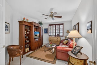 Easy living in Ballenisles. First floor condo in the Palms. Turnkey. 2 bedroom , den/ office., + impact glass enclosed lanai. Office/den can easily be converted to 3rd bedroom. Flowers, outside painting, roof all part of condo maintenance. Spacious living room, eat in-kitchen, formal dining room for entertaining. Master suite has walk in closets with built ins, separate shower & tub. Golf course view. Full golf purchas3 required. No wait list.