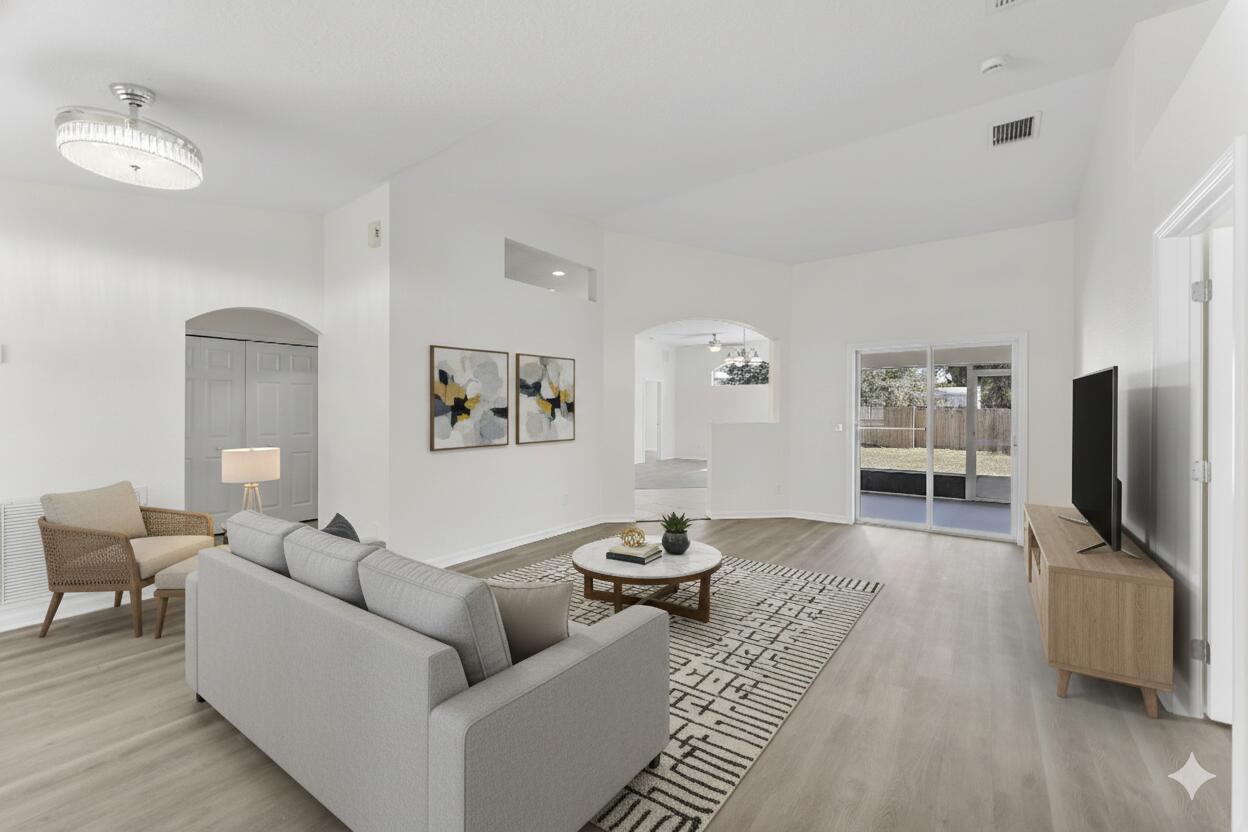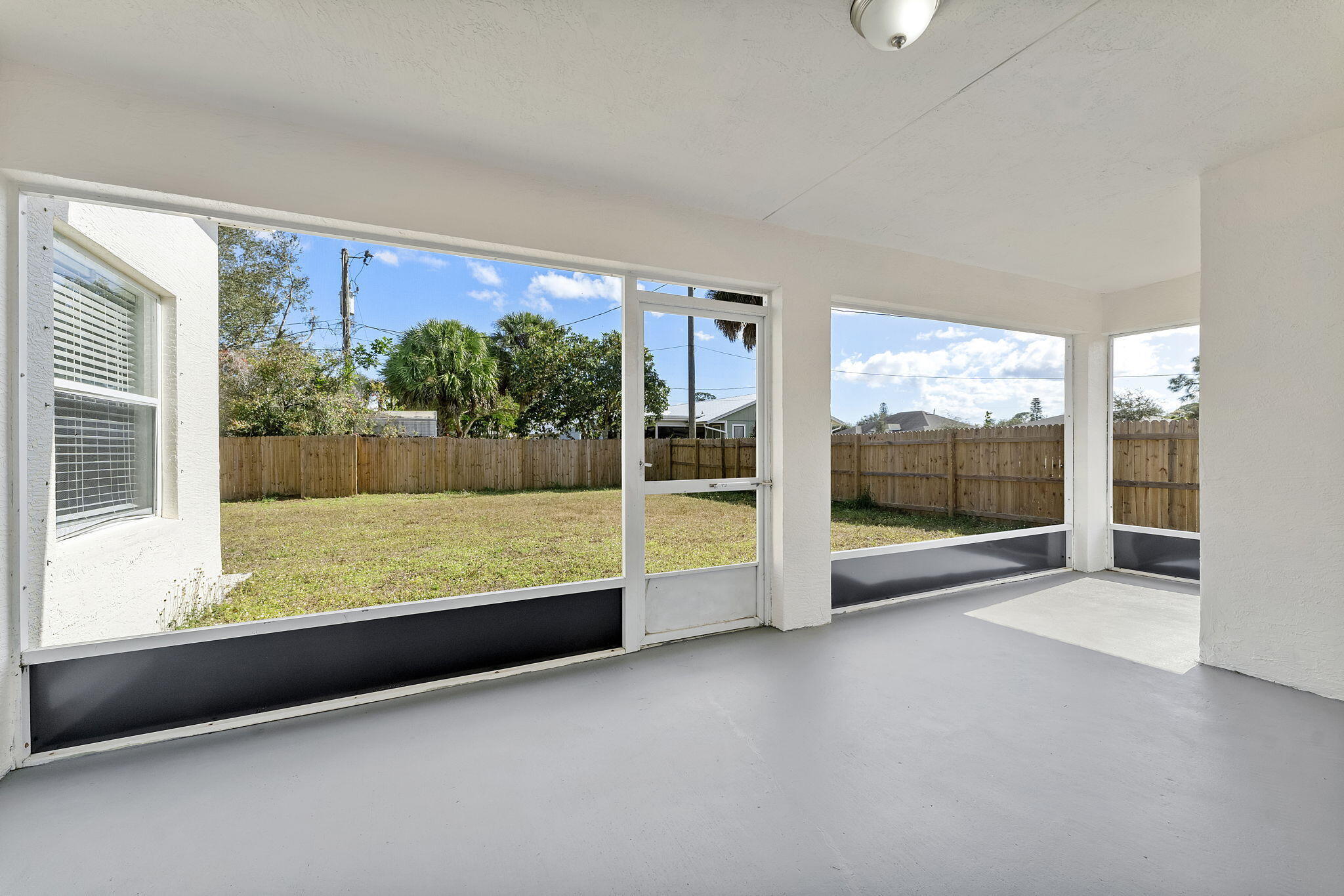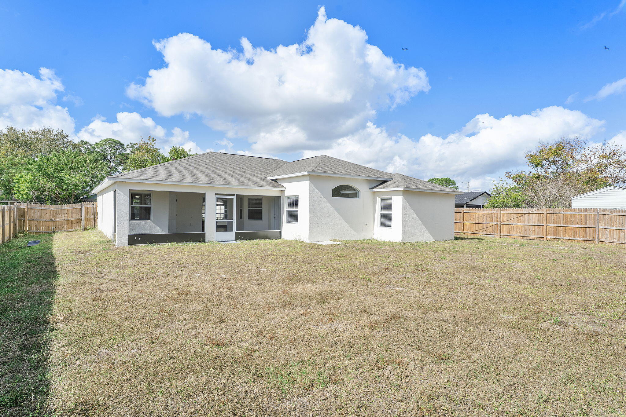 Welcome to this inviting 4-bedroom, 2-bathroom single-family home located in a quiet Port St. Lucie neighborhood. Boasting 1,840 square feet of living space, the interior features a desirable split bedroom floor plan that offers privacy and functionality. The heart of the home includes a well-equipped kitchen with a pantry, refrigerator, and microwave. Retreat to the primary suite, complete with a walk-in closet and a relaxing Roman tub. Step outside to enjoy the Florida weather on your private screened patio, overlooking a spacious fenced backyard perfect for pets or outdoor activities. Additional conveniences include a 2-car garage, central air conditioning, and an in-unit washer and dryer.