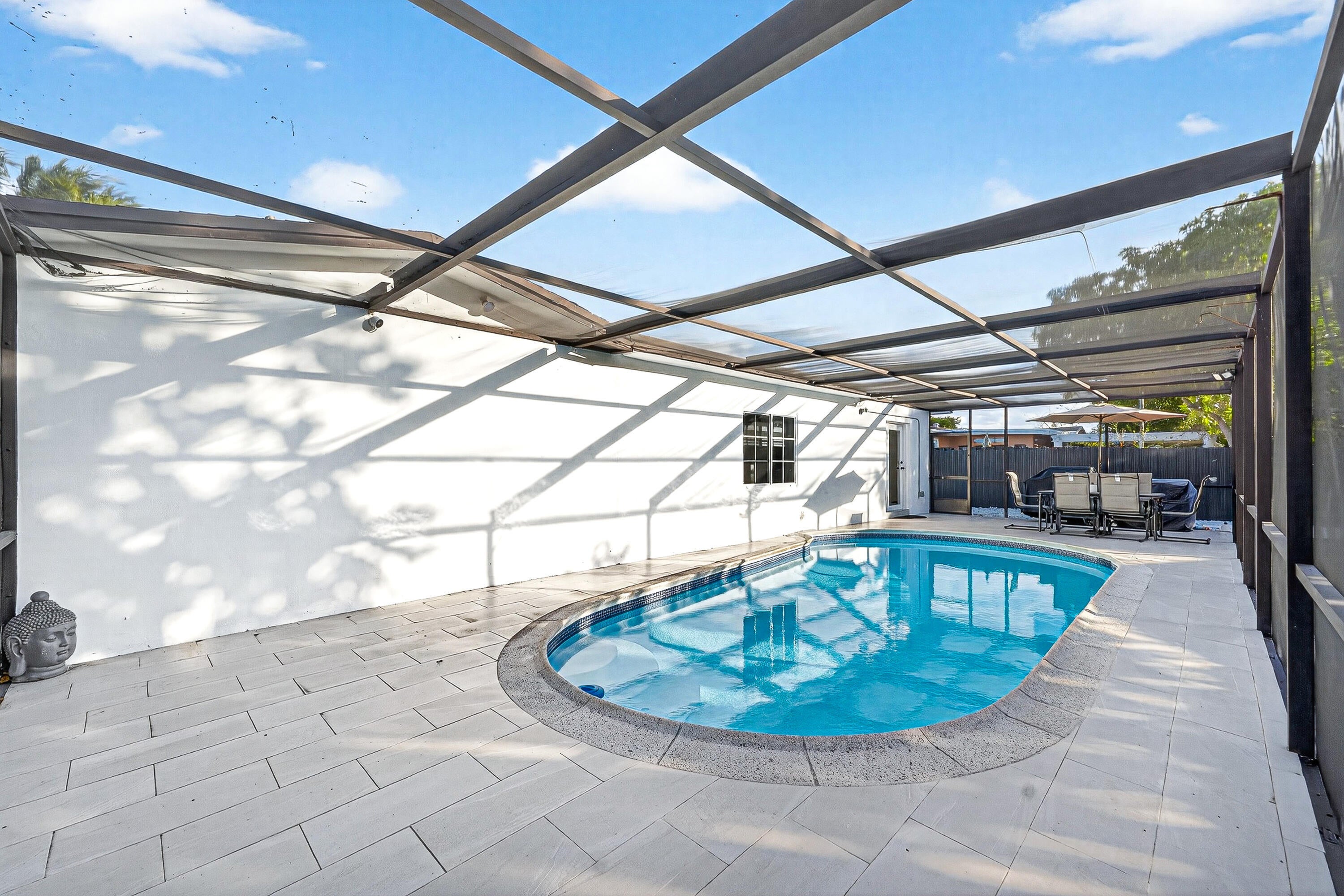 Discover this stunning 4-bedroom, 2-bath home that perfectly blends comfort and modern style. The open layout features a beautiful kitchen, sleek vinyl flooring throughout, and a bright Florida room offering additional living space. Recent upgrades include new modern blinds, new ceiling fans, and a new backyard stone feature that enhances outdoor enjoyment. Relax or entertain year-round with a screened-in pool. Major improvements provide peace of mind, including a 2023 roof with permit, 2019 A/C, and no popcorn ceilings for a clean, contemporary look. This move-in-ready home is a must-see!