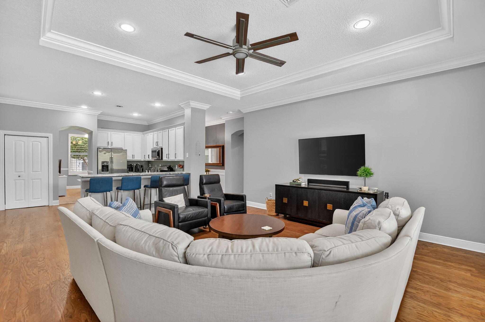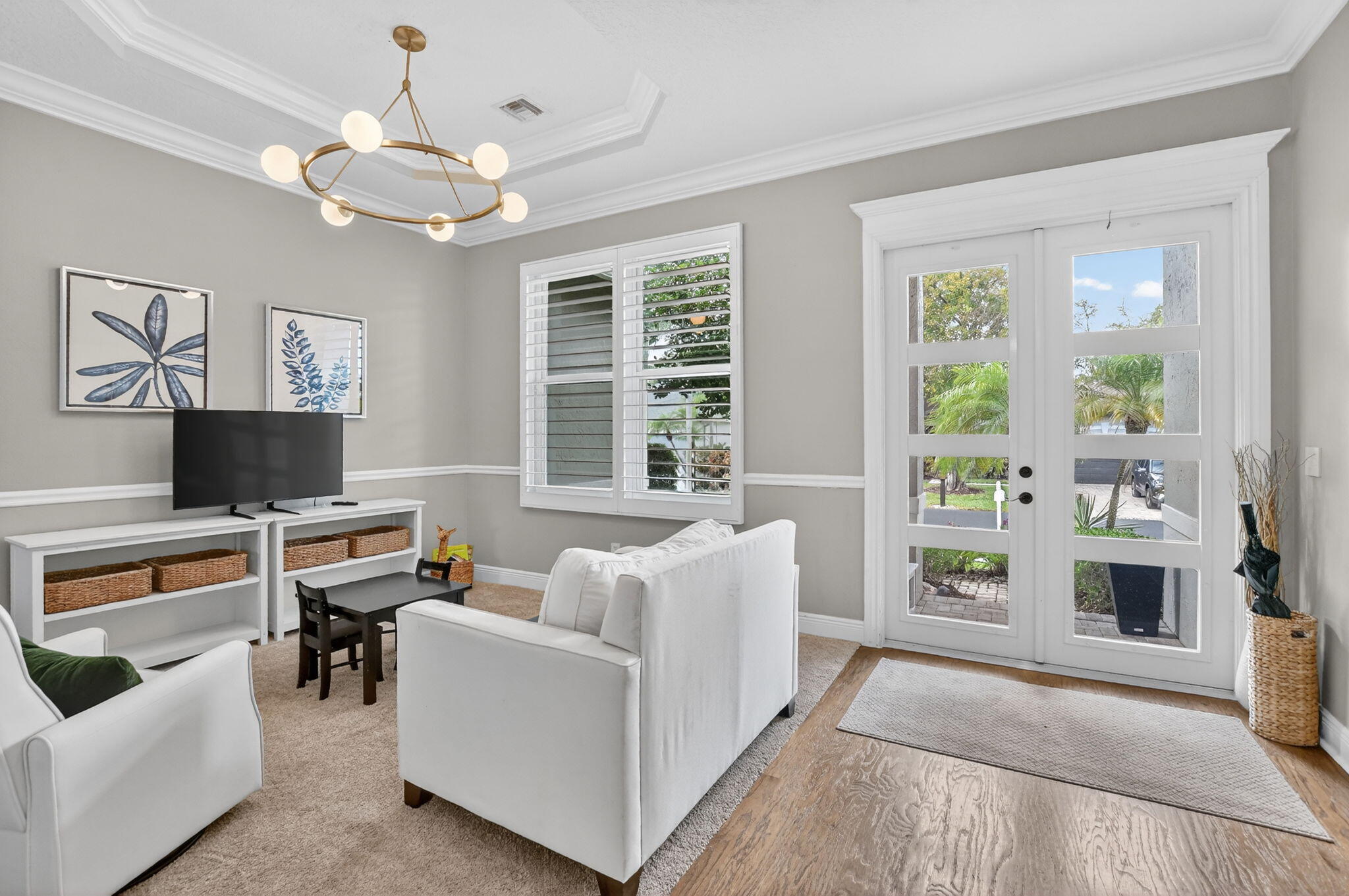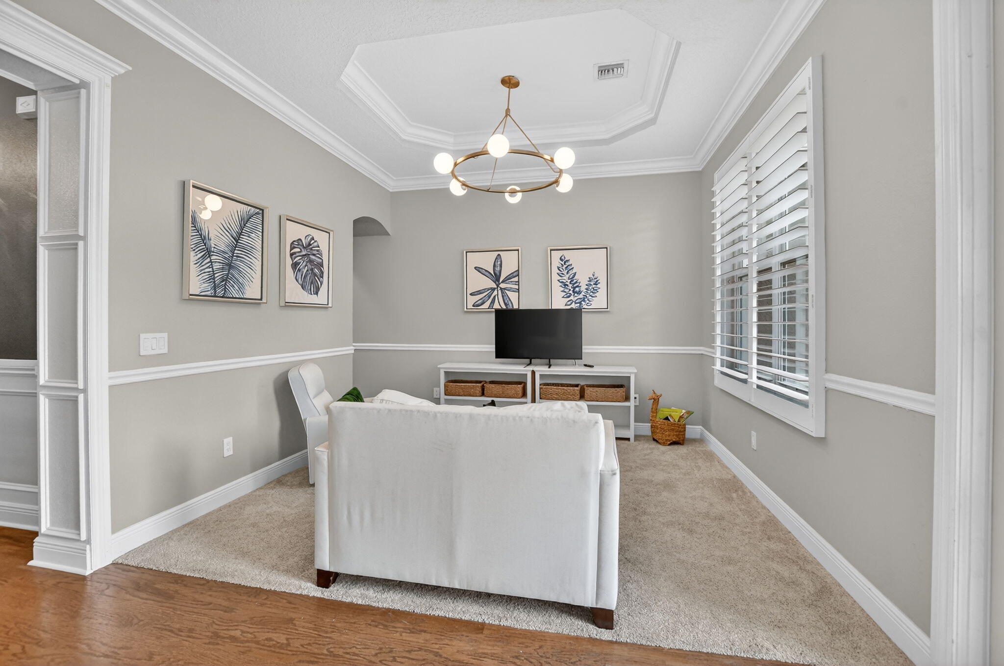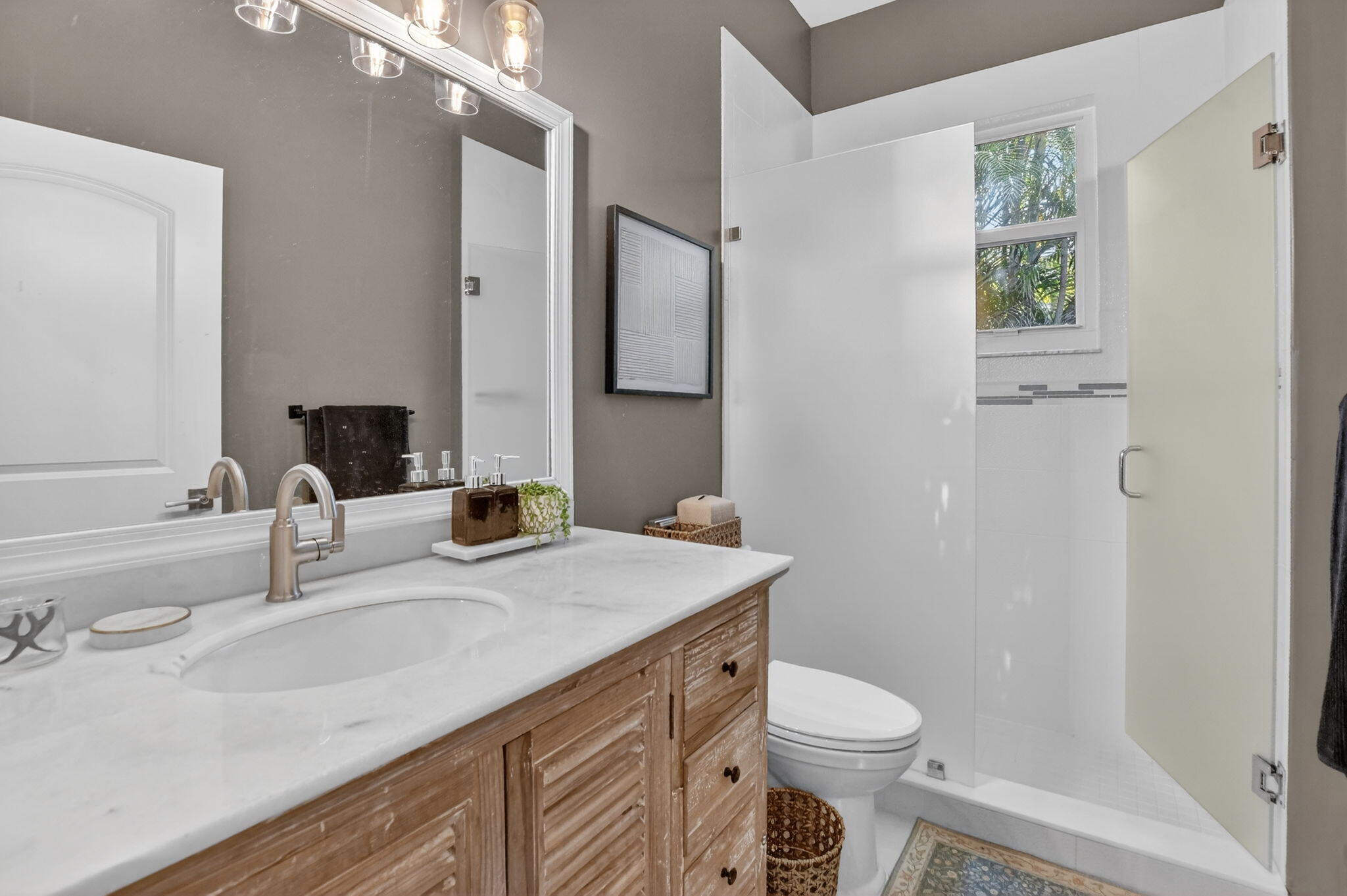 Nestled in the quaint gated community of The Hills at Lake Eden, this beautifully updated 4-bedroom pool home offers the perfect blend of comfort and coastal convenience. Located just 2 miles from the beach and moments from the shops and restaurants of famed Atlantic Avenue, the location is hard to beat. A gracious formal entry welcomes you into the living room, while the home opens up to a spacious family room, dining area, and open-concept kitchen ideal for everyday living and entertaining. The split-bedroom floor plan provides excellent privacy. The primary suite features tray ceilings, sliders to the backyard, and a stunning spa-like bath with dual vanities, a freestanding soaking tub, and a glass-enclosed shower.Wood flooring, brand-new carpet, marble countertops, and top-of-the-line appliances are just a few highlights of the recent renovation. Step outside to your private backyard retreat, complete with a newer heated, resort-style pool featuring a sun shelf and water features. The outdoor space also offers a large covered patio and low-maintenance turf areas perfect for relaxing or entertaining year-round.