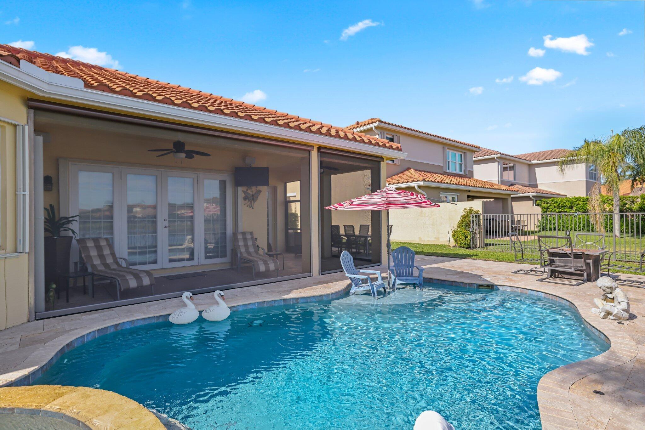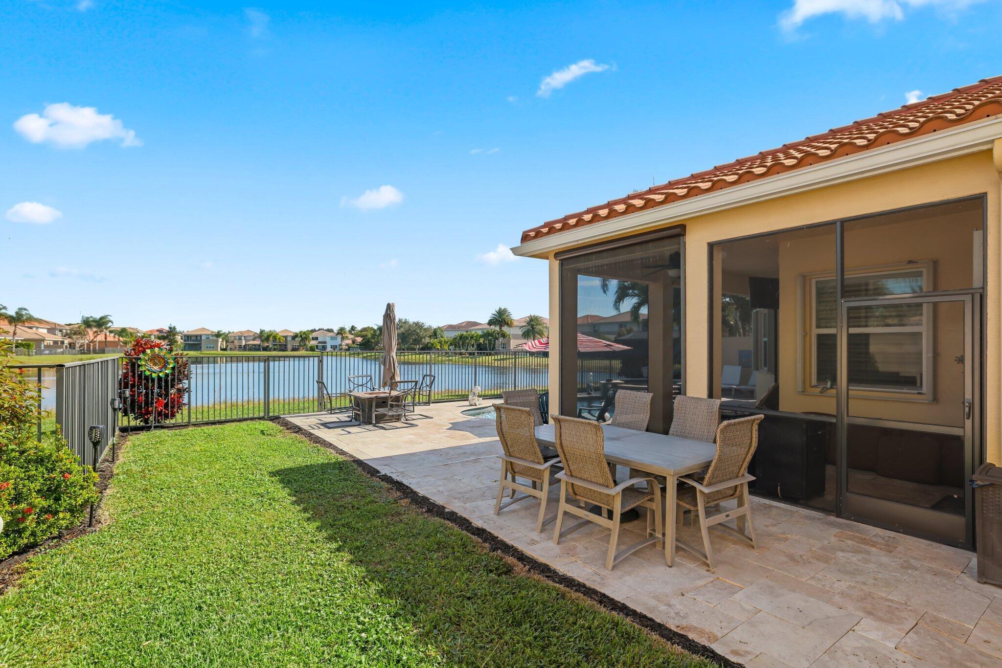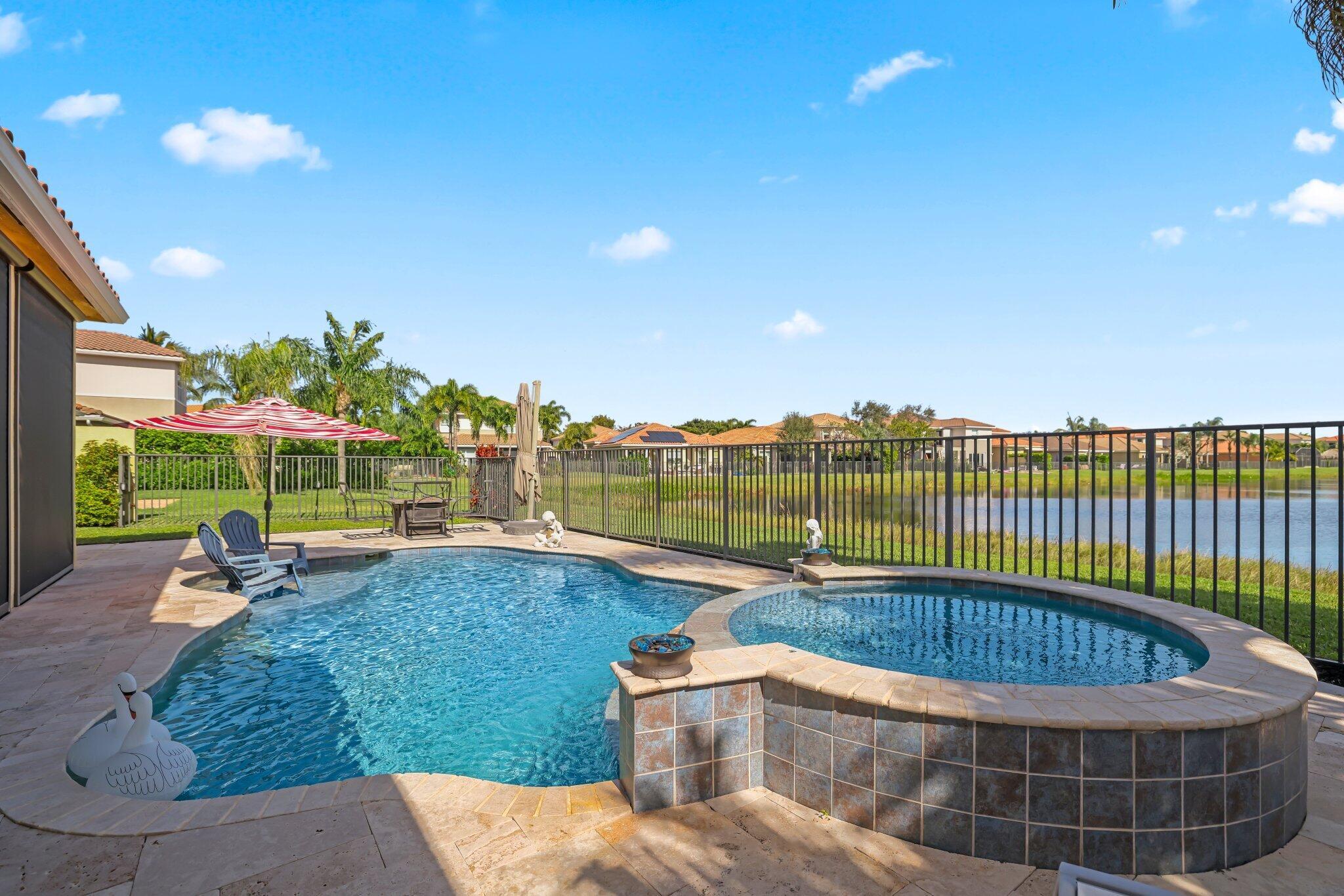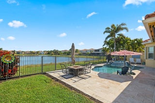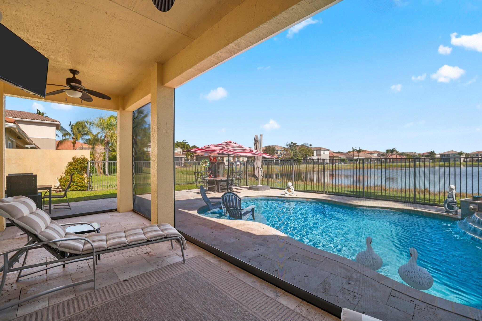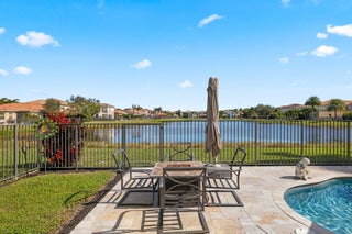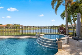 Experience refined lakefront living in this exquisite Bimini model located in the prestigious Canyon Trails community. Thoughtfully renovated and impeccably maintained by the original owners, this elegant single-story residence offers 3 bedrooms, 3 bathrooms, and a private den. Set on a premier expansive lakefront lot, the home showcases serene sunrise views complemented by a heated pool and spa, creating a true private retreat. Notable features include accordion hurricane shutters, Phantom retractable outdoor screens, new porcelain tile flooring throughout, and a beautifully redesigned open-concept kitchen ideal for both everyday living and entertaining.