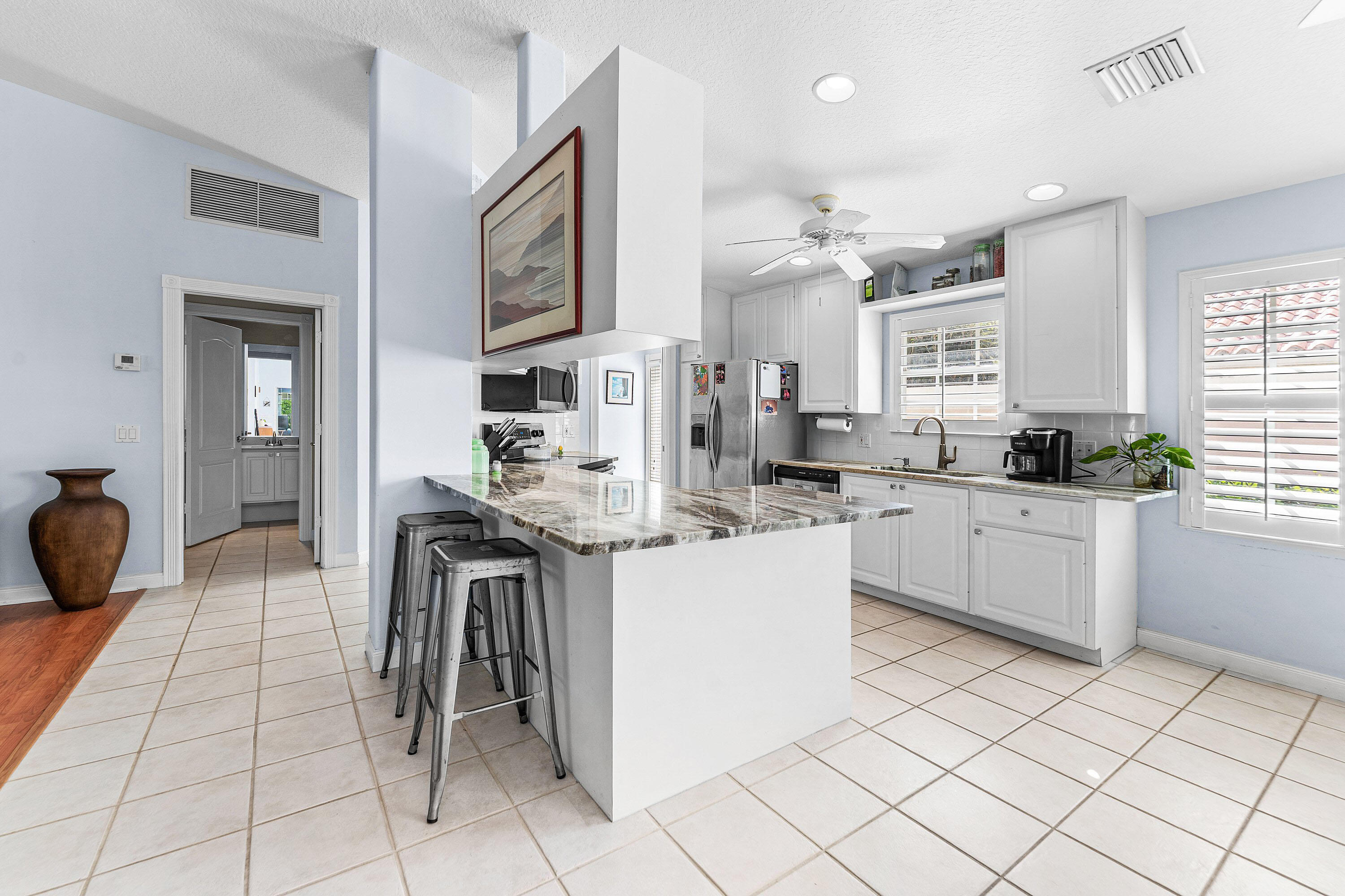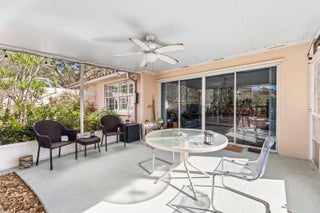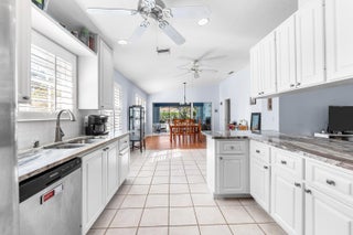 Immaculate two-bedroom, two-bath updated villa with a two-car garage, ideally situated within the resort-style community of Riverwalk. This sought-after split-bedroom floor plan offers an updated open kitchen featuring special select stone countertops, custom white cabinetry, stainless steel appliances, and a welcoming breakfast bar--designed to keep you connected to everyday living and entertaining. The dining area flows seamlessly into an extended flex space, ideal for a den or home office, all overlooking a covered, screened patio with tranquil lake views. The spacious living room is enhanced by high ceilings, creating a bright and inviting atmosphere. A well-appointed laundry room with cabinetry, sink, and additional storage is conveniently located just off the garage.....Additional features included extended floor plan, roof replaced 2024. Riverwalk residents enjoy an exceptional lifestyle with resort-style amenities including a café and restaurant, three swimming pools, tennis and pickleball courts, and an active social calendar. Ideally located near fine dining, entertainment, and world-class golf, this villa offers both comfort and convenience in a beautifully maintained setting.