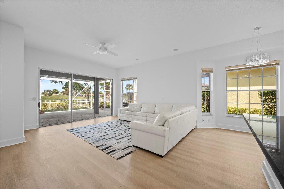 Welcome to 10375 Osprey Trace, a distinguished residence located in the prestigious community of Ibis Golf and Country Club. This exceptional property offers a harmonious blend of modern design and tranquil living, perfectly situated within a country club community renowned for its resort-like amenities.Spanning 2,843 square feet, this home features an open floor plan that seamlessly integrates living spaces, creating an inviting atmosphere for both relaxation and entertainment. The main floor hosts the primary bedroom suite and a second bedroom, while an additional bedroom and a versatile loft area offer ample space for family or guests upstairs.The home has been thoughtfully updated with new flooring throughout, complemented by modern light fixtures that enhance its contemporary appeal. The updated bathrooms feature new vanities, adding a touch of elegance to the daily routine. The kitchen is equipped with stainless steel appliances, catering to the needs of any culinary enthusiast. Step outside to discover a screened-in patio, perfect for enjoying Florida's beautiful weather while overlooking the serene golf course views. The fenced yard offers additional space for outdoor activities. This property is a blank canvas, flooded with natural light, and ready for you to personalize and make your own. Located within a community that offers a wealth of amenities, residents can enjoy access to golf courses, clubhouses, and recreational facilities, all designed to enrich your lifestyle. 10375 Osprey Trace is more than just a home; it is an opportunity to experience the best of living in the Palm Beaches. Don't miss the chance to make this exceptional property your own. Schedule your showing today.
