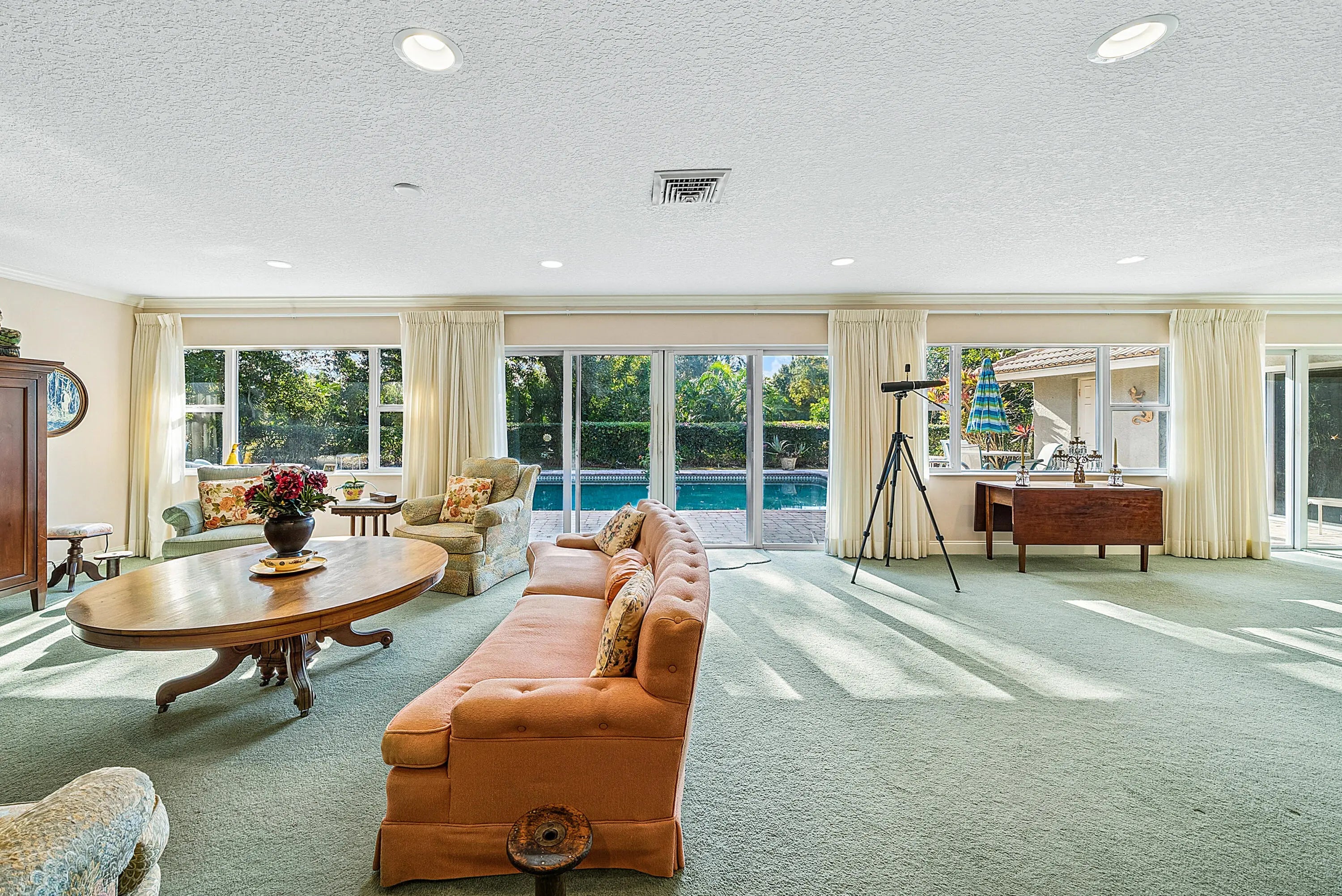 WOW! Endless possibilities await at 416 S Country Club Drive, ideally located in the heart of the non-HOA golf community of Atlantis. Situated on an expansive ~0.40-acre lot & perfectly positioned on the golf course, an oversized paved driveway welcomes you to a double-door entry. The open-concept layout, enhanced by wall-to-wall windows and sliders, creates a bright, airy atmosphere throughout your 3777 Liv SF. This residence offers the rare advantage of two primary retreats - One features a sprawling bedroom with ample space for a sitting area, office, or home gym, along with an oversized walk-in closet. The second primary is positioned on the opposite side of the home, poolside, complete with a cabana bath and direct slider access to the backyard.