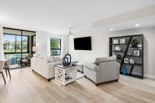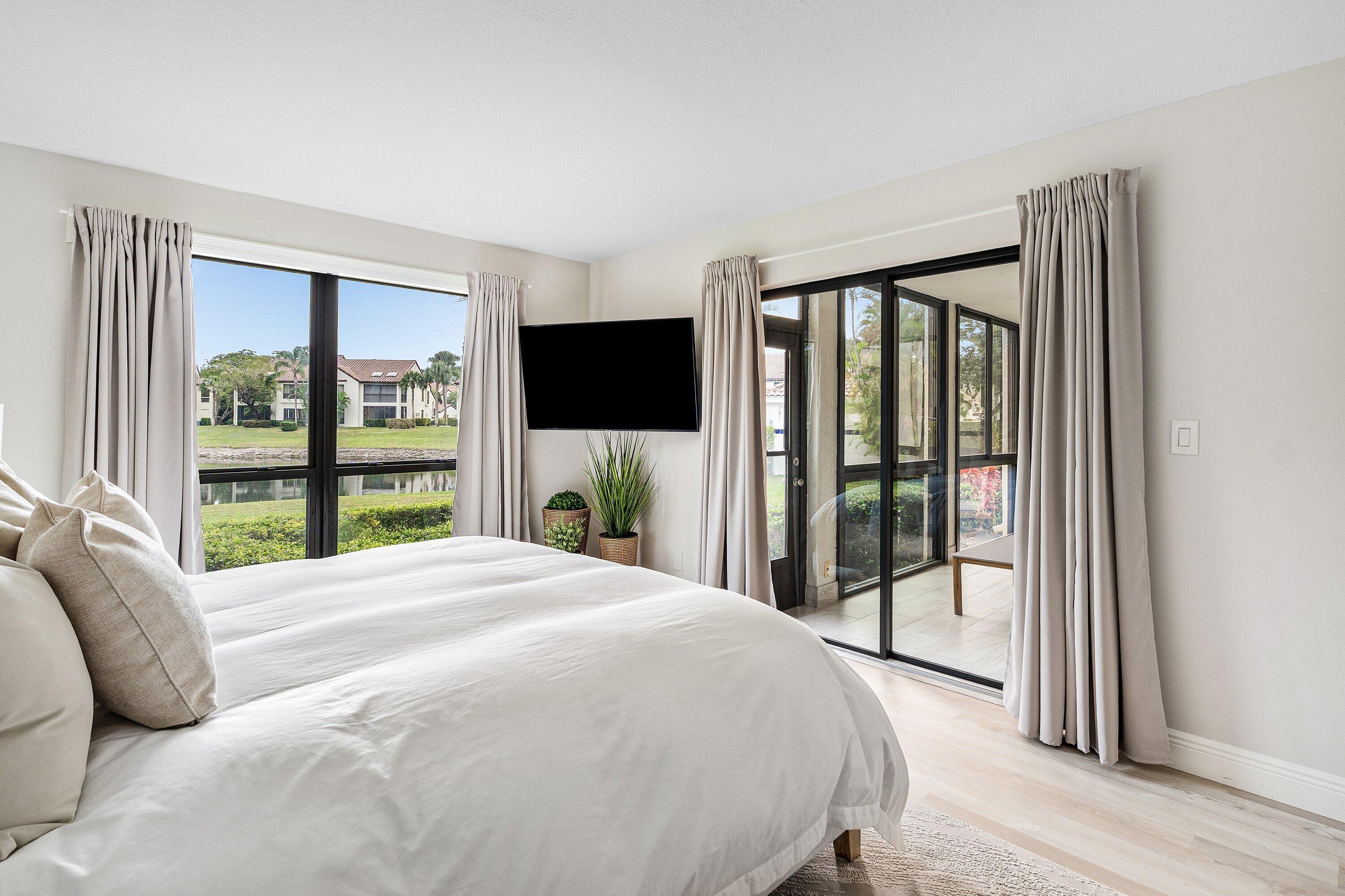 Welcome to your dream oasis at El Viento of Boca Pointe, where luxury meets tranquility in this stunning 1st floor condo. Newly renovated in 2024, this gem boasts an open-concept design that seamlessly blends style & comfort, making a perfect retreat of modern living Step inside to discover 3 spacious bedrms & 2 full baths all adorned with elegant vinyl flooring. The heart of the home features a sleek kitchen complete with quartz countertops, pristine white cabinets & SS appliances. The primary bdrm is a sanctuary of light, featuring fl to ceiling windows w views of the serene lake outside.Unwind in the glassed-in sunroom while enjoying the sites of S. Fl. Guardgated 24/7 for peace of mind. NON MANDATORY membership gives you the flexibility to enjoy all Boca Pt w/o pressure of commitment.Steps from the community pool Boca Pointe is centrally located!