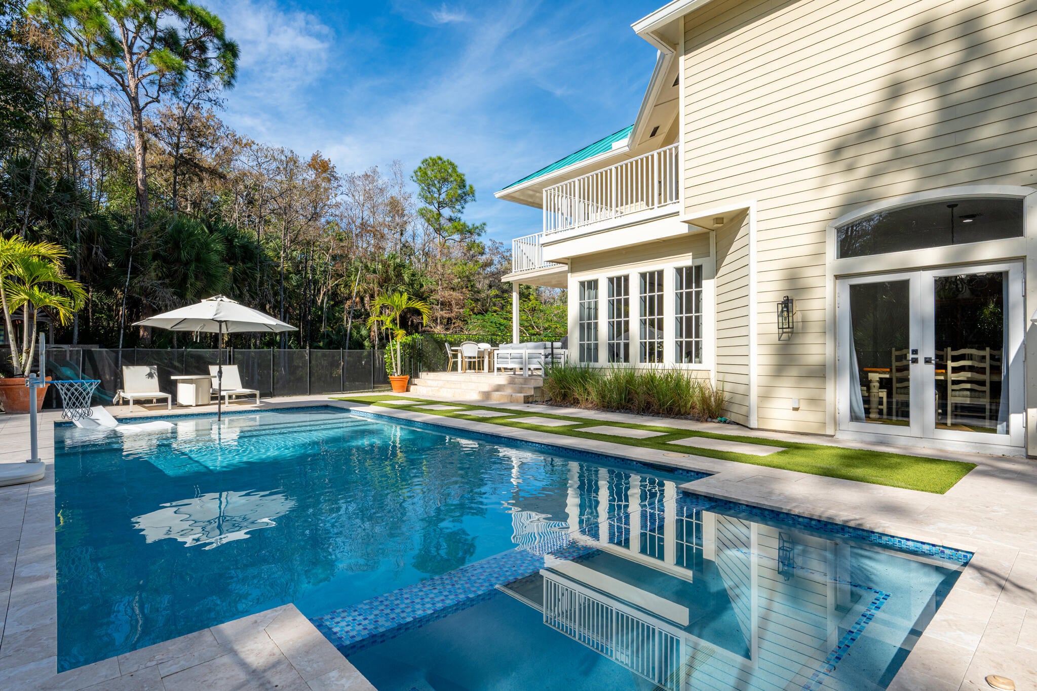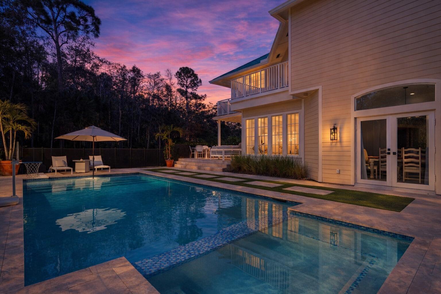 Tucked away on 5 beautiful acres in the desirable Fox Trail equestrian community, this exceptional residence offers a rare blend of coastal inspired architecture, spacious living spaces, and a newly installed resort-style pool. Surrounded by natural beauty and mature trees, the property provides unparalleled privacy while delivering a lifestyle of comfort and effortless entertaining. Your own private sanctuary, just a short drive from top A-rated schools, popular dining, and the world-renowned Wellington International Polo Club.The home's striking exterior, featuring a metal roof and multiple balconies -- makes a memorable first impression. Inside, soaring ceilings, rich hardwood flooring, and an abundance of natural light create an open, airy atmosphere that feels both luxuriousand welcoming. This residence features three oversized bedrooms, each with walk-in closets, along with a massive bonus room ideal for a home theater, game room, gym, creative studio, or expansive home office. Every space has been meticulously maintained, reflecting pride of ownership and move-in-ready condition. The primary suite is a true retreat, showcasing a beautifully remodeled, spa-inspired bathroom and an extraordinary walk-in closet designed as an entire room, an exceptional and highly coveted feature. Designed for indoor-outdoor living, the home opens to a resort-style swimming pool with expansive patio areas complete with a travertine pool deck, perfect for entertaining or relaxing in complete privacy. Outdoor living spaces provide opportunities to enjoy Florida's year-round sunshine, whether hosting gatherings or savoring quiet mornings surrounded by nature. An aerial view reveals the full scope of this private estate. Adding to the property's incredible functionality are two impressive 30x40 carports with 14-foot clearance, perfect for boats, RVs, and equipment. With water and electric hookups already in place, these structures can easily be transformed into horse barns or stalls making this property a dream for equestrian enthusiasts or anyone seeking space to create their ideal lifestyle. Beautifully cared for, architecturally distinctive, and truly one of a kind this property must be experienced to be fully appreciated.