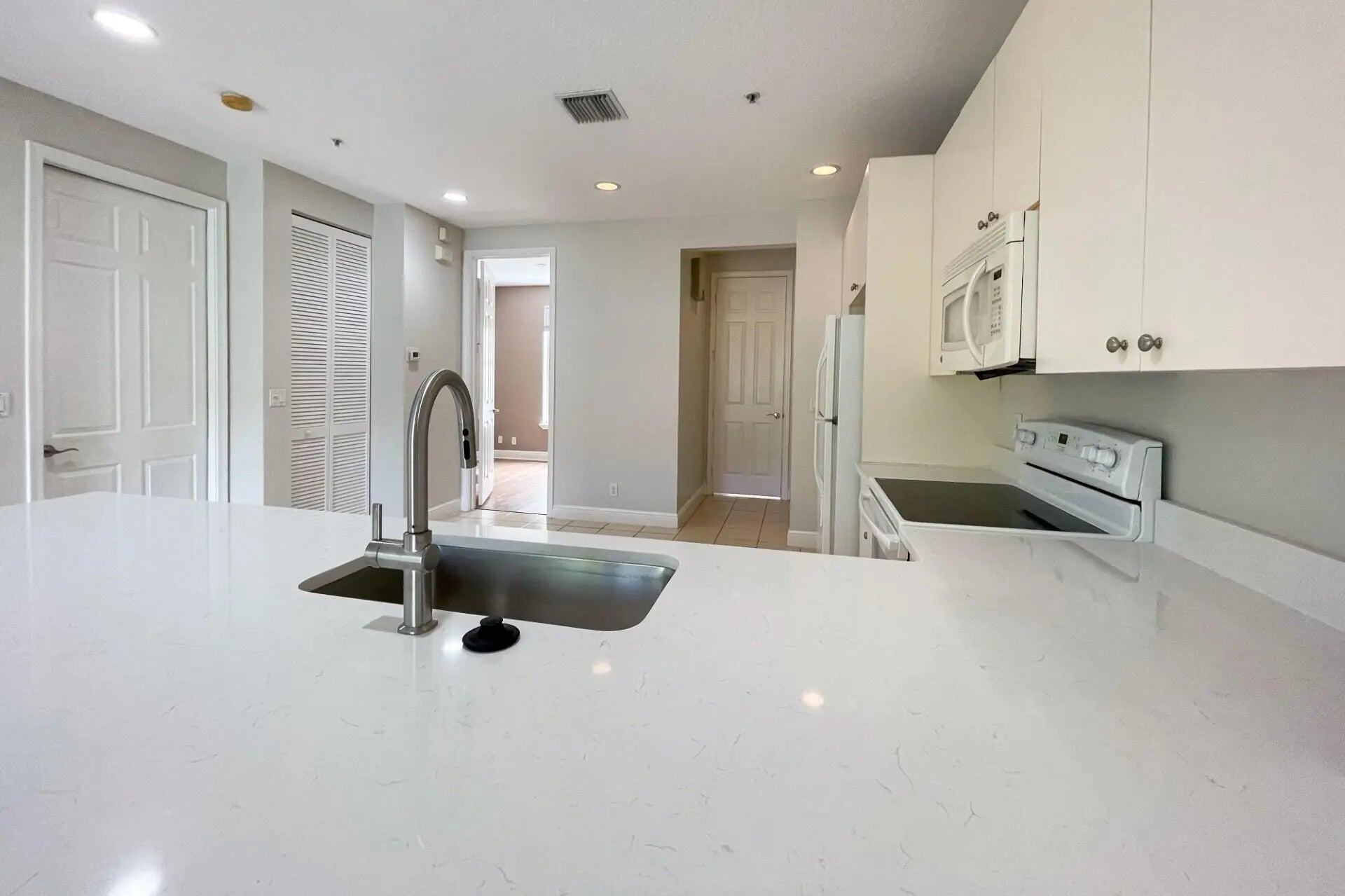 Carrara Miksa Quartz just installed! Quiet tree-lined streets surround this crisp, clean, bright & sunny, 3BR/ 3 1/2 BA + den open-plan townhome with plenty of privacy. Located in the quiet and highly sought-after community of Osceola Woods in Abacoa, this comfortable home has plenty of desirable features, such as private full baths in every bedroom, beautiful wood-look floors, tile, volume ceilings, massive windows, recessed lighting, and abundant storage space. The expansive living room and wide-open kitchen layout makes it perfect for entertaining, while the den can be used as a 4th bedroom with a half bath. Located within walking distance of the Abacoa Town Center, Roger Dean Stadium, and the Florida Atlantic University Jupiter campus.