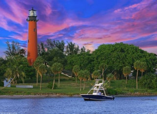 To mark the reef lying off the Jupiter Inlet, Congress in 1853 appropriated $35,000 to construct a lighthouse. At the top of the Jupiter Lighthouse, you can see the Loxahatchee River.