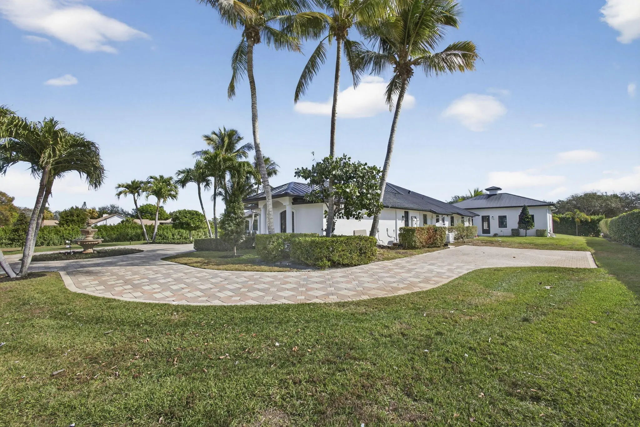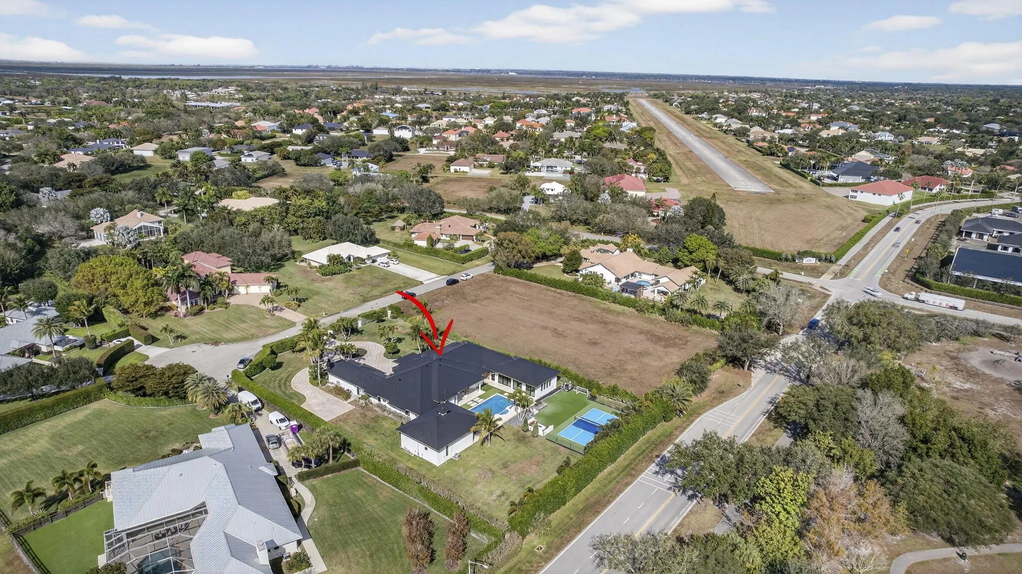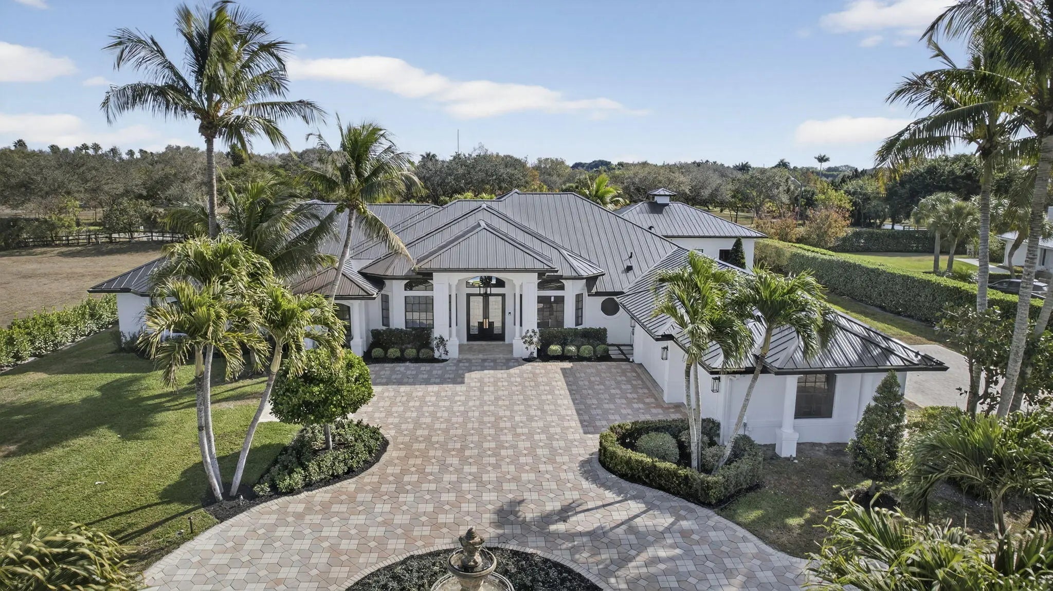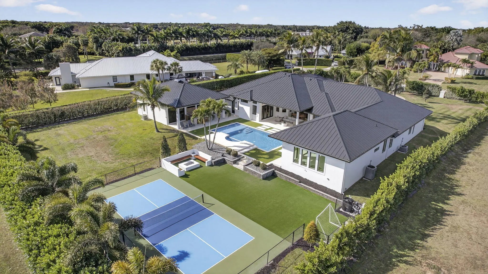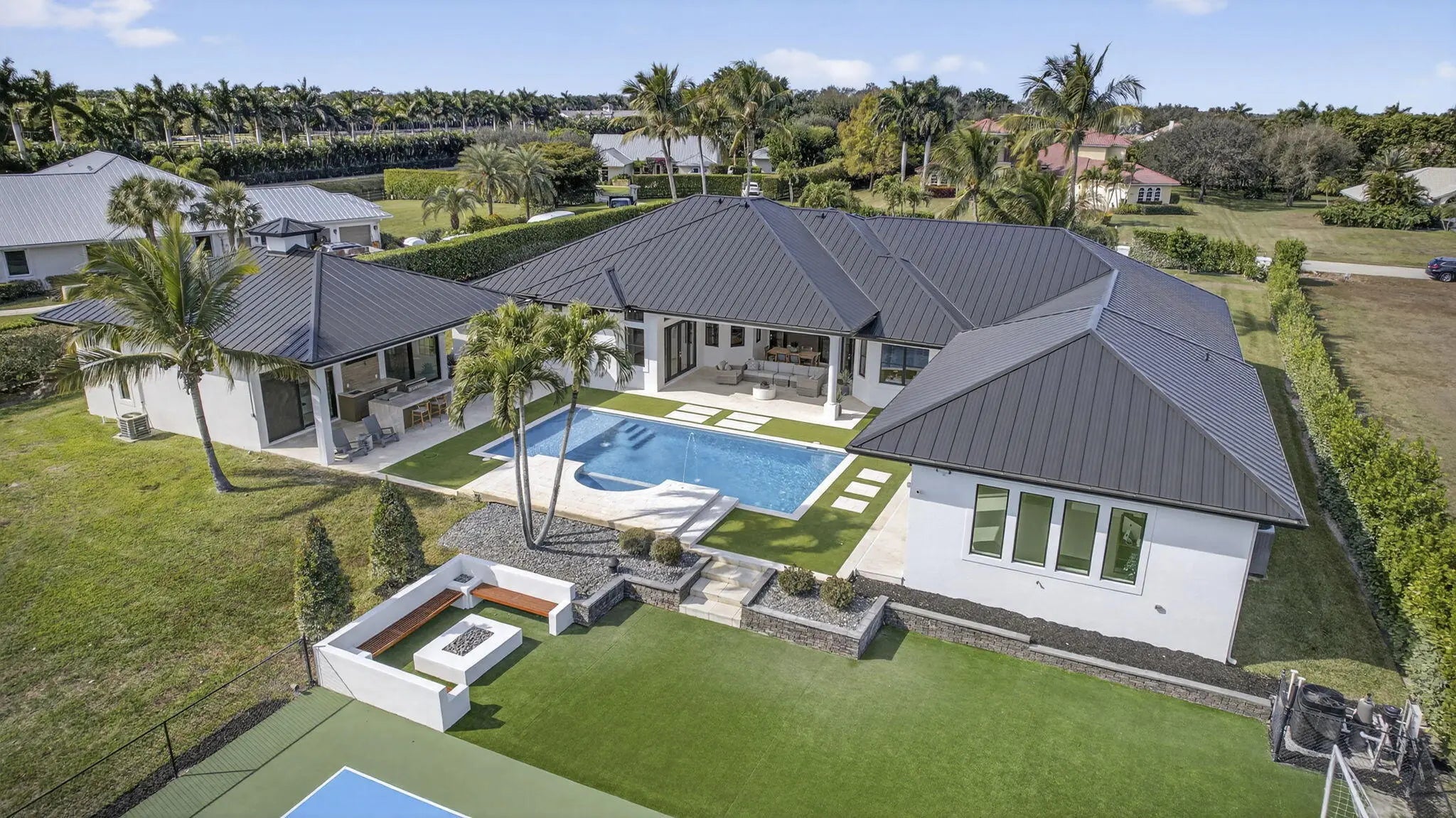 Fully renovated in 2025, this privately gated Aero Club estate offers approximately 6,500 SF of refined living space and over 8,300 SF total, with half the residence newly constructed and the remainder fully remodeled. Designed for elevated living, the home features a new metal roof, detached guest house, private pickleball court, media room, and a wellness suite with sauna, cold plunge, and gym. The chef's kitchen includes a butler pantry, gas range, and double laundry system. The primary suite offers a spa bath with steam room and walk-in closet. Executive office overlooks the heated pool. Hurricane-ready with a house generator powering the home and outdoor kitchen. Located near the entrance of the Aero Club with close proximity to horse farms, the dog park, and the private airport.