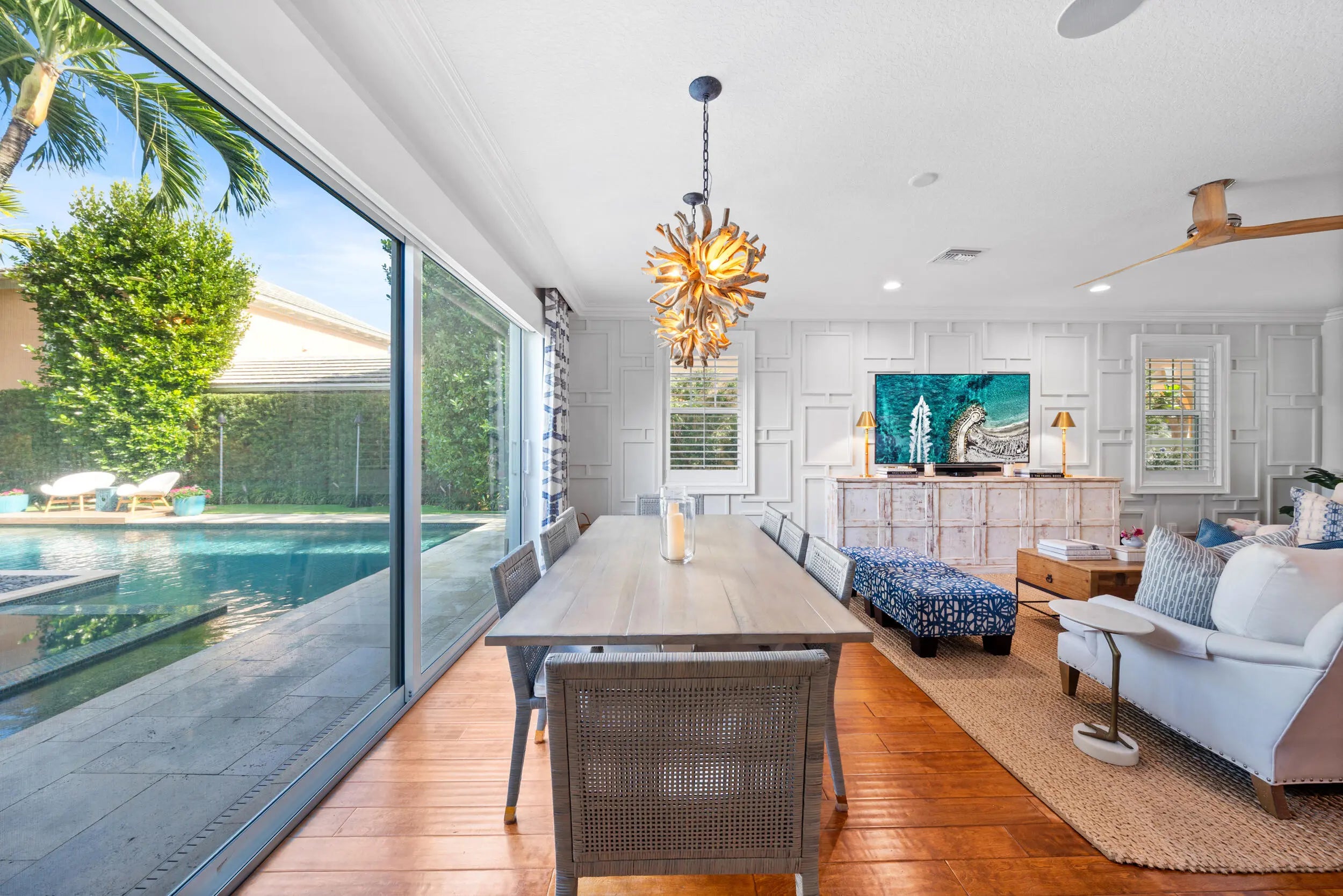 Located in the highly sought-after community of Martinique at Abacoa, this beautifully upgraded 3 bedroom + den, 2.5 bath, 2-car garage home offers the perfect blend of quality construction, designer finishes, and resort-style outdoor living in the heart of Jupiter. Engineered hardwood flooring flows throughout the home, adding warmth and continuity to the thoughtfully designed interior. Major recent improvements provide peace of mind, including a new 24-gauge mechanical seam metal roof with solar attic fan (Dec 2025), CGI Sentinel Series insulated impact windows and doors (2023), and a Marvin Coastline custom impact front door (2023). Comfort and efficiency are enhanced by a Trane A/C system with air handler (2021) and an infrared Reme Halo LED whole-home air purification system.