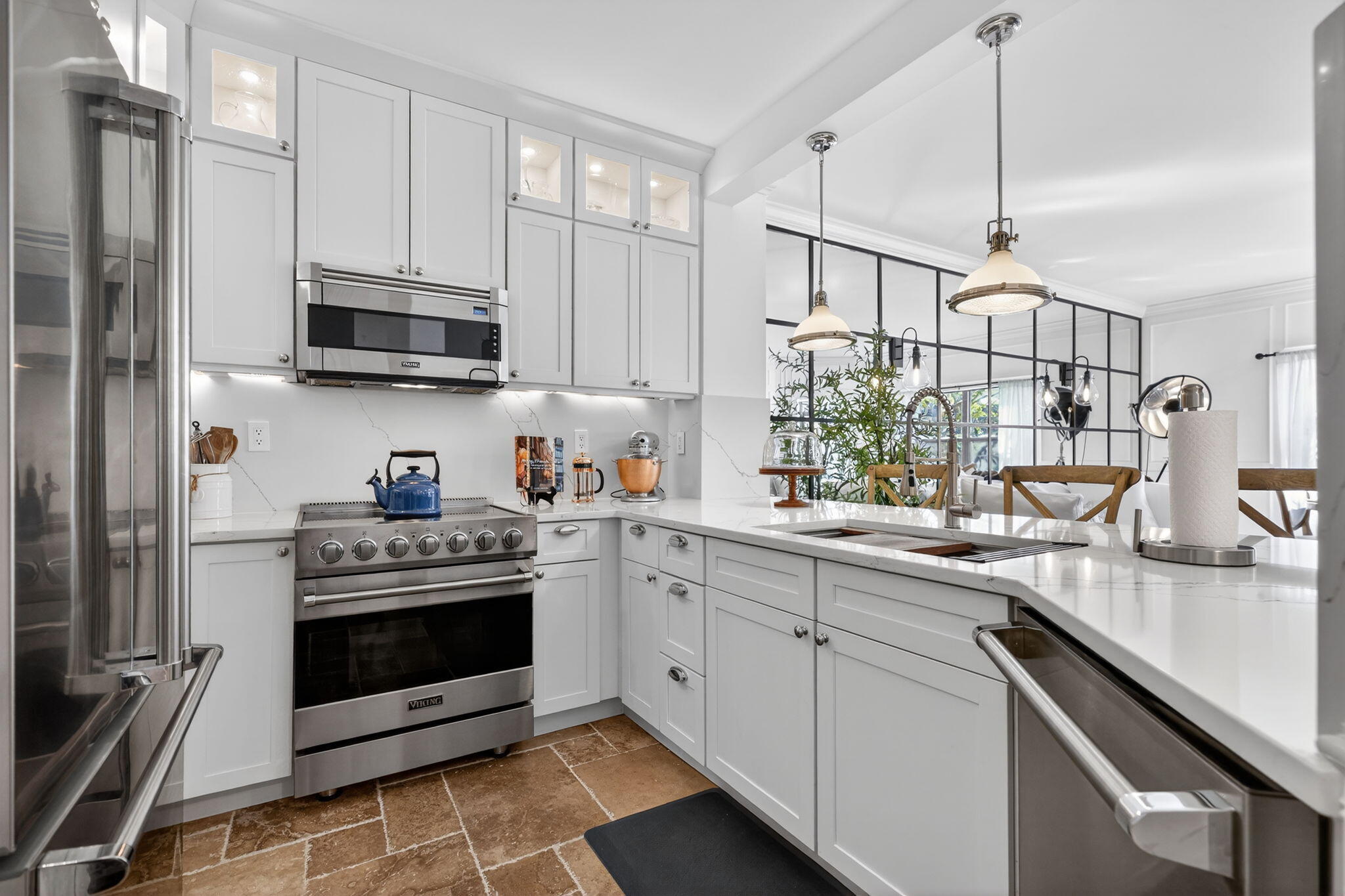 Stunning renovation of this 1BR/1BA 1st floor unit. Designer decorated with RH furniture including Cloud Sofa, European tumbled Versailles travertine flooring and is completely turnkey with everything from an air fryer to Nespresso machine. The fully equipped chef's kitchen has SS Viking appliances, KitchenAid mixer, vita mix, UV water filtration and Cesarstone countertops. Bathroom has private guest side entry, porcelain tile & marble top vanities. Thoughtful details throughout including extensive millwork, nickel fixtures & mirrored wall make this condo like no other. With beautiful views of the lake and sounds of the fountain it feels like you entered a spa. This spacious unit has loads of natural light, breezy screened in porch, washer/dryer in unit, open kitchen & bike storage.Ocean Trace is a gated community that offers two pools, clubhouse & gym. Enjoy a serene lake with a fountain and gazebo that cantilevers over the water. Ocean trace is a short proximity to beach access in Juno Beach, and conveniently located to world class shopping and restaurants.