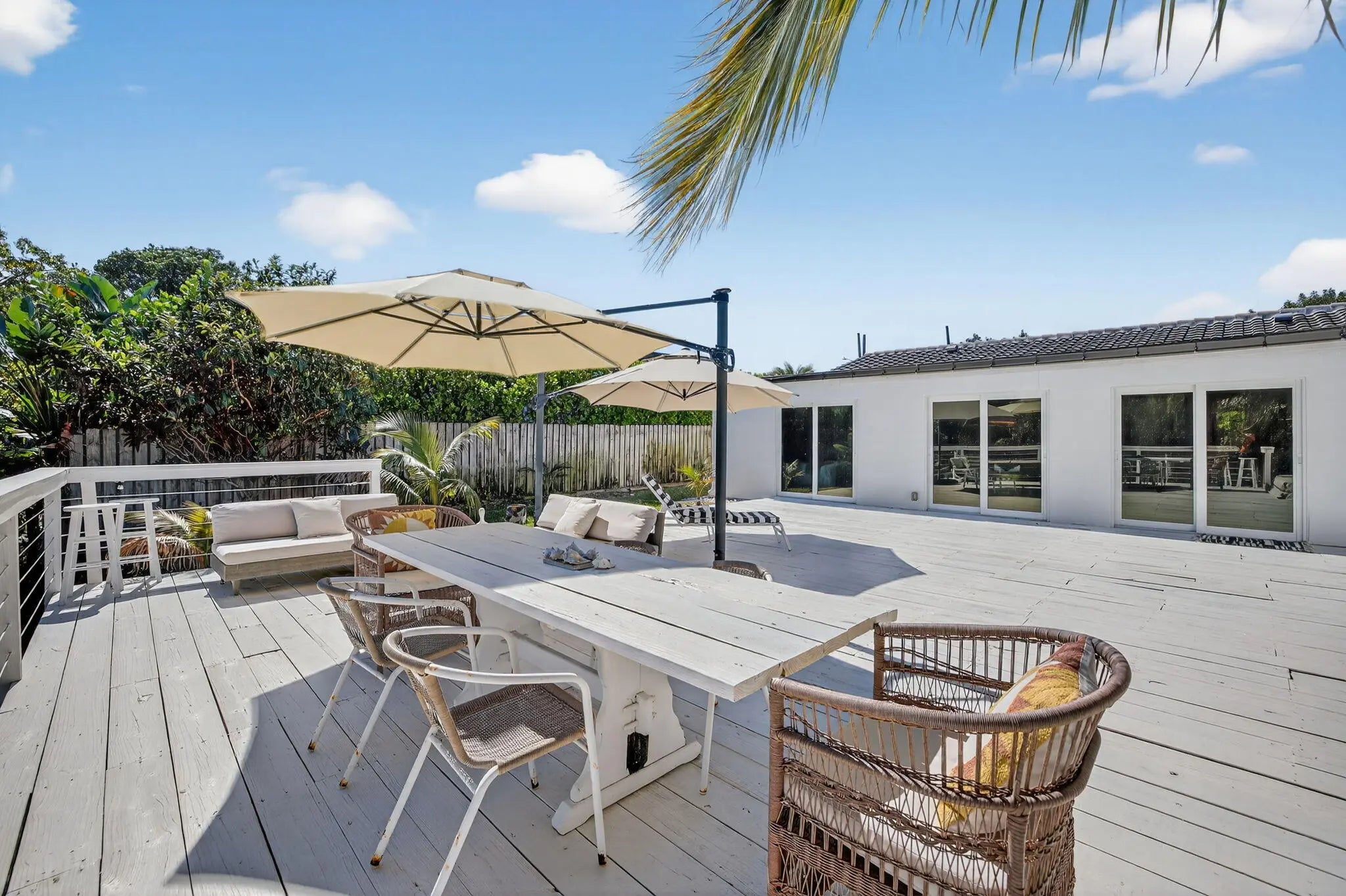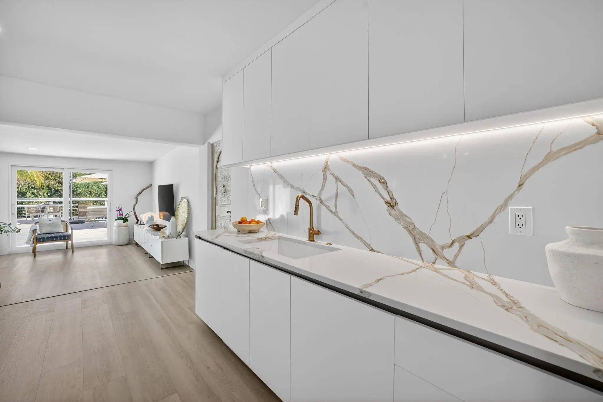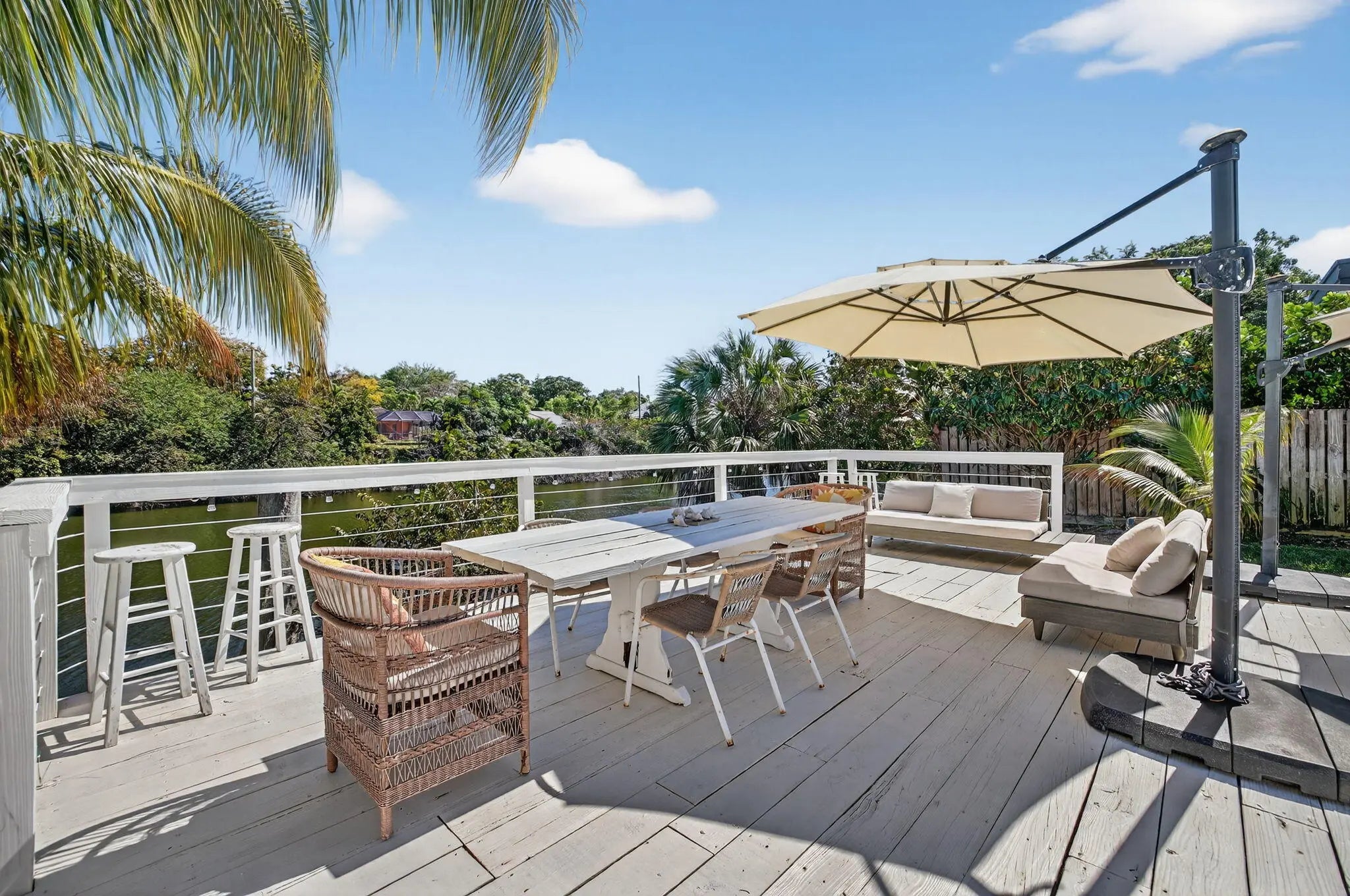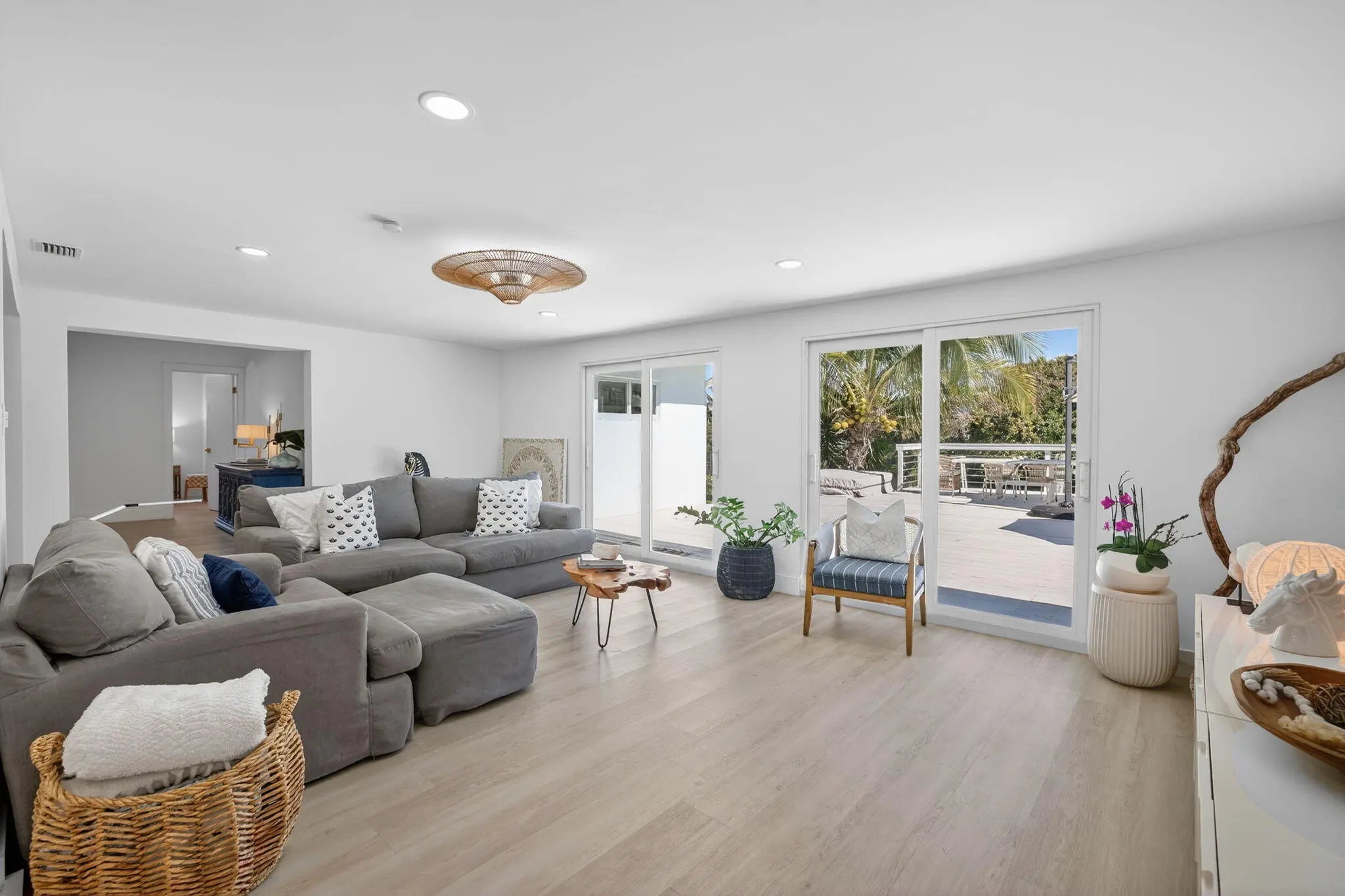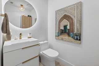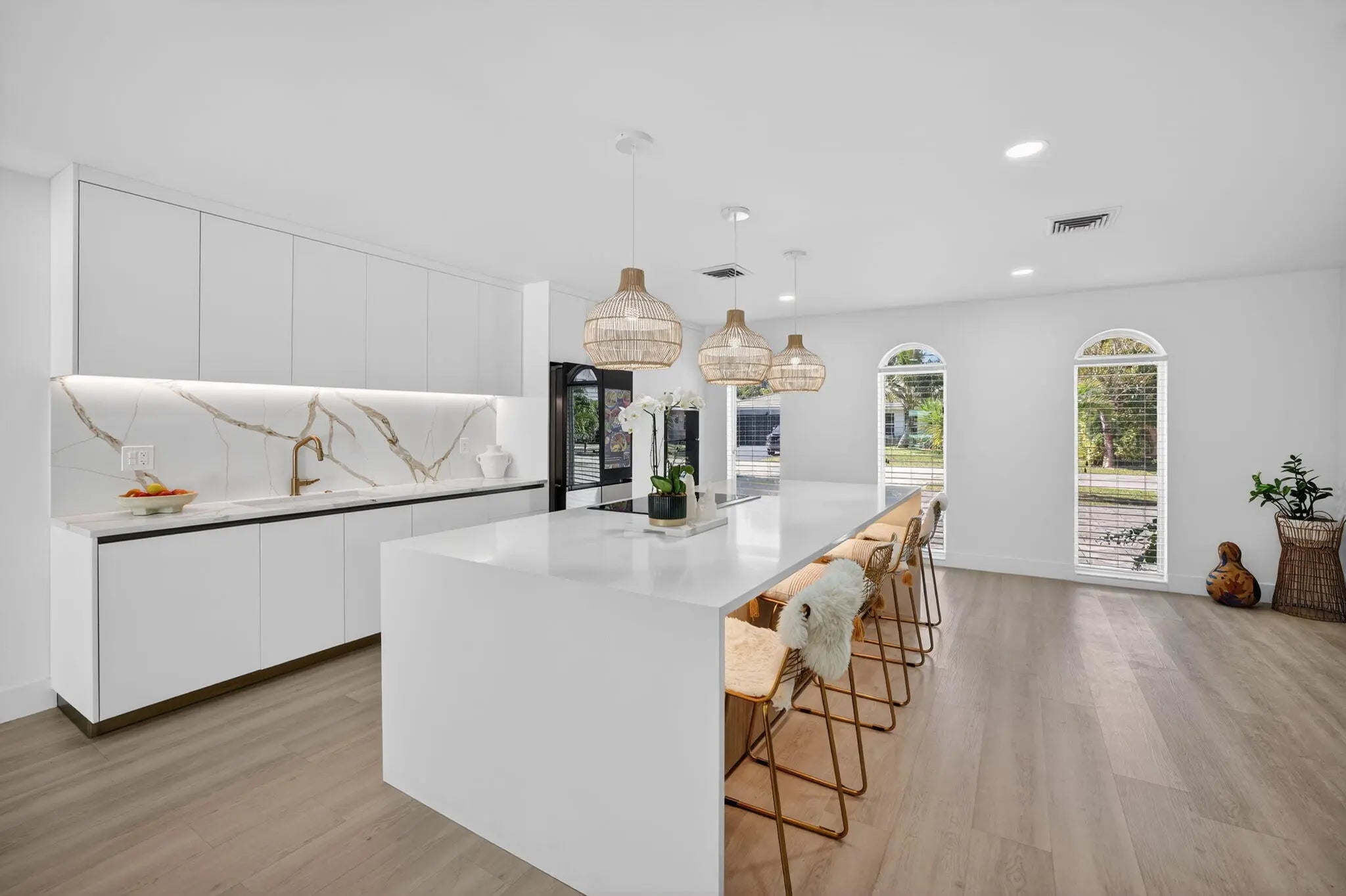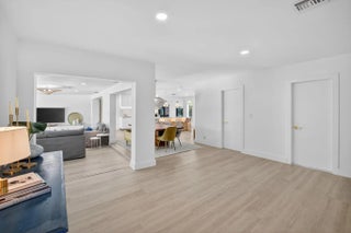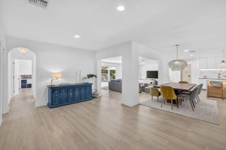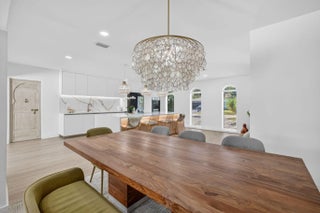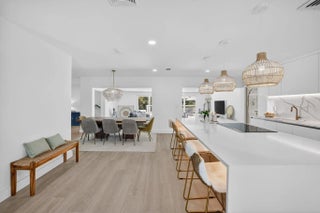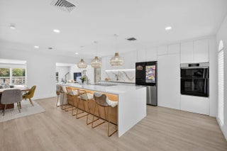 Exquisitely renovated 4BR/2.5BA coastal-modern lakeside residence in Conference Lakes Estates in the heart of east Boca. Impact glass and new roof. Wide-plank wood-look luxury vinyl floors lead to a showstopping chef's kitchen with waterfall-edge Samsung smart appliances, hidden pantry, custom European soft-close cabinetry, and striking quartz countertops. Statement lighting enhances open dining and an expansive great room with dual sliders to a stunning lakefront deck. The primary retreat stuns with a Moroccan entry door, custom closet room, and spa-inspired bath. Tropical grounds, room for a pool, and a 2-car garage.